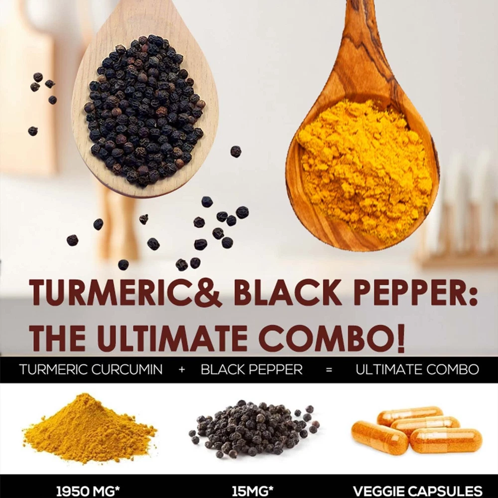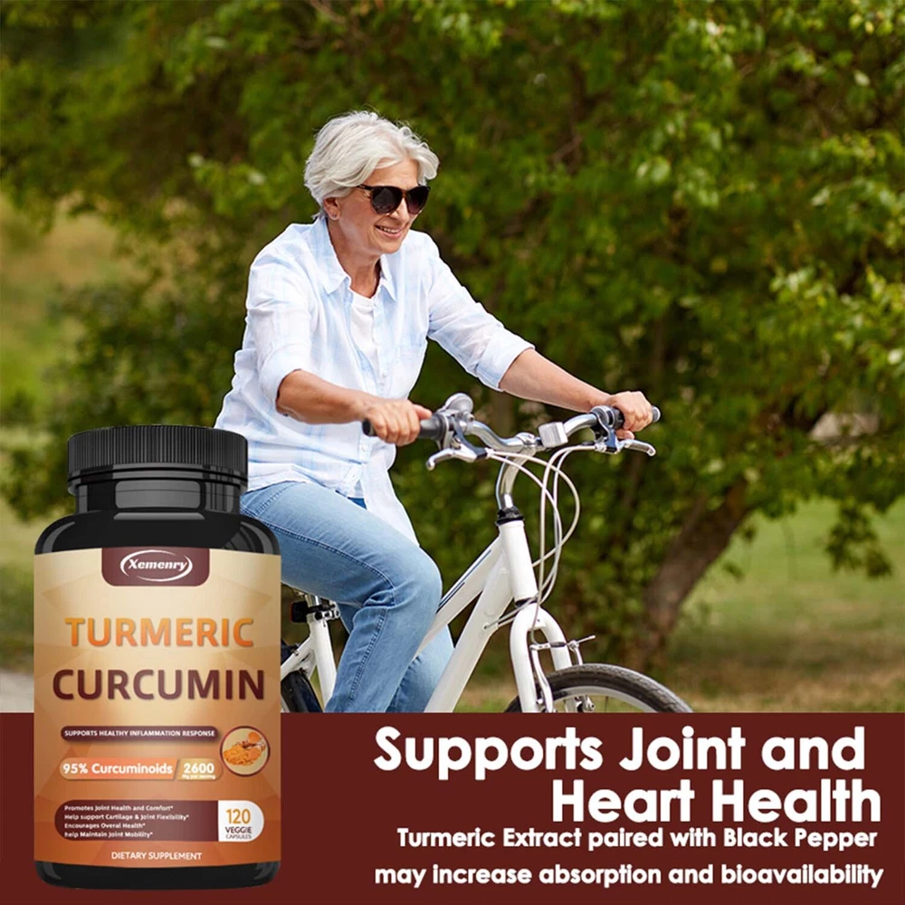 Effects: Antioxidant, Heart and Joint Health Ingredients: Turmeric, Curcumin Directions: Take 2 capsules once daily after a meal. Shipping: Ships within 48 hours on working days. Shelf life: 2 years Description: Powerful Turmeric Curcumin: Our premium Turmeric Curcumin Complex 2600 mg; Contains 95% standardized curcumin; Added piperine (black pepper) for maximum potency, absorption, and bioavailability. JOINT SUPPORT: Our curcumin provides a healthy inflammatory response in an overworked body and helps promote joint comfort. POWERFUL ANTIOXIDANT: Curcumin, one of the primary compounds in turmeric, has antioxidant properties that support heart and joint health, helps prevent oxidative stress and deterioration, and supports brain function and the immune system. TRUSTED: formulated and manufactured under strict GMP guidelines and are third-party tested to ensure the quality and purity of each batch. Document