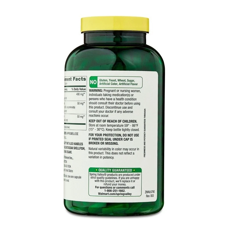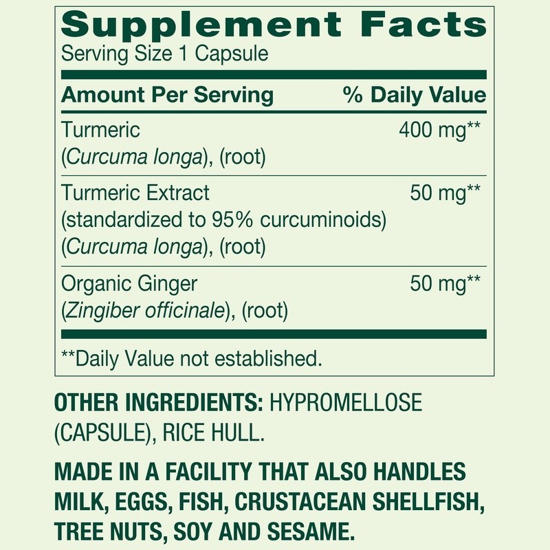 You may also like NAC 1000mg Vegetarian Capsules Antioxidant Support Immune Health 100 Count New 20.77 USD 22.33 USD Free shipping 7% off Vitamin B-Complex Tablets Metabolism Support Energy Immune Health 100 Count New 11.36 USD 12.21 USD Free shipping 7% off Maca Supplement Vegetarian Capsules 500mg 90 Count Gluten Free Wellness Support 13.11 USD 14.1 USD Free shipping 7% off Magnesium Gummies Bone Muscle Support 165mg 60 Count Vegetarian Orange New 13.62 USD 14.64 USD Free shipping 7% off Zero Sugar Melatonin Gummies Sleep Support 5mg 120 Count Strawberry Flavor Vegan 16.57 USD 17.82 USD Free shipping 7% off Fast Dissolve Zinc Vitamin C Chewable Immune Support 150 Count Orange Flavor New 10.47 USD 11.26 USD Free shipping 7% off Turmeric Curcumin with Ginger Powder Dietary Supplement Vegetarian Capsules are a dietary supplement that promotes general wellness and supports a healthy inflammatory response while supporting cardiovascular, immune, joint, and skin health. * Each vegetarian capsule contains 400 milligrams of turmeric powder, 50 milligrams of turmeric extract, and 50 milligrams of organic ginger powder. The suggested adult dosage is one vegetarian capsule twice daily, preferably with meals. These capsules are free of milk and milk derivatives, lactose, and sugar. They also contain no preservatives, artificial colors, or artificial flavors. Supplement your healthy lifestyle with Turmeric Curcumin with Ginger Powder Dietary Supplement Vegetarian Capsules. understands living a healthy, balanced lifestyle is the key to being your best self. With an affordable range of products inspired by nature, supports your and your family's health and holistic wellbeing. Turmeric Curcumin with Ginger Powder General Wellness Dietary Supplement Vegetarian Capsules, 500 mg, 250 Count Dietary supplement that promotes general wellness* May support cardiovascular, immune, joint, and skin health* Includes organic ginger powder No gluten, yeast, wheat, milk, soy, lactose, or sugar No artificial colors or flavors Kosher and halal Non-GMO Project Verified Bottle of 250 vegetarian capsules United States coin image from the United States Mint *These statements have not been evaluated by the Food and Drug Administration. This product is not intended to diagnose, treat, cure, or prevent any disease. You may also like Vitamin B-Complex Tablets Metabolism Support Energy Immune Health 100 Count New 11.36 USD 12.21 USD Free shipping 7% off NAC 1000mg Vegetarian Capsules Antioxidant Support Immune Health 100 Count New 20.77 USD 22.33 USD Free shipping 7% off Magnesium Gummies Bone Muscle Support 165mg 60 Count Vegetarian Orange New 13.62 USD 14.64 USD Free shipping 7% off Fast Dissolve Zinc Vitamin C Chewable Immune Support 150 Count Orange Flavor New 10.47 USD 11.26 USD Free shipping 7% off Zero Sugar Melatonin Gummies Sleep Support 5mg 120 Count Strawberry Flavor Vegan 16.57 USD 17.82 USD Free shipping 7% off Maca Supplement Vegetarian Capsules 500mg 90 Count Gluten Free Wellness Support 13.11 USD 14.1 USD Free shipping 7% off