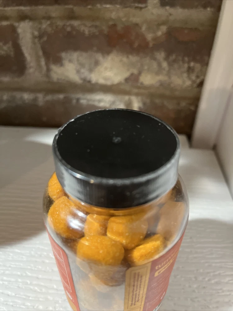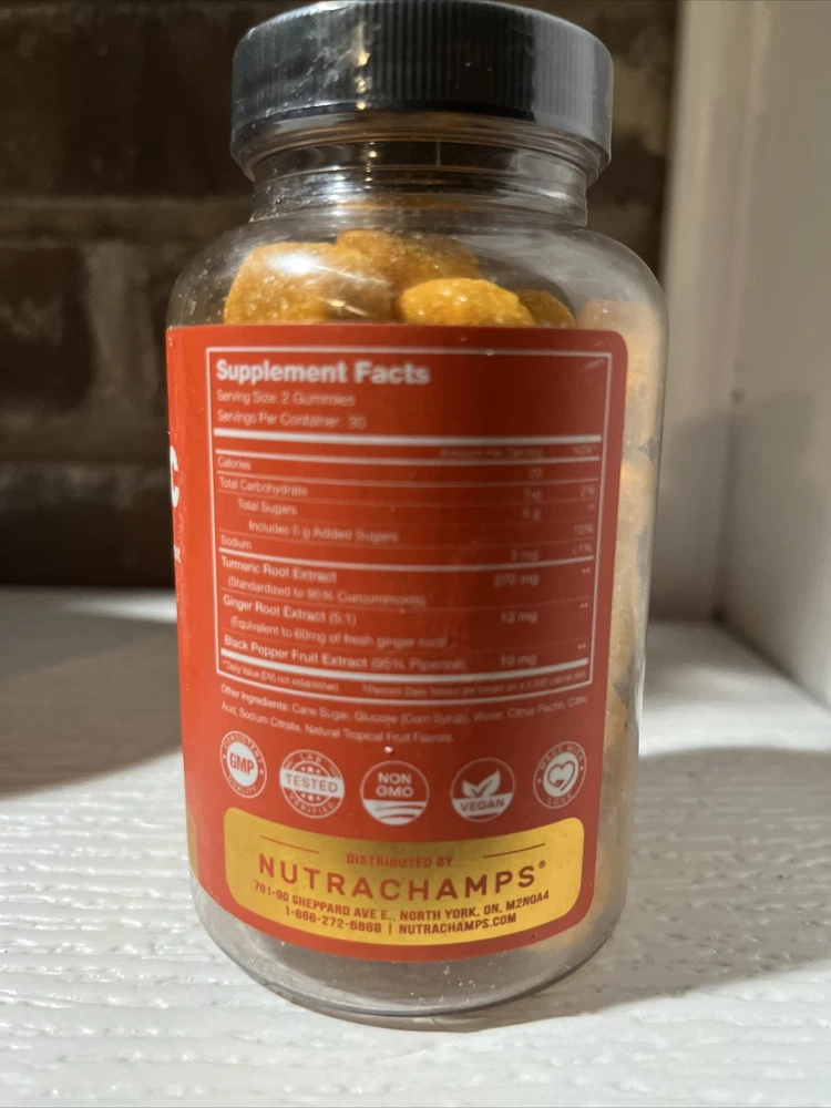 Turmeric, Natural Tropical Fruit, 60 Vegan Gummies Exp 07/25. Note: Due to a protein powder spill, trace amounts might still be trapped under the outer seal. See photos