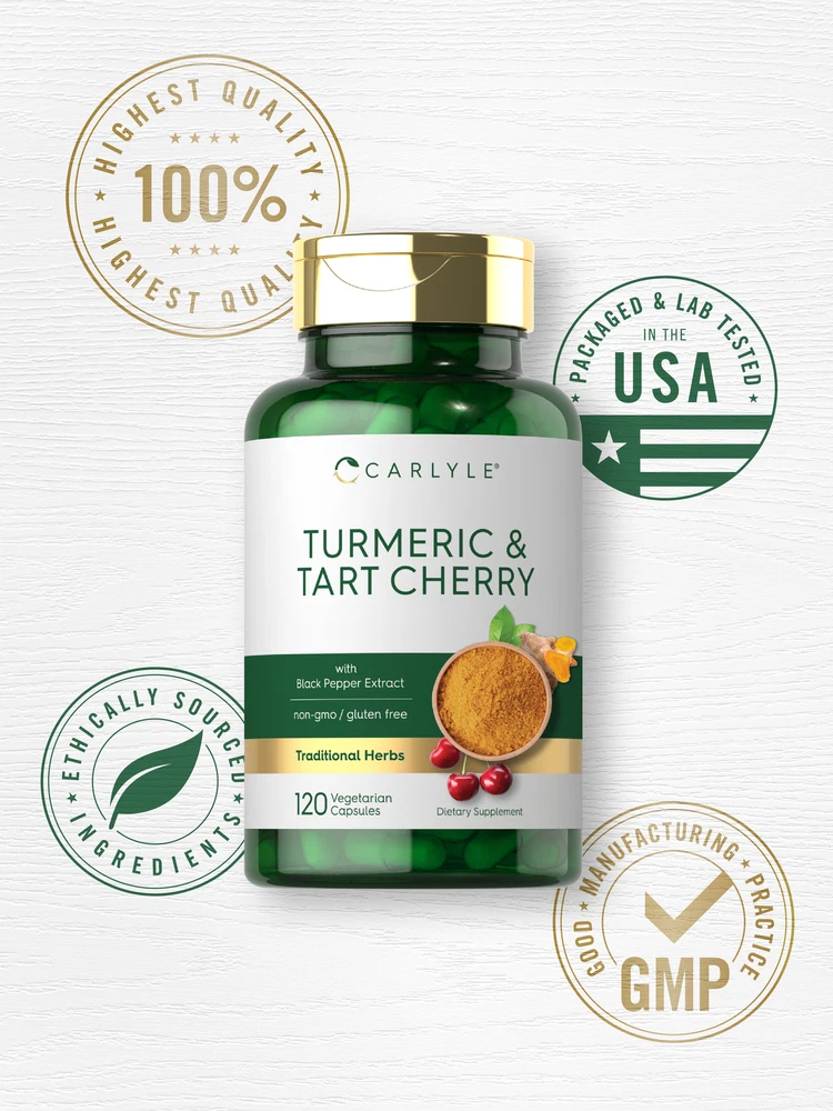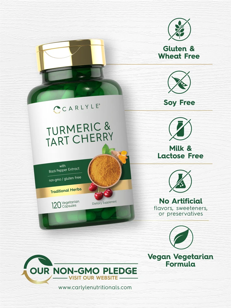 Powerful Traditional Herbs: Known for its iconic gold appearance, Turmeric is a traditional Ayurvedic herb with powerful curcuminoid compounds derived from its roots. Tart cherry is also packed with nutrients, containing naturally occurring vitamins, minerals, and antioxidants. Together these traditional herbs provide superior antioxidant support for your nutrition plan. Carlyle Turmeric & Tart Cherry: Get a double dose of nutrition with Carlyle Turmeric & Tart Cherry! This premium herbal supplement features a 200 mg Turmeric Curcumin Blend, plus Tart Cherry and Black Pepper Extract, all in one vegetarian capsule. We test our herbs for purity and potency, providing a gluten-free and non-GMO formula that works well with any daily routine. Rooted in Wellness: Our expertise in sourcing the purest ingredients combined with advanced technologies makes us proud to deliver premium, honest supplements at the best value. Carlyle Turmeric and Tart Cherry is a testament to our commitment to excellence, made with powerful ingredients rooted in wellness. Thanks for choosing us in your pursuit of living healthy.
