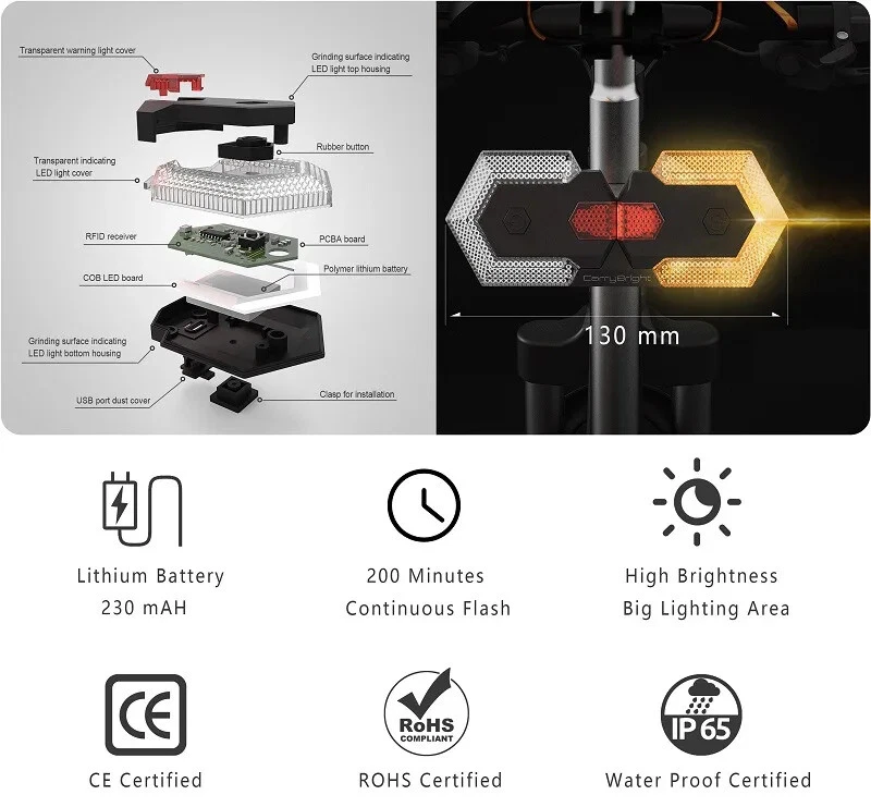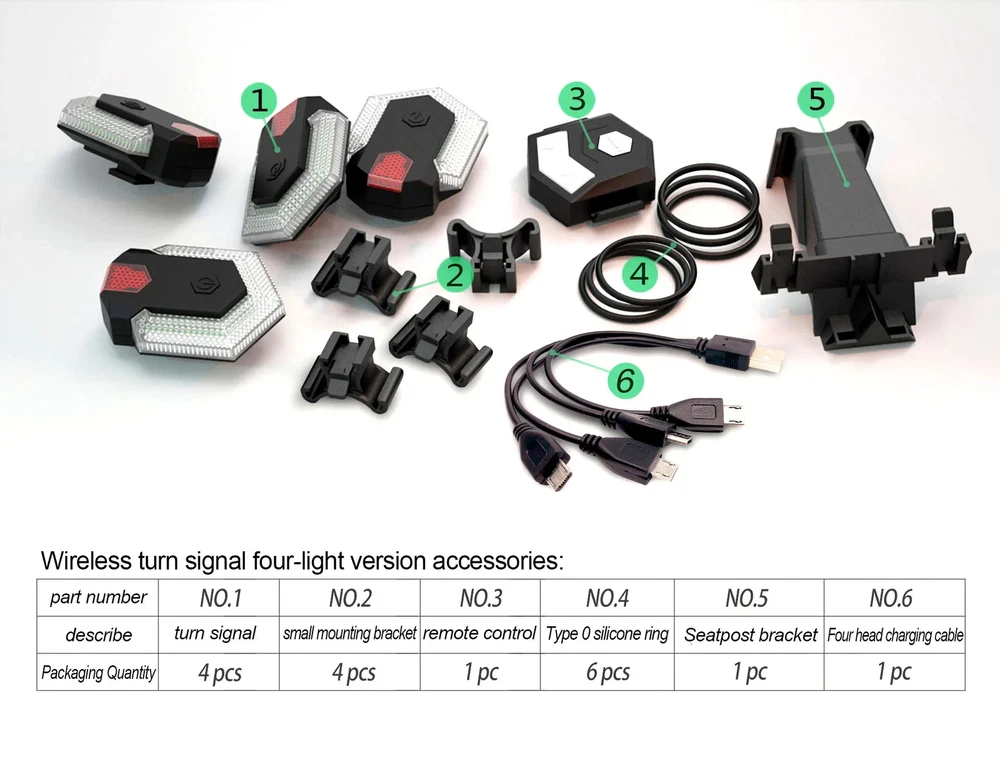 F eatures: 1.USB charging, Waterproof. 2.Reative and stylish appearance, well coordinate with all kinds of bicycle: mountain bike ,road-bike, off- road bike ,racing bike. 3.Together with smart remote control, easily control the right/left turn signal, emergency light and alert guides, provide great safety for cyclist during night time or rainy day. 4.The LED light make you visible from blocks away. It is your best partner for outdoor biking. 5.The bike taillight has an excellent performance at night time. Remind drivers to keep safety distance when driving passes you 6.Easy to install. No tools required; Just hook on the durable quick-release rubber strap mount and you are ready to ride. Bike Turn Signals Front Rear Light Set only,other accessories demo in the picture is not included. Specification: Material: ABS One Lamp Length: app.6.5cm/2.56in Color: Black Quantity: 1 Set Note: Please allow 0-1cm error due to manual measurement. pls make sure you do not mind before you bid. Due to the difference between different monitors, the picture may not reflect the actual color of the item. Thank you!