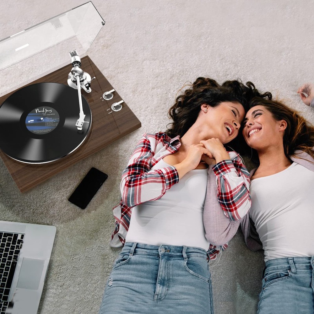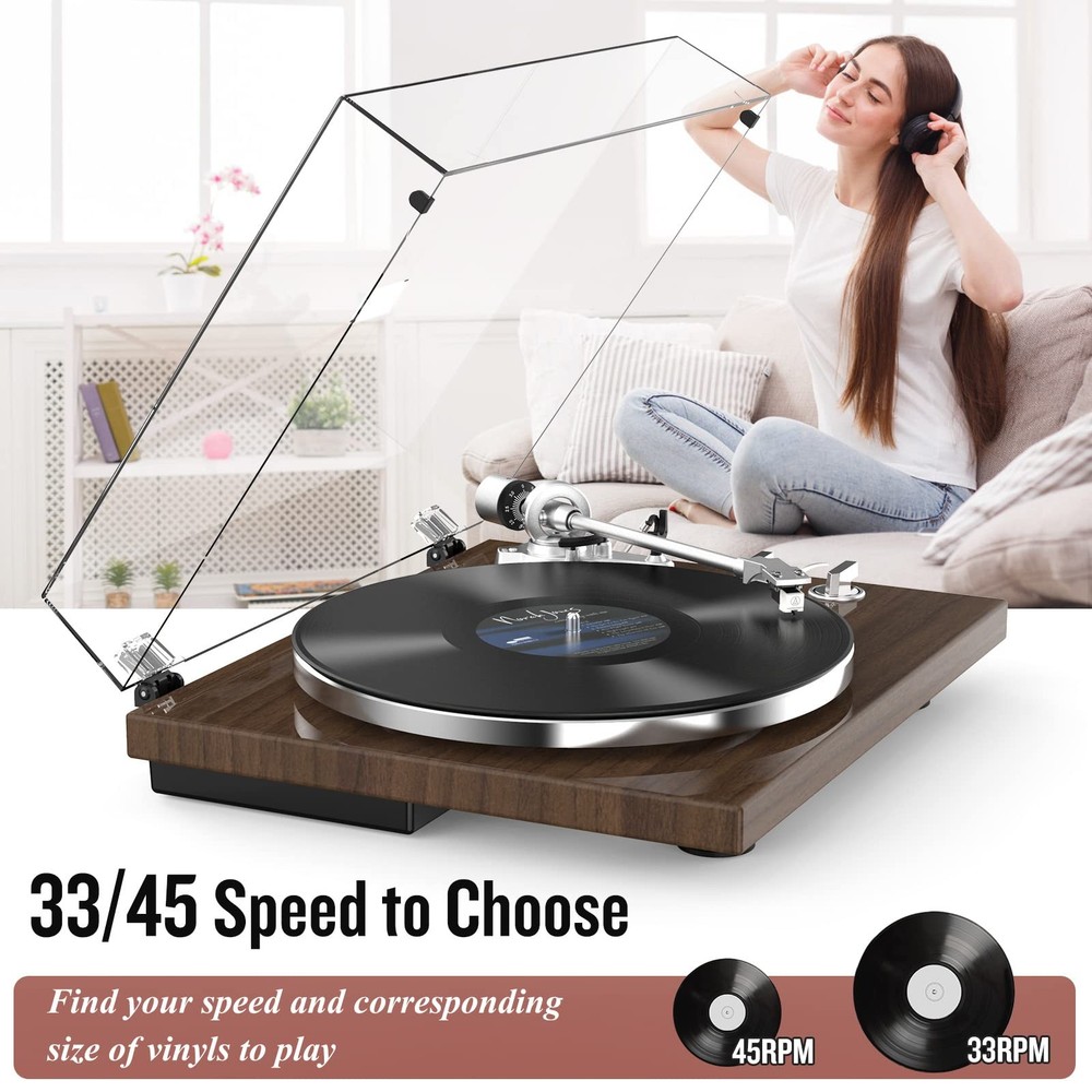 Multifunctional Retro Turntable System 1. Authentic Belt Drive System This turntable for vinyl record constructed with aluminium die-cast discs, polished stainless steel spindle, durable rubber belt, it produces a uniform inertial mass for perfect stability and rotation. 2. Adjustable Counterweight Design Setting counterweight makes tonearm balanced according to the stylus weight to ensure the stylus needle sits perfectly in the groove of the record, maintains the clarity of musical peaks, balances the channel, and provides freedom from noise and distortion to prevent scratches on vinyl records. 3. Wireless BT Output Record player with BT output help you pair wireless speakers or headphones and get rid of wires! Suddenly, the best place to place a turntable and your favorite listening position don't have to be the same. Just pair and listen how and where you want. Even better, no receiver is required. Note: Some BT speakers may not be connected properly, especially large soundbars, as this turntable is compatible with Bluetooth protocol HFPV1.5, A2DPV1.2, AVRCPV1.4, HSP1.2, GAVDP1.2, IOP 4. Built-in USB Digital Output Retro record player connect this turntable to your computer via the included USB cable and encode the vinyl audio to MP3 for digital storage and playback on your computer, smartphone or tablet. Listen to your vinyl records wherever life takes you! 5. Built-in Phono Preamp and Analog Phono/Line out Enjoy vinyl playback from any amplifier with the built-in MM-type preamp. Your phonograph turntable includes phono and line outputs, and can be played with or without a phono equalizer. 6. Two-speed Vinyl Player It supports 2-speed turntable (33 1/3, 45 RPM) to play all 7" 10" 12" vinyl records and favorite albums. 7. RCA Line Output Use RCA cables with red and white jacks to connect to external powered speakers for a multi-speaker sound quality experience~ [Wireless BT Output Connectivity] Using BT 5.3 version, automatically identifies BT devices within the nearest range. Pair with BT speakers or headphones for an amazing, wire-free experience. Even better, no receiver needed [Get More Support] If you have any questions, you can let us know, we will help you until solving it.These models of speakers are compatible with BT protocols HFPV1.5, A2DPV1.2, AVRCPV1.4, HSP1.2, GAVDP1.2, and IOP [Adjustable Counterweight Force] By balancing the tone arm and adjusting the appropriate weight of the stylus to achieve precise playback. Get perfect playback every time using the tonearm counterweight and advanced anti-skating system. These ensure the stylus is balanced and rests deep in your record’s groove, producing smooth stylus movement, protecting your records from damage [Great Connectivity Options] Enjoy vinyl playback with any amplifier using the built-in Magnetic type PHONO Preamp.This turntable includes both Phono and Line Outputs that allow playing of vinyl with or without a Phono equalizer [Audio MM Cartridge Stylus] The Audio AT-3600L diamond-tipped stylus cartridge is designed to produce rich sound and outstanding clarity, tracking your record’s grooves with precision for accurate, high-definition audio [USB to PC Vinyl Recording] Connect this turntable to your computer via USB and encode vinyl audio into MP3s for digitalized storage and playback on your computer, smartphone or tablet. Take your favorite vinyls with you on-the-go