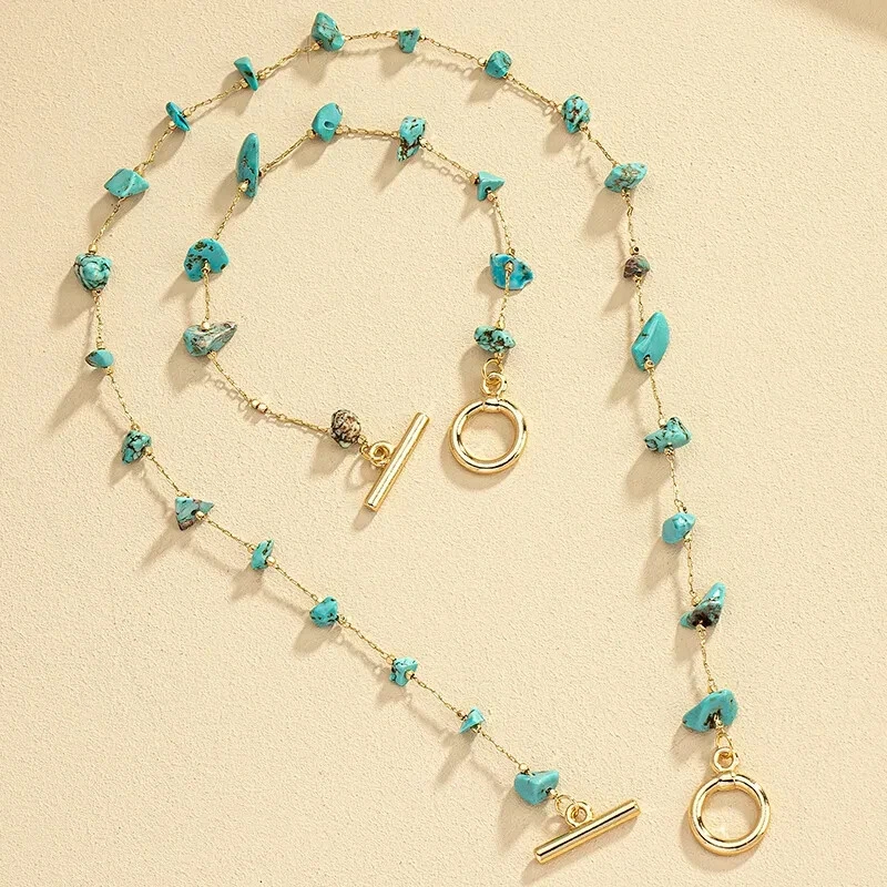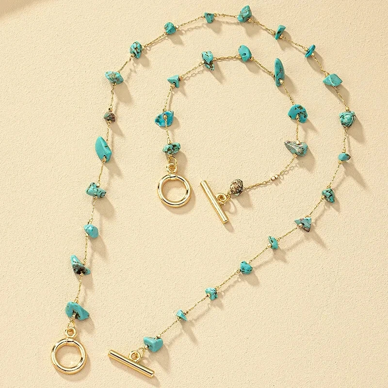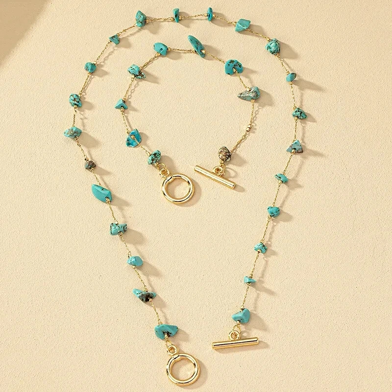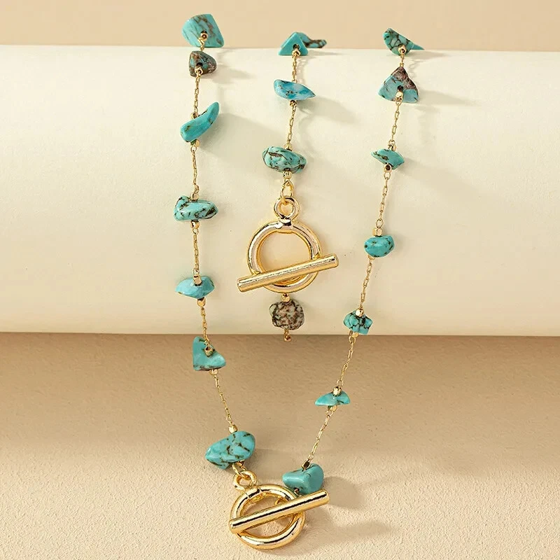 This beautiful jewelry set features a stunning combination of gold tone metal and faux turquoise blue chip stones in an irregular shape. The set includes a necklace and bracelet, perfect for all occasions such as weddings, parties, or casual wear. The pieces are handmade and nickel-free, ensuring quality and safety for the wearer. The bohemian and ethnic themes of this set make it a perfect addition to any fashion and costume collection. The necklace is 15.78 Inches and Bracelet is 6.69 Inches Get ready to make a statement with this unique and beautiful Turquoise Chip Necklace Bracelet Set. (H)