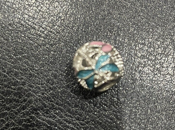 This round charm in the style of Pandora features pink enamel with a turquoise butterfly design, making it a lovely Valentine-themed piece. The beaded spacer charm is made of alloy and is perfect for adding a touch of love to your bracelet. Free postage and packaging included.