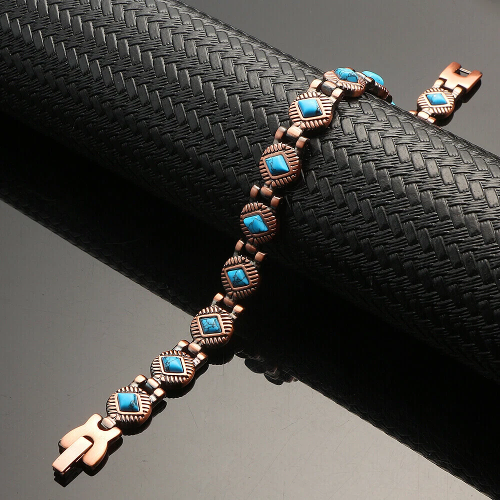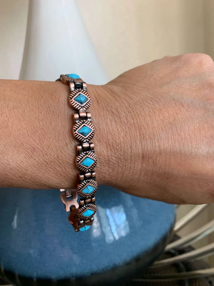 KEY TO GOOD HEALTH IS GOOD CIRCULATION...It works like Acupuncture without the needles! Rare Turquoise & Magnets & Copper for Healthy New Year's Gift for yourself and your loved ones... * BEST LOOKING, highest quality, Stylish Modern European Design and Precision Hand-Crafted Bracelets. Just wear it, it looks great and its therapeutic, what more could you ask for? Treat yourself and your loved ones. * Relieves Aches and Pain, Helps Arthritis pain, Improves Circulation, Reduces Inflammation, Boosts Immunity, Improves Balance, Stress & Anxiety relief (Makes you feel better) * 14 magnets and bio elements with 5,000 Gauss power! Pure 100% Copper bangle bracelet with strongest Neodymium magnets. (70,000 Gauss Total) * KEY BENEFITS- Our bracelets may help increase balance, strength, flexibility, and energy as well as increase blood circulation to help relieve aches and pain. It may help healing process and induces sense of well-being. It's perfect for people with active life style like runners, playing golf or sports. Great gift for yourself and your loved ones. Perfect Gift for everyone! Try it, love it or 60 days money back
