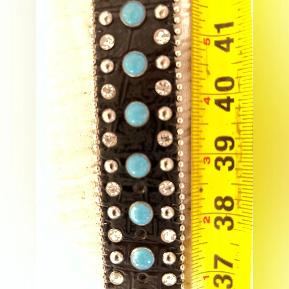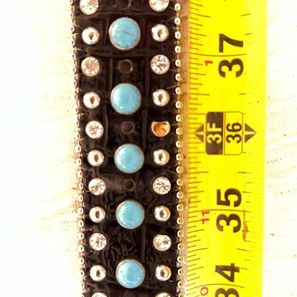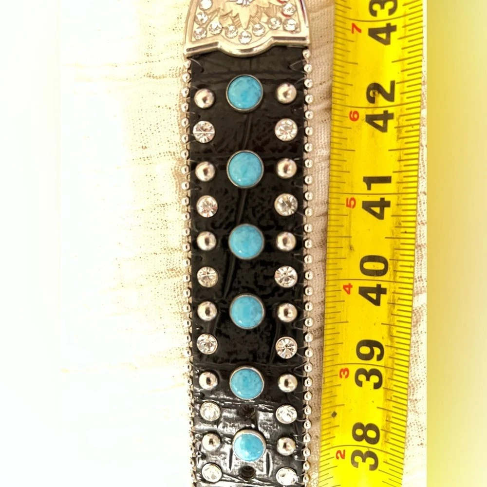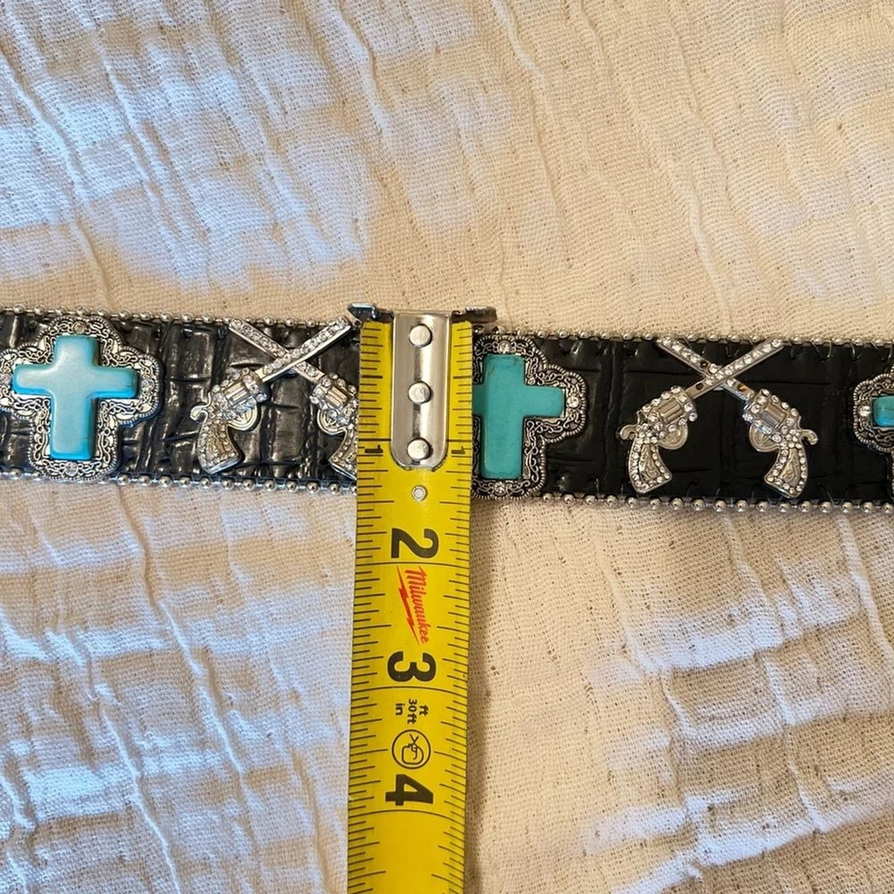 Pre-owned in good condition Rhinestone & Turquoise Studded Western Belt w/ Double Pistol Embellishment. Missing rhinestone on loop and crystals on pistols but otherwise looks amazing! Size Large 100% genuine leather Approximate measurements in pics