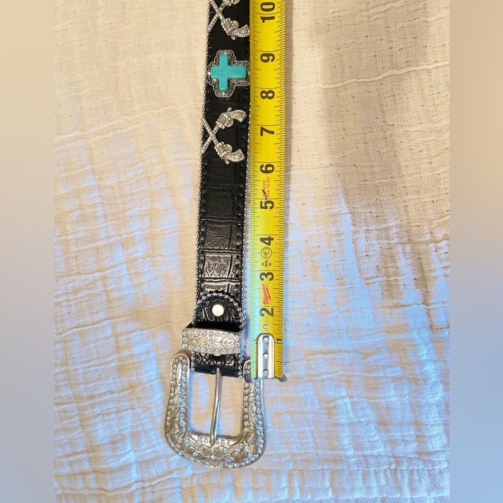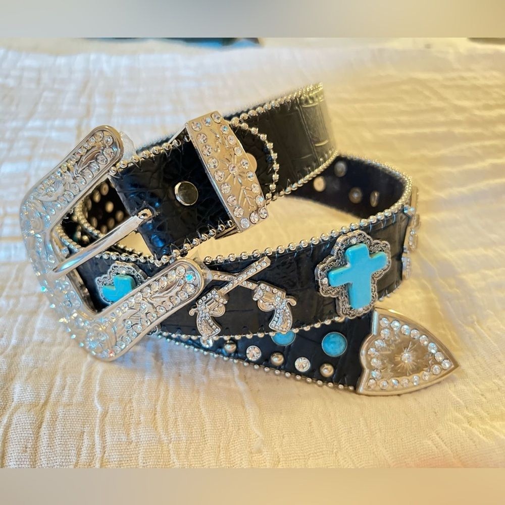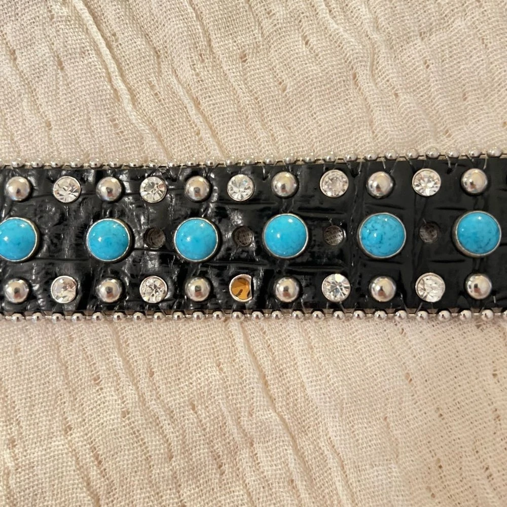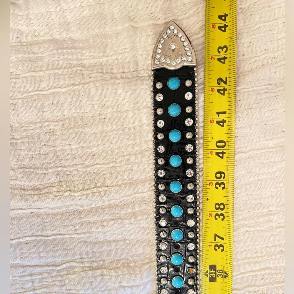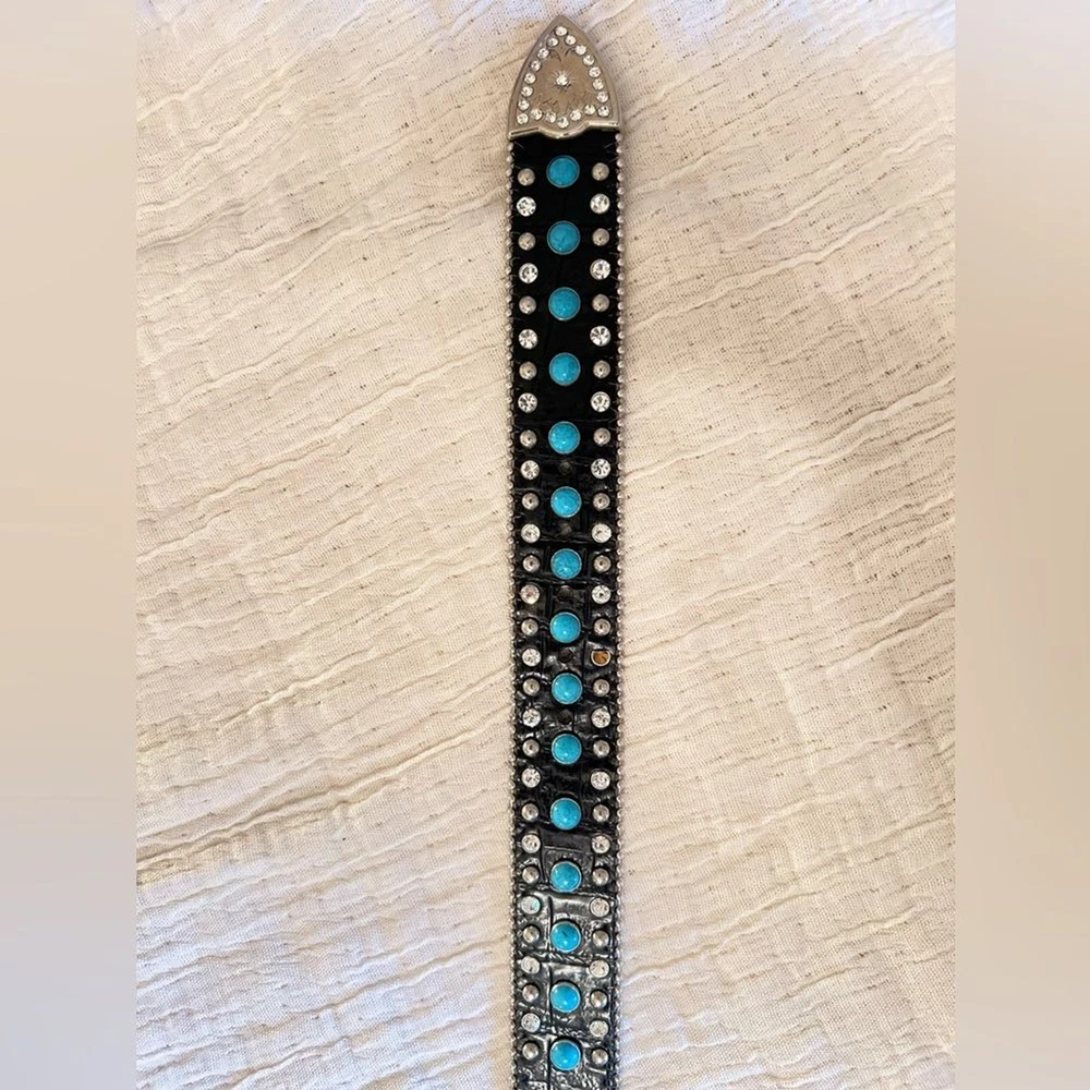 Pre-owned in good condition Rhinestone & Turquoise Studded Western Belt w/ Double Pistol Embellishment. Missing rhinestone on loop and crystals on pistols but otherwise looks amazing! Size Large 100% genuine leather Approximate measurements in pics