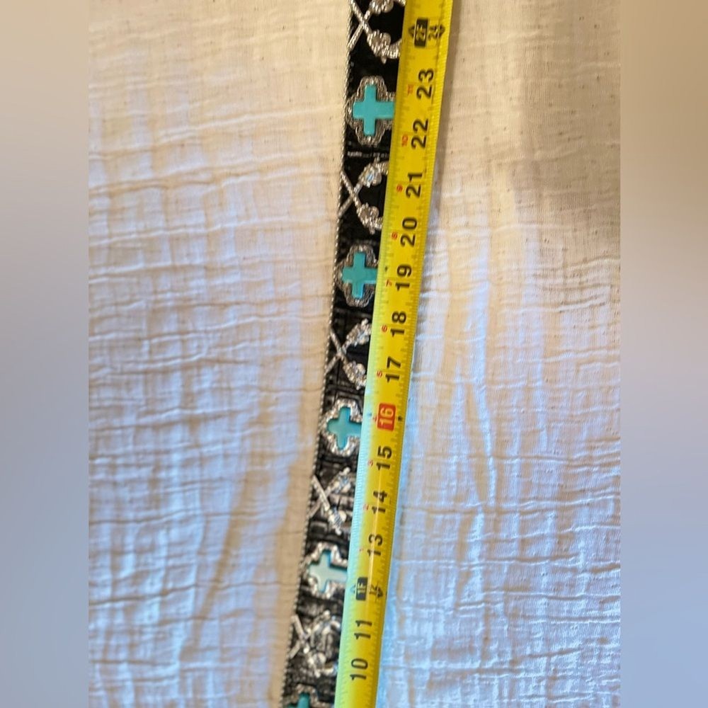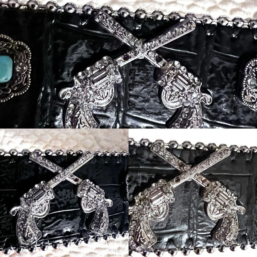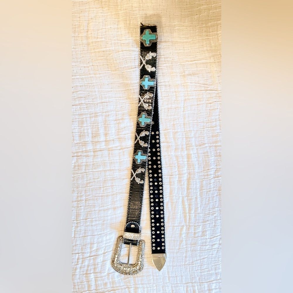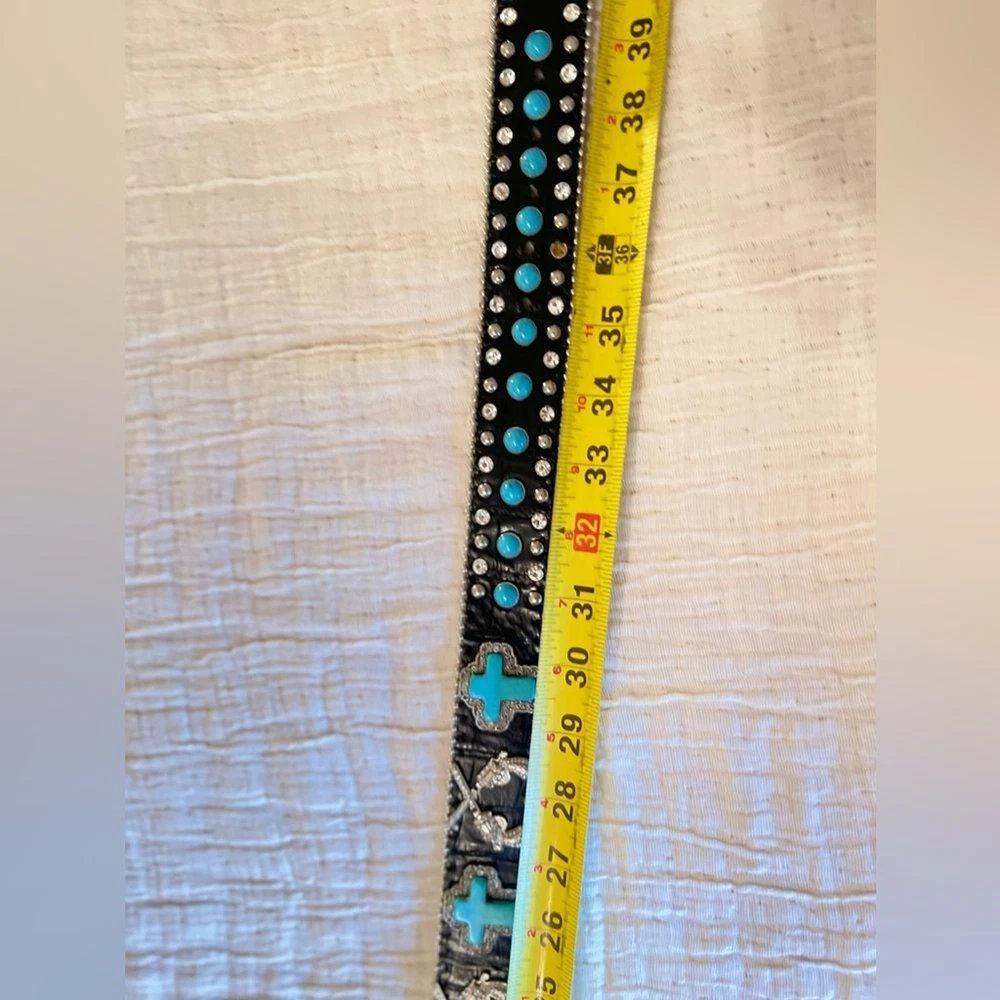 Pre-owned in good condition Rhinestone & Turquoise Studded Western Belt w/ Double Pistol Embellishment. Missing rhinestone on loop and crystals on pistols but otherwise looks amazing! Size Large 100% genuine leather Approximate measurements in pics