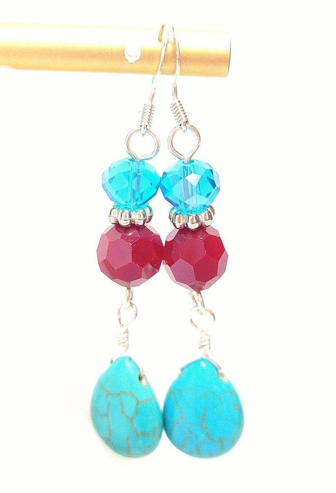 Turquoise is classic. Indulge yourself with these long simulated turquoise earrings with real silver plated hooks. These earrings add sparkle and elegance to any outfit, casual or dressy. They love to swing, but they're lightweight design ensures comfort all day long. Turquoise Teardrop Red Crystal Turquoise Crystal Silver plated lever back earring hook 3 inches long