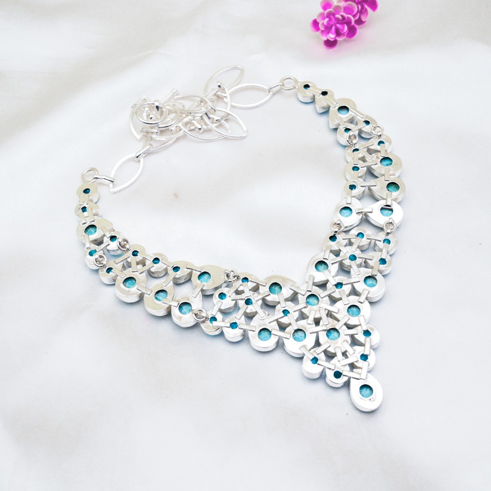 Style:NecklaceCut Grade:Very GoodBase Metal:Sterling SilverChain Type:Same As PictureSecondary Stone:Blue Topaz, TurquoiseCountry of Origin:IndiaDiamond Color Grade:N/ABrand:HandamdeFeatures:HandmadeOccasion:Anniversary, Birthday, Christmas, Engagement, Father's Day, Mother's Day, Valentine's Day, WeddingMaterial:Stone, GemstoneNumber of Diamonds:N/AType:NecklaceMain Stone:TurquoiseCertification:N/AColored Diamond Intensity:N/ATotal Carat Weight:10 carat and aboveMain Stone Shape:PearNecklace Length:18 Inches With Adjustable ChainMain Stone Treatment:Not EnhancedMetal Purity:925Closure:Same As PictureMetal:Sterling SilverMain Stone Color:BlueMain Stone Creation:Lab-CreatedCollection:HandmadeDiamond Clarity Grade:N/APendant Shape:Same As PictureNumber of Gemstones:51Setting Style:BezelCountry/Region of Manufacture:IndiaColor:SilverTheme:Beauty, Bohemian, Ethnic, Halloween, LovePendant/Locket Type:Charm