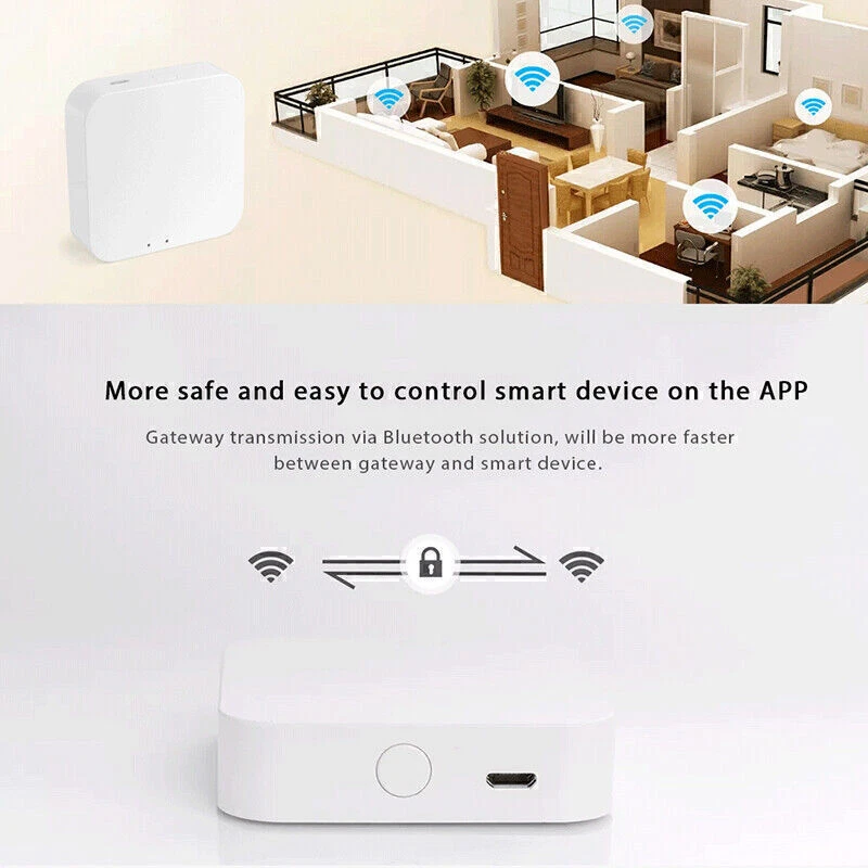 Product Description If you have any questions, please contact customer service first, do not open disputes easily, thank you! Features: 1. Remote control on smart life APP through mobile phone network or WIFI. 2. Used with other Bluetooth SIG devices to implement automatic scene application. 3. Wireless connection indicator. Specification: Status indicator: 2 LEDs (WIFI + Bluetooth) Operation keys: 1 button (reset) Power supply: Micro USB DC5V Working current: <1A Working temperature: -10-55 ℃ Working humidity: 10% -90% RH (non-condensing) Storage temperature: -20-60 ℃ Storage humidity: 5% -90% RH (non-condensing) Hardware interface: 1 Micro-USB Wireless technology: WIFI 802.11 b / g / n Bluetooth: 5.0 Antenna type: Built-in onboard antenna Size: about 61 * 61 * 16mm Weight: about 80g Packing list: 1 * Bluetooth gateway 1 * Manual 1 * Data cable About Us We accept all payments authorized by eBay. powered by