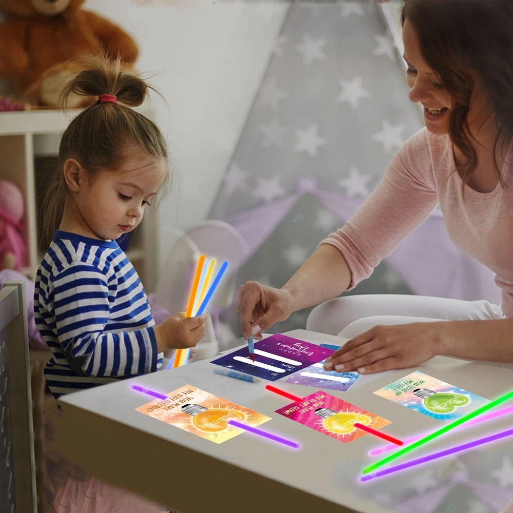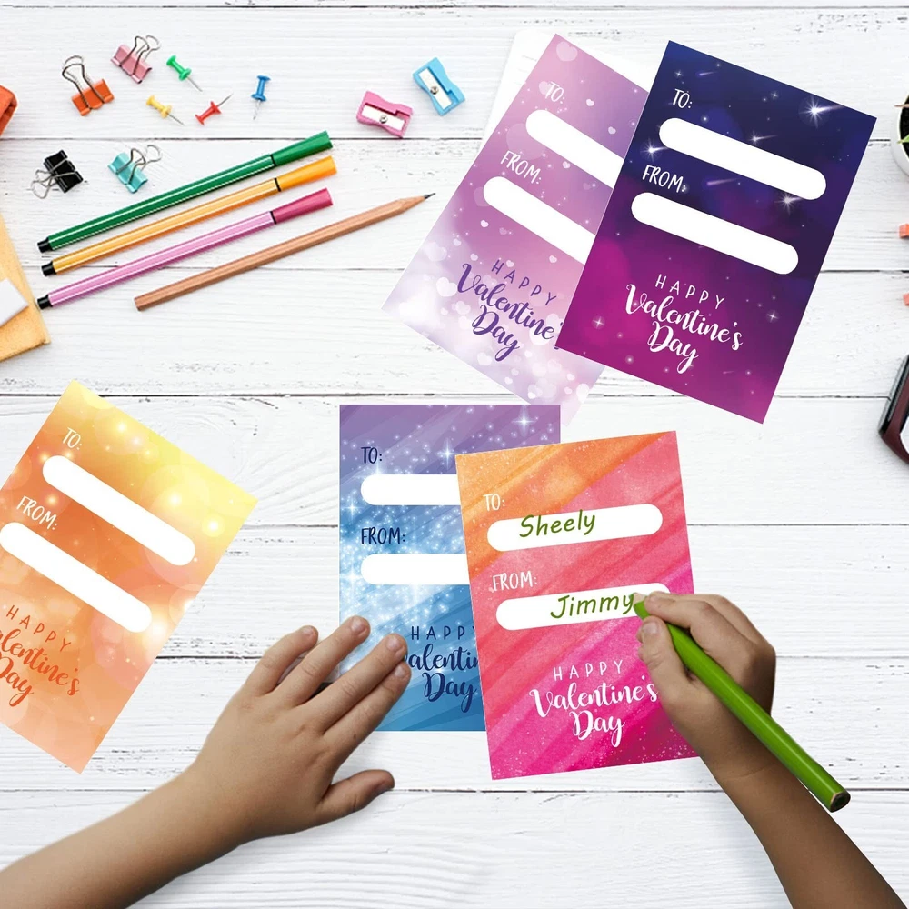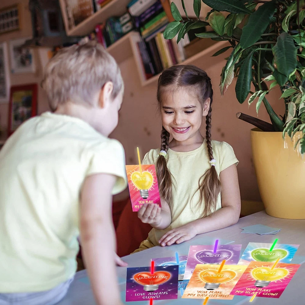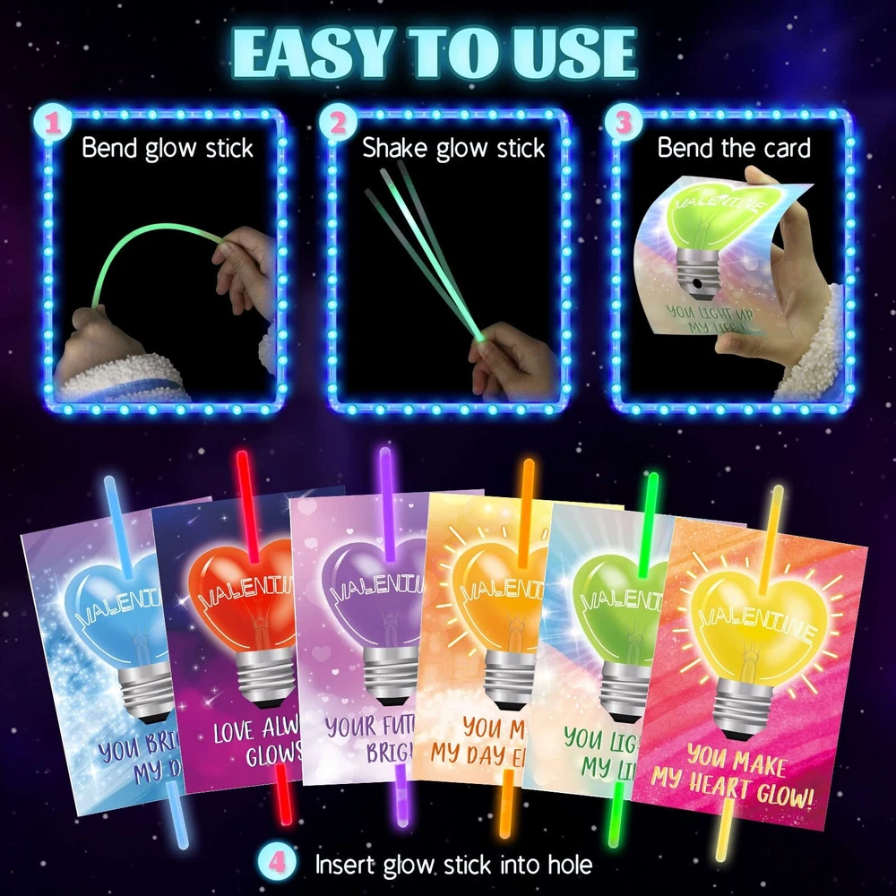 Tuzuaol 36 Pack Valentines Day Gifts for Kids Classroom School Classroom Exchange Valentines Cards with Glow Sticks for Party Favors Product Details Color: White Material: Paper, Plastic Brand: Tuzuaol Unit Count: 36.0 Count Theme: Love Item dimensions L x W x H: 6 x 0.6 x 8 inches Occasion: family Item Weight: 0.39 Kilograms Manufacturer: Tuzuaol UPC: 768788462747 Age Range (Description): Kid Product Dimensions: 6 x 0.6 x 8 inches Item Weight: 13.6 ounces Country of Origin: China Item model number: 85246 Manufacturer recommended age: 5 years and up Super Value Valentines Cards for KidsFun Valentine glow sticks card Set includes 36 cards(6 designs) and 50 glow sticks in 8 colors with 50 single bracelet connectors. DIY a Valentines day card for kids with glow stick and exchange the novel valentines gift for kids is a good way to encourage kids to express love and thankful to families, friends and classmates. Valentines Day Cards for Classroom SchoolOur Valentine's Day cards for kids classroom are beautifully printed on both sides with clear and bright patterns. Valentines cards in 6 designs, each design has a special punchline of greeting. You light up my life", "Love always glows", ect. Kids can sign the name on the cards backside where printed with "To"and "From". With this unique design of the Valentines day cards, the kids will surely be excited to give them or to their friends. Glow in the Dark FunFirst bend the card. Then insert the glow stick. Bend and shake to activate.The glow sticks include 8 colors: red, orange, yellow, green, blue, purple, pink and light blue. You can also use the included connectors to form glow bracelets and necklaces. Light up the night with these fun and vibrant glow in the dark party favors! High Quality & SafetyThe Valentines day cards for kids are made of premium paper, super sturdy. The glow sticks are made of flexible plastic and safe materials, which can ensure up to 6 hours of glowing light. These nontoxic and non leaking glow in the dark party favors are safe and fun for kids. Valentine Party Favors for KidsValentines day cards for kids glow sticks are perfect for Valentine's Day classroom exchange gifts, party favors, Valentine giveaways, goodies/candy bag fillers, Valentine gifts, Valentine party favors supplies!