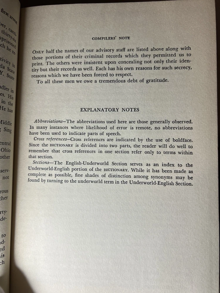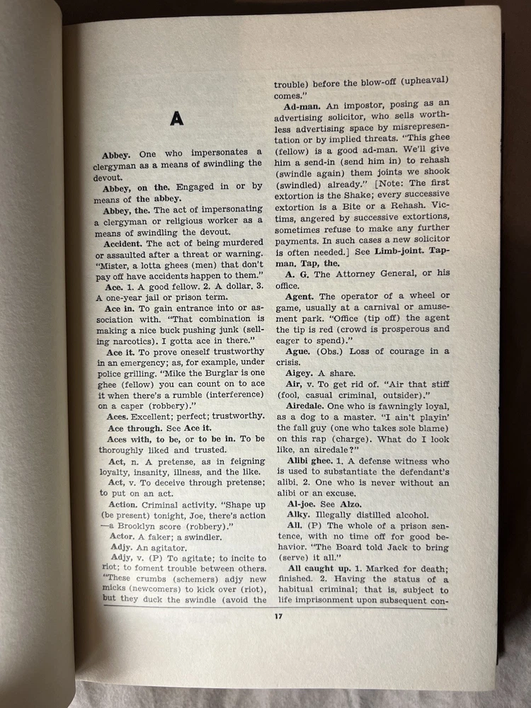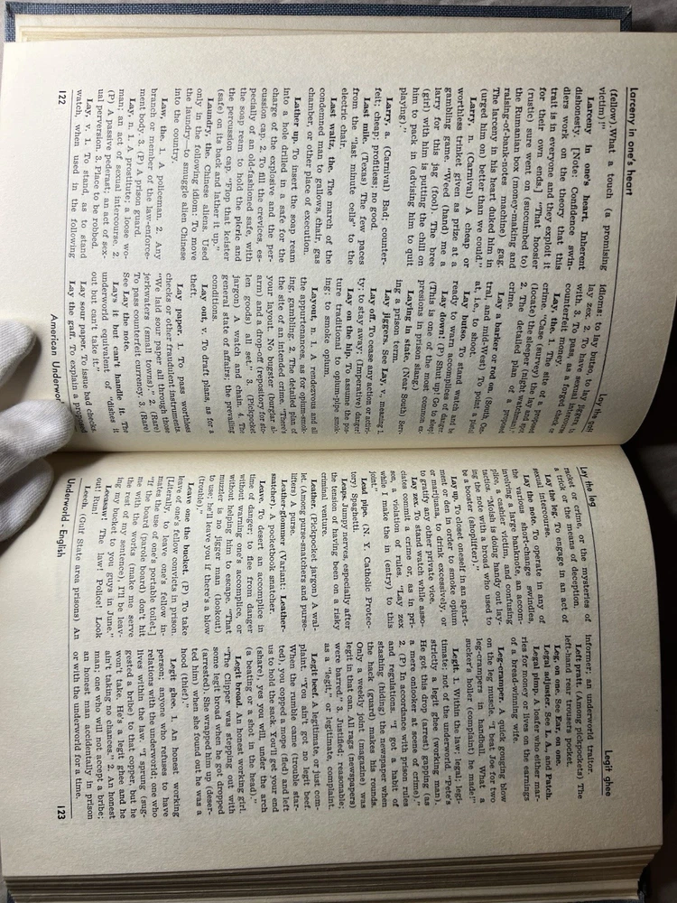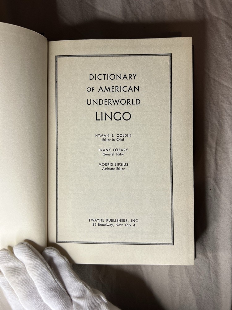 Source Language: English Subject: Languages, Linguistics Publication Year: 1950 Author: Hyman E. Goldin, Frank O'Leary, Morris Lipsius Type: Specialized Dictionary Format: Hardcover, Book Language: English Subject Area: English Publication Name: Dictionary of American Underworld Lingo Publisher: Twayne Publishers, Inc.