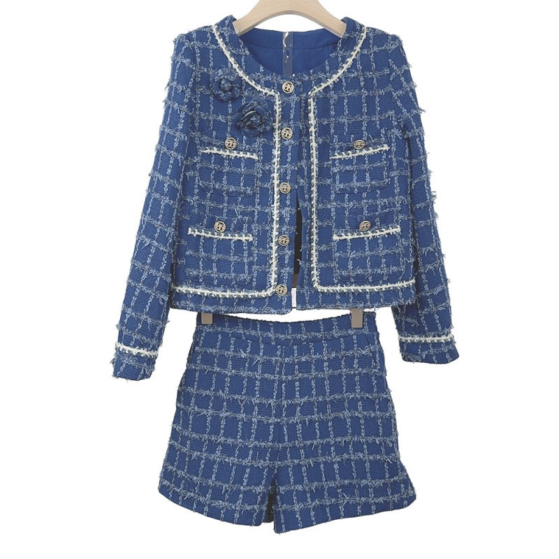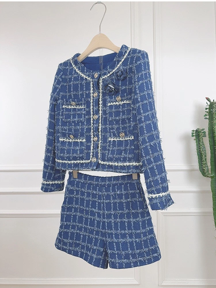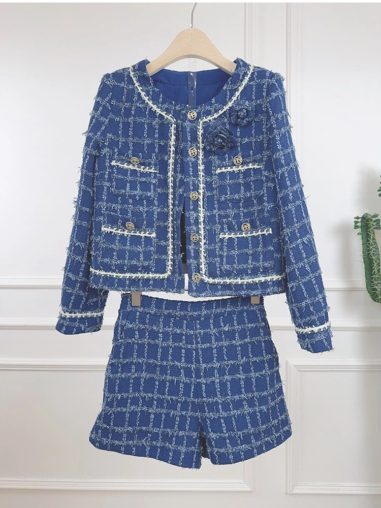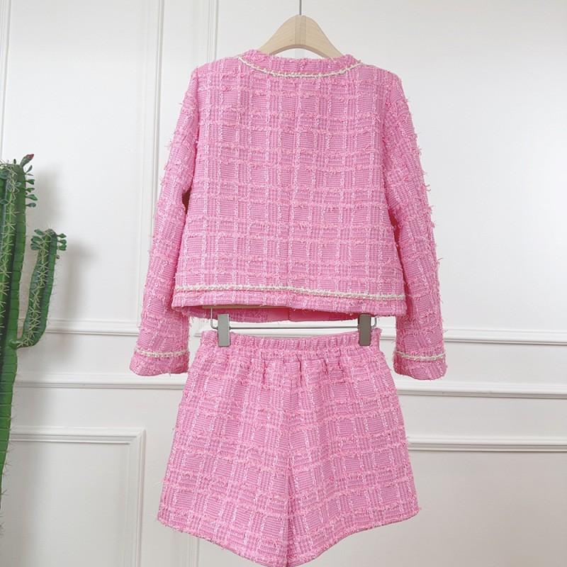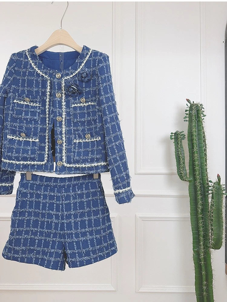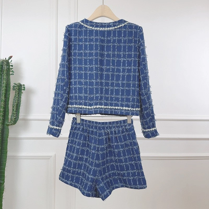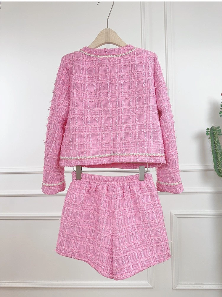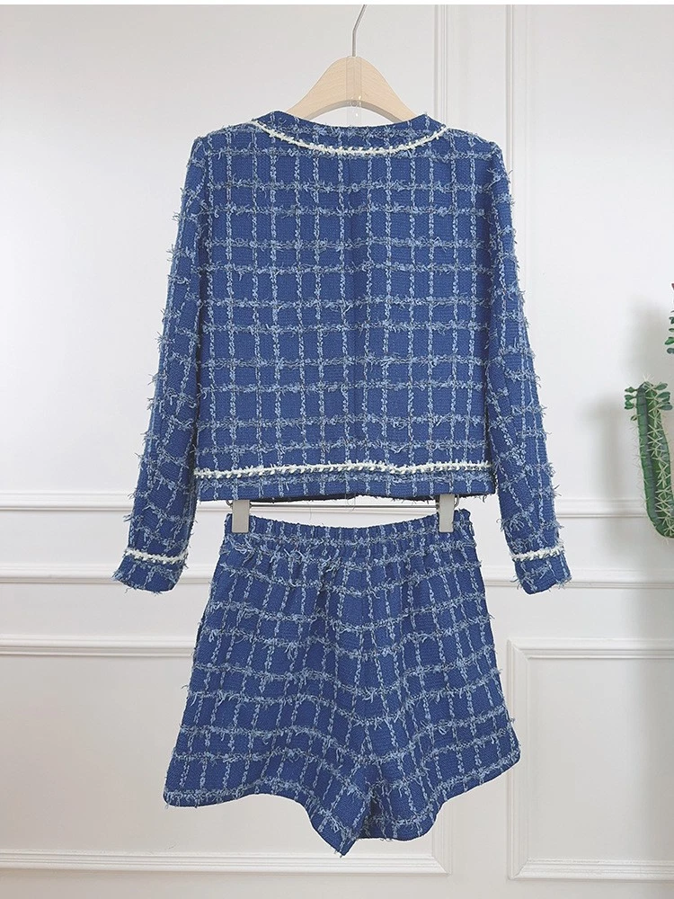 Tweed Round Neck Long Sleeve Short Jacket Shorts Two-piece Suit Women Party Coat