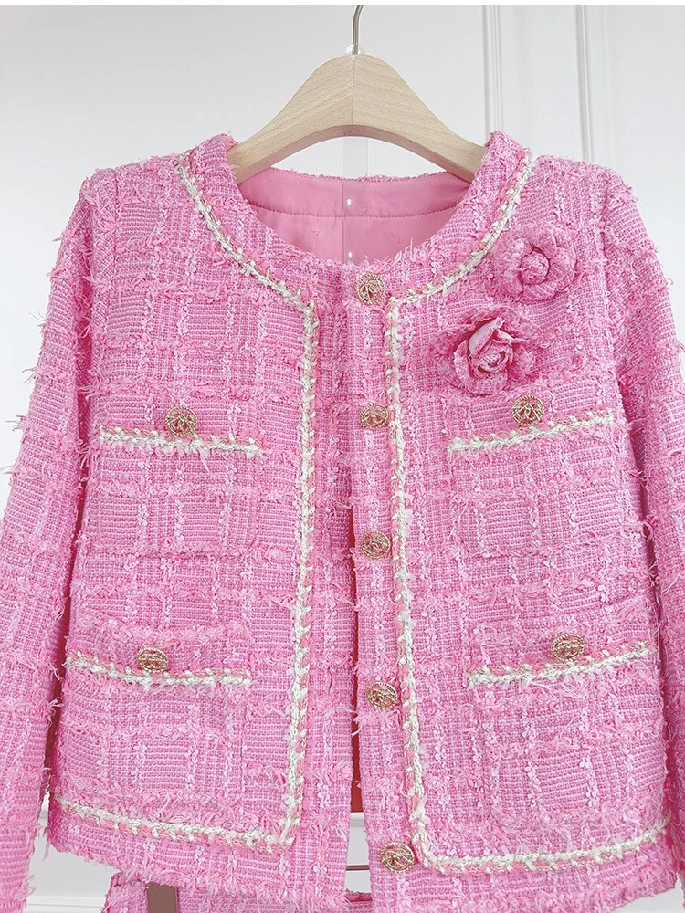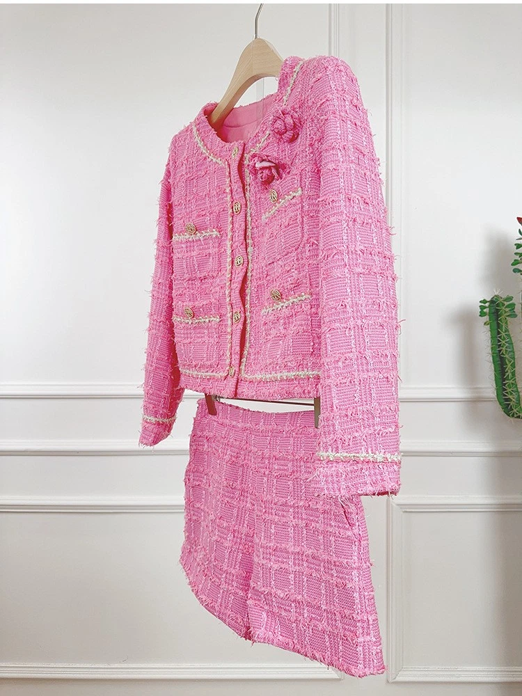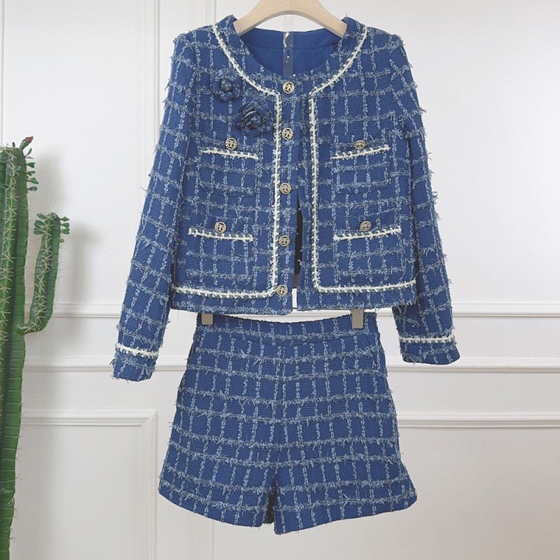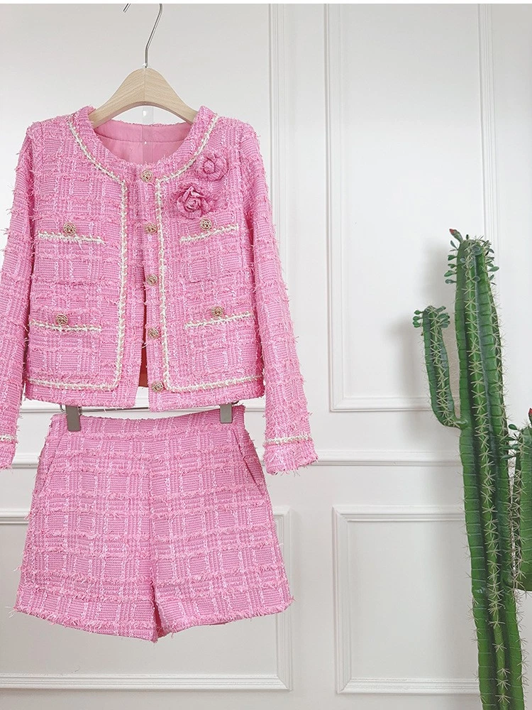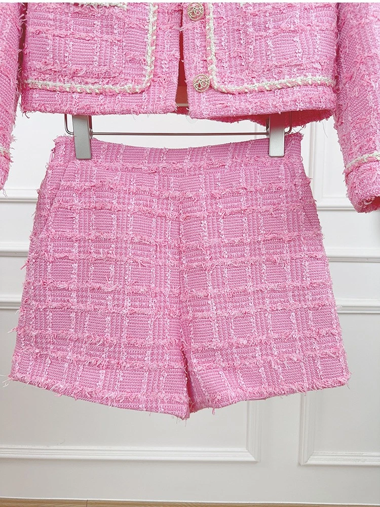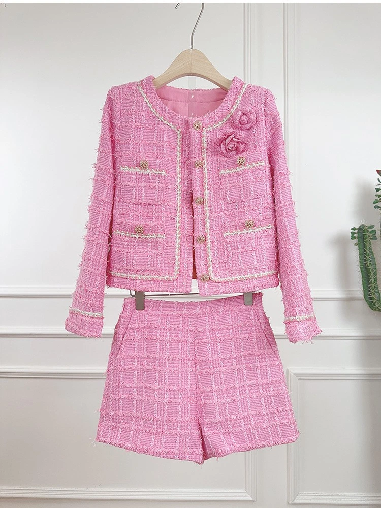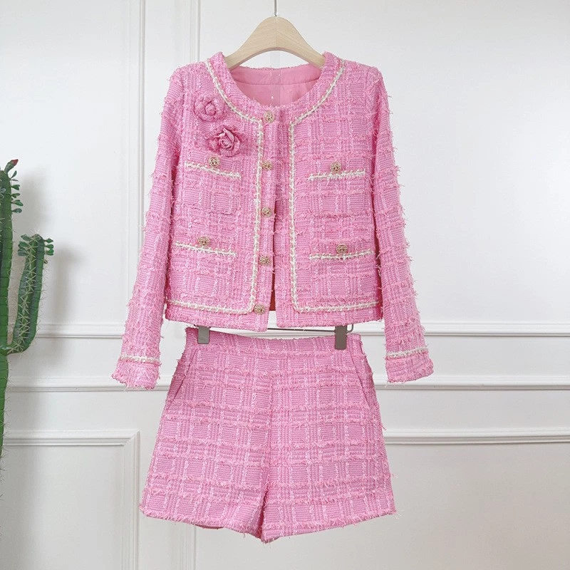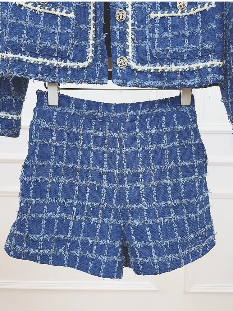 Tweed Round Neck Long Sleeve Short Jacket Shorts Two-piece Suit Women Party Coat