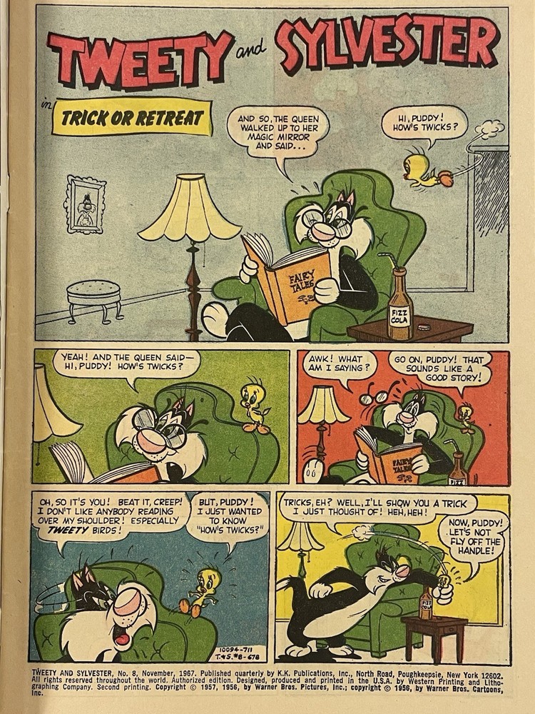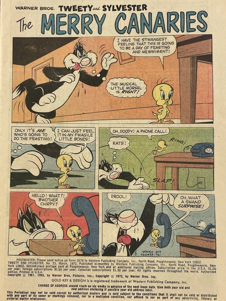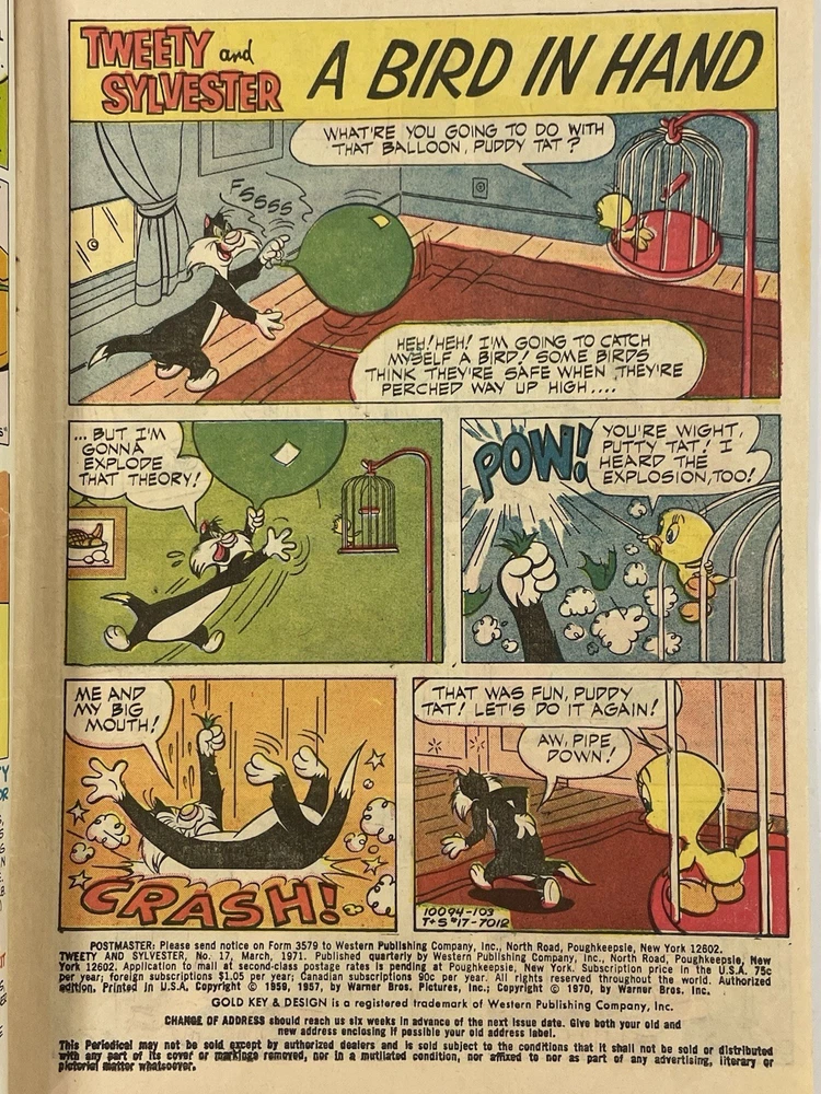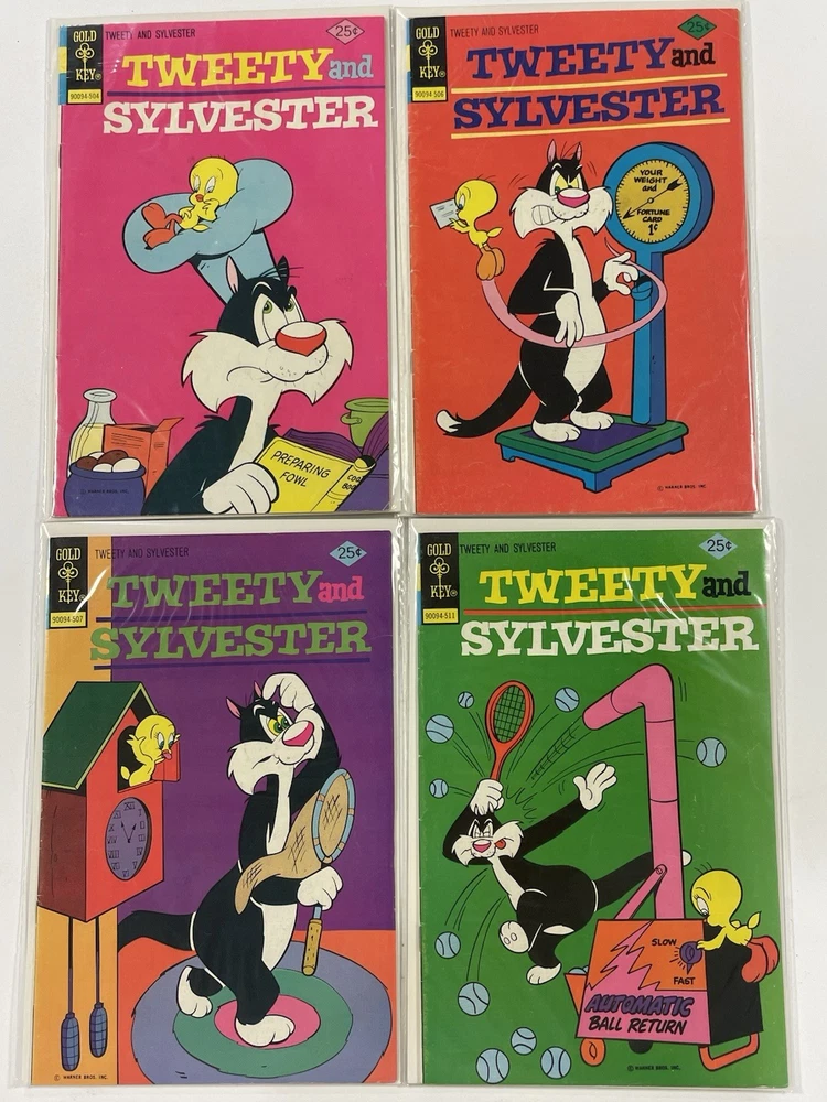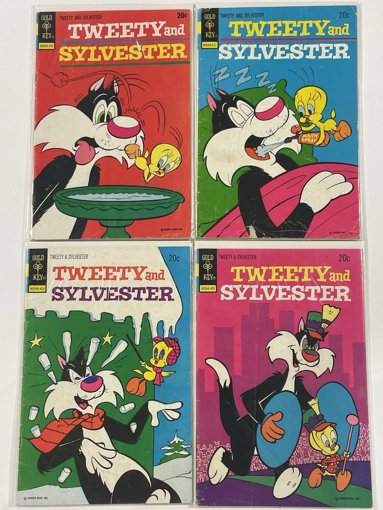 Laughs with Tweety and Sylvester. From 1968-1977 List of issues and conditions below: #8 - G/VG or 3.0 #17 - G- or 1.8 #23 - G+ or 2.5 #25 - G or 2.0 #26 - G+ or 2.5 #28 - G+ or 2.5 #29 - G or 2.0 #30 - G+ or 2.5 #34 - Fair or 1.0 #36 - G or 2.0 #37 - VG or 4.0 #38 - VG or 4.0 #39 - VG+ or 4.5 #40 - VG or 4.0 #43 - G or 2.0 #44 - VG or 4.0 #46 - G+ or 2.5 #47 - VG/F or 5.0 #51 - VG or 4.0 #52 - VG or 4.0 - Whitman Variant #53 - G+ or 2.5 #55 - G or 2.0 #56 - F- or 5.5 #57 - VG+ or 4.5 #58 - VG or 4.0 - Whitman Variant #72 - F or 6.0 #73 - VG/F or 5.0
