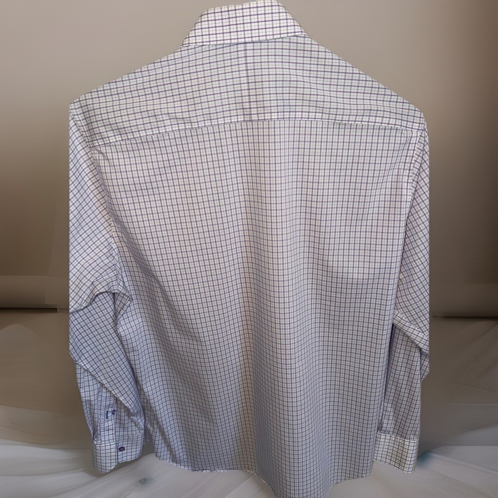 The Twillory shirt is a stylish and sophisticated men's dress shirt designed for business occasions. This purple check shirt features a collared neckline, button closure, and long sleeves with a trim fit. Made with performance fabric, it offers a comfortable and breathable option for the modern man. The shirt is a size 16.5 with a sleeve length of 34/35, suitable for a regular size fit. The spread collar and barrel cuff add a touch of classic style to complete the elegant look of this dress shirt.