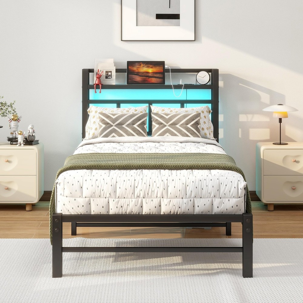 Single Bed Frame with Storage Headboard,Twin Bed Frame with Charging Station and Lights Package contains: 1 x Bed Frame 1 x Charging Station 1 x Lights 1 x Enough Screws 1 x Instruction Manual 【Multi-functional Bed Frame:】The twin lights bed frame supports the headboard RGB lights, from gentle shimmer to party color, steady soft light to constant flashing color light. Multiple bed frame lighting modes create a wonderful ambiance to your liking and make the night colorful! 【Headboard Storage Shelves with Charging Station:】The black twin bed features convenient headboard shelves and charging station,which is easily charge your , , or other gadgets and offering easy access to essentials and extra space to showcase your favorite decor, such as phones, glasses, and books within easy reach. 【Sturdy Metal Slat Platform:】The single bed frame with headboard is made of high-quality metal and multiple legs for stability and durability; offer great mattress . No spring needed. 【Under-Bed Storage: 】Under thoughtfully designed of our metal bed frame,there is a 10.6-inch under-bed storage maximizes space, providing you maximize bedroom space and keep your room neat and tidy for belongings and effortlessly contributing to a neat and organized bedroom. 【Easy to assemble】The twin bed frame with storage comes flat-packed in for easy home assembly.All parts with clearly label,easy to assemble with very clear instructions for installation.the manual for standing towel rack for quick installation. 【Worry 】 Our bed frame come with worry-after-sales with parts. If you have any questions, please feel to ,we will reply to you within 24 hours.