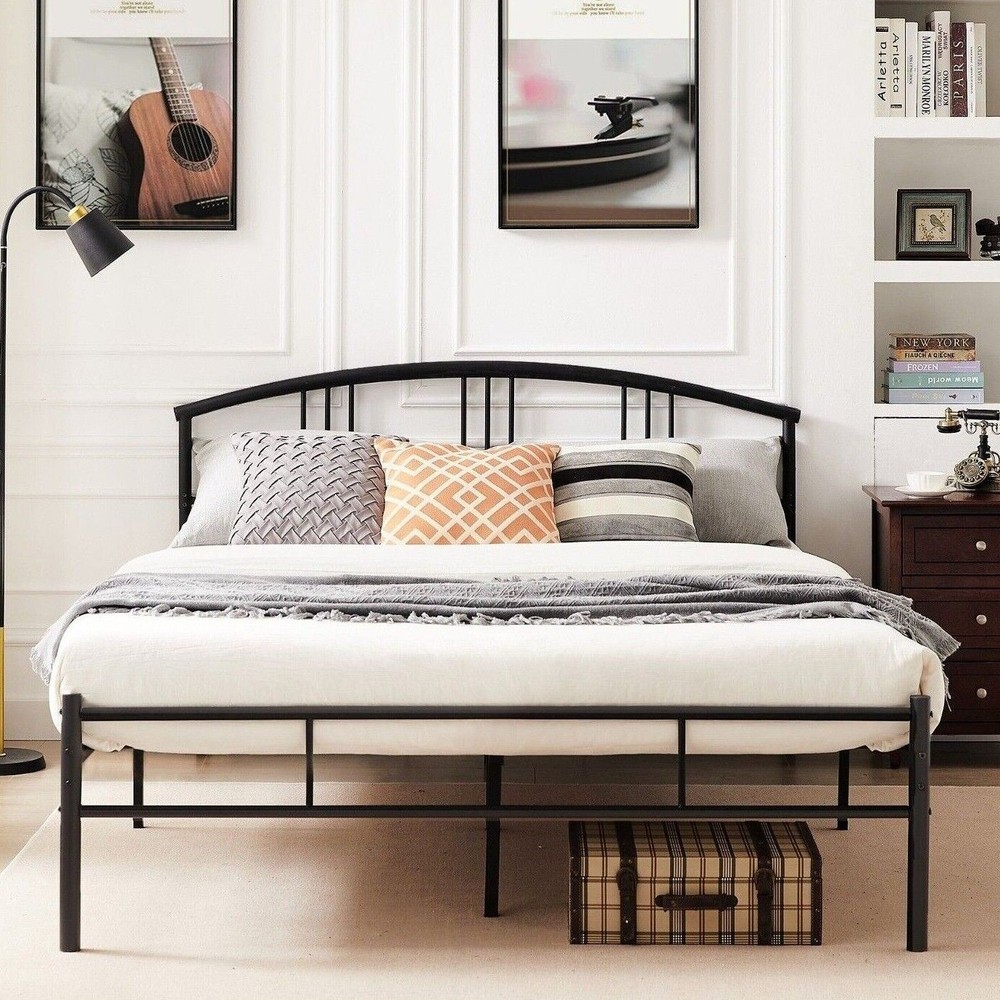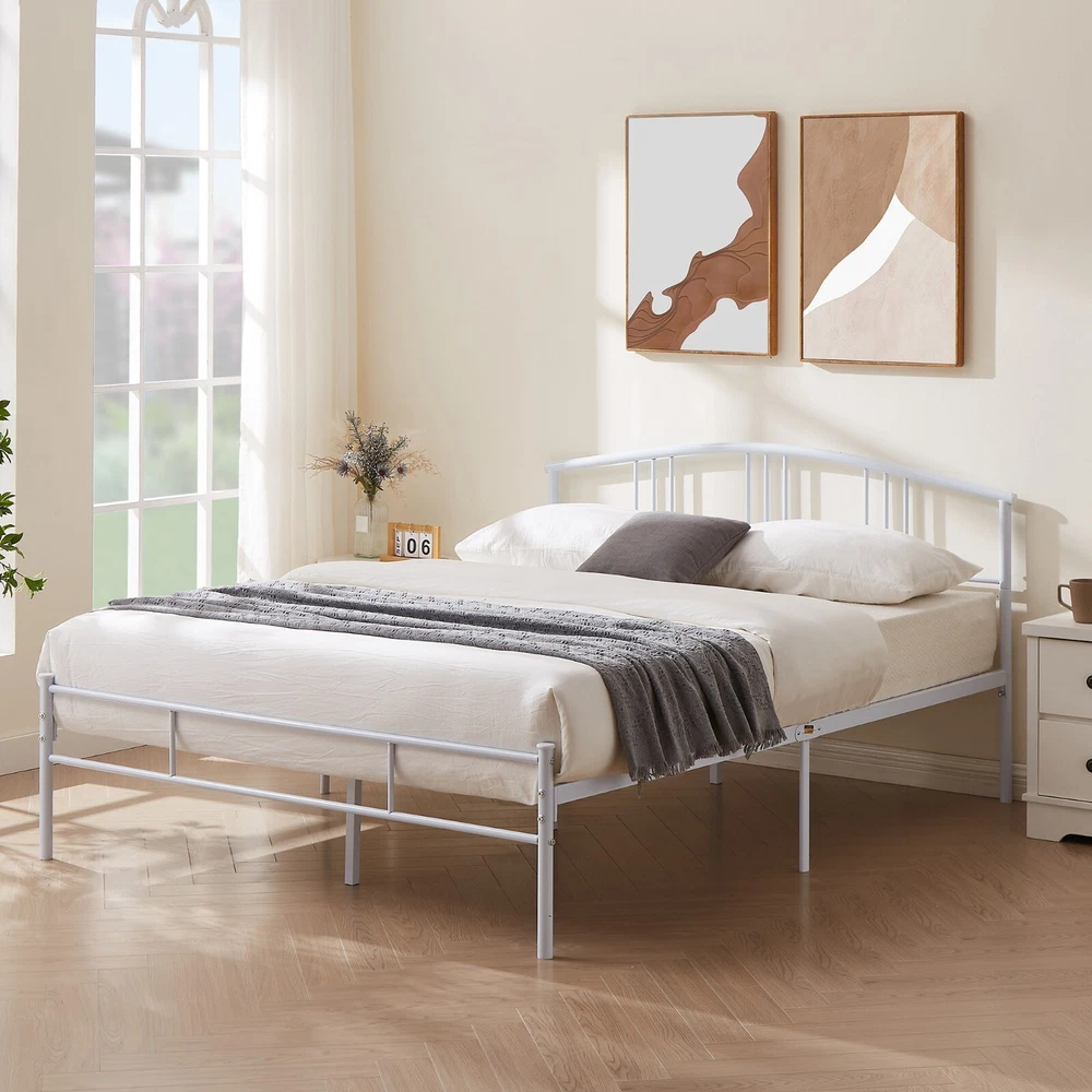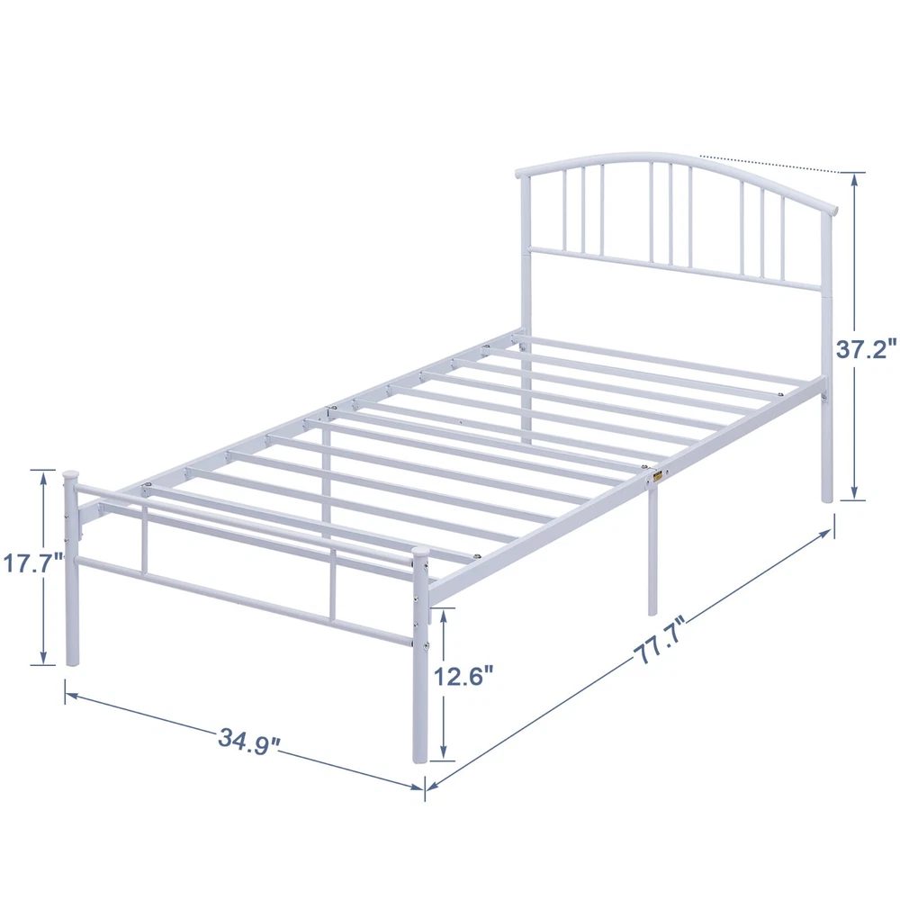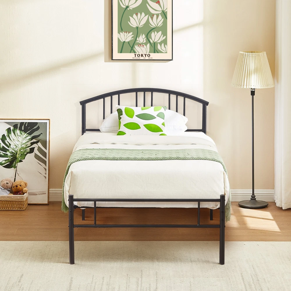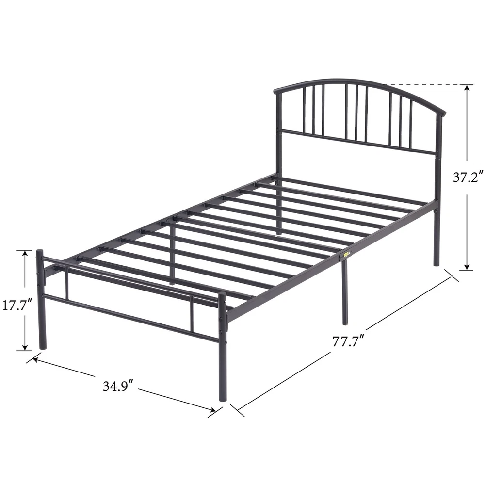 Features 【 Modern Style 】 This bed frame is designed with simple lines, and the curved design is more suitable for all simple decoration styles. The smooth coated surface prevents you from being scratched while sleeping or sitting on the bed. 【 Sturdy Construction 】 The bed frame is constructed of sturdy metal slats, side rails, and 9 solid legs, the metal bed legs are guaranteed for a lifetime of use and the head of the bed frame won't shake. Make sure there is no noise. 【 No Box Springs Needed 】 This bed frame allows your mattress to sit directly on the slats, no box springs required. Extend the life of the mattress and provide you with a comfortable sleeping experience. 【 Storage under the bed 】 12.4 inches of storage space under the bed, which can be used to organize your bedding and some unused tools. Make your room look tidy. 【 Easy to Assemble 】 Everything is included in the package, no additional tools are required, all parts are clearly labeled, one person can easily and quickly assemble and disassemble. Specifications of Twin Size: Material: Metal Frame Overall dimensions: 77.7"L x 39.4"W x 37.2" H Maximum weight capacity: 400 lb Ground clearance: 14'' Twin weight : 29 lb Specifications of Full Size: Material: Metal Frame Overall dimensions: 77.7" L x 54.7"W x 37.2"H Maximum weight capacity: 600 lb Ground clearance: 14'' Full weight : 38 lb Specifications of Queen Size: Material: Metal Frame Overall dimensions: 82.4" L x 60.7"W x 37.2"H Maximum weight capacity: 630 lb Ground clearance: 14'' Queen weight : 40.6 lb Packing list: 1 x Bed Frame 1 x Installation instructions (all accessories included, no need to prepare your own tools) Note: 1. Please allow ±1/0.5'' error due to manual measurement. 2. Mattress, box spring, and bedding (comforter, sheets, pillows, etc.) are NOT included.