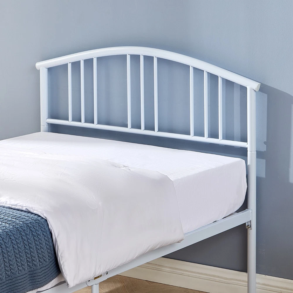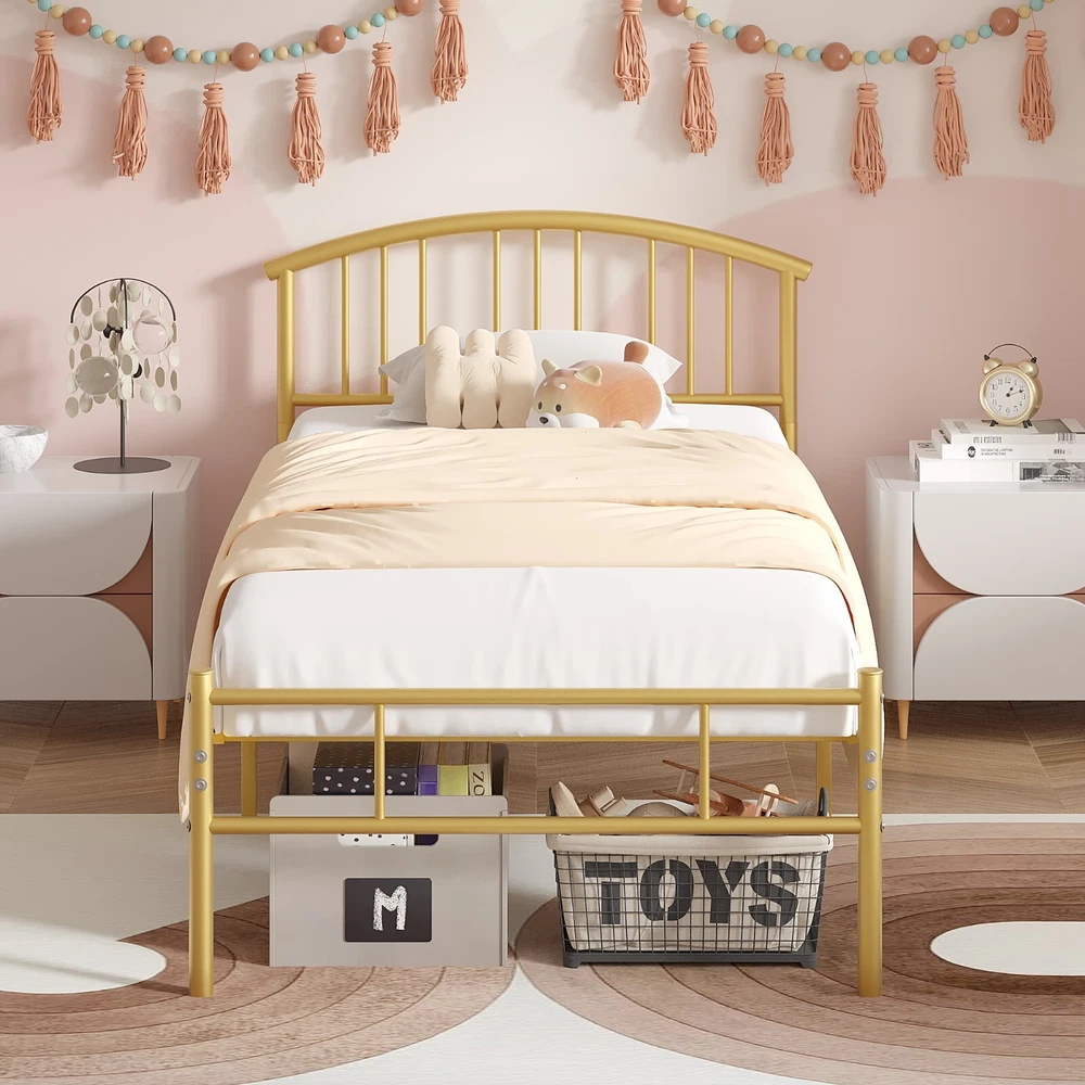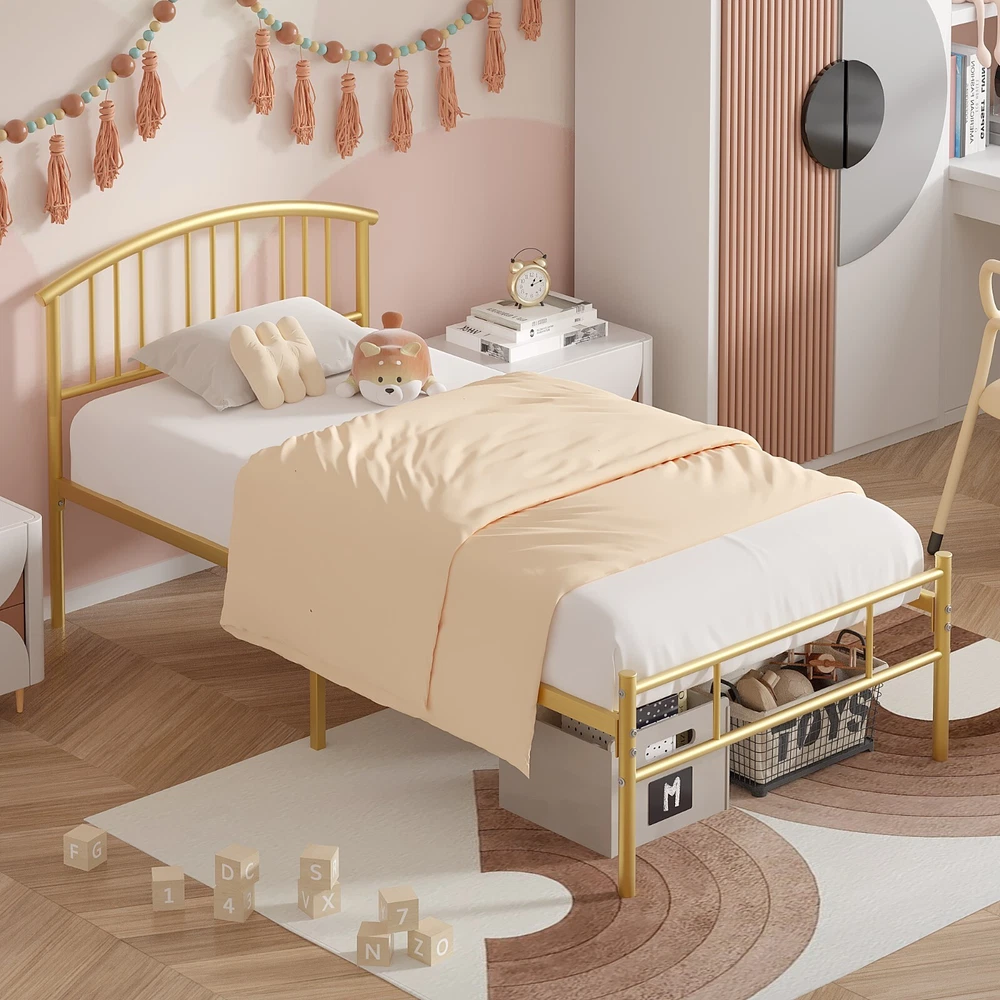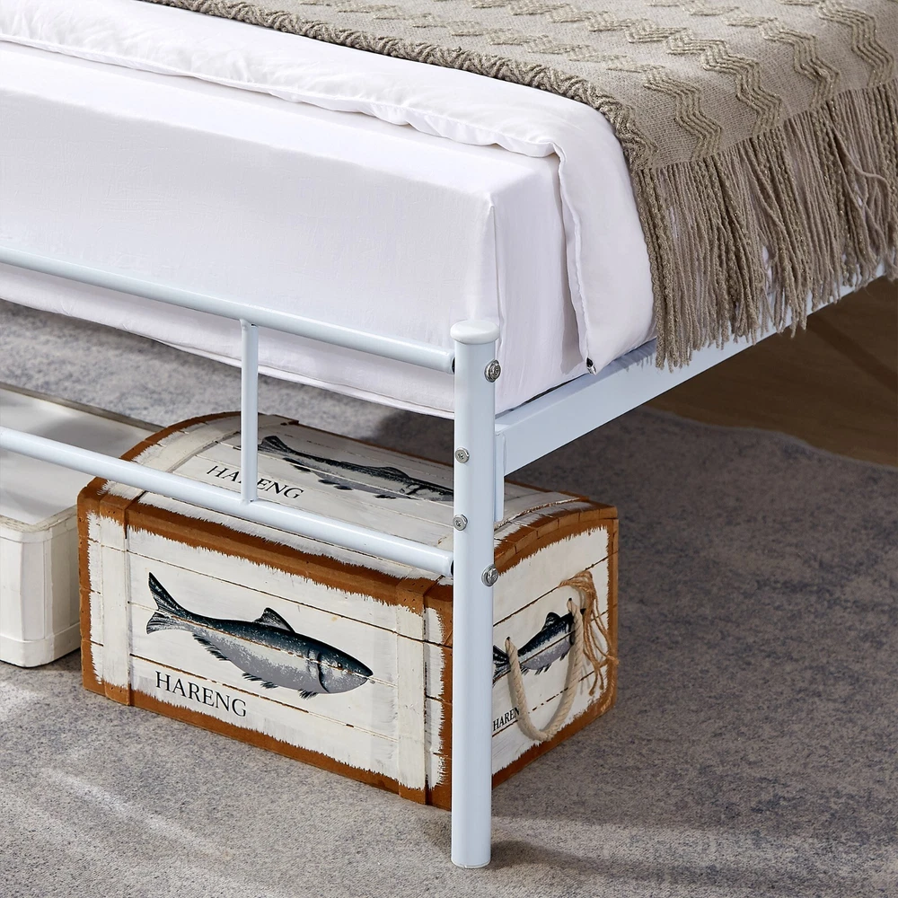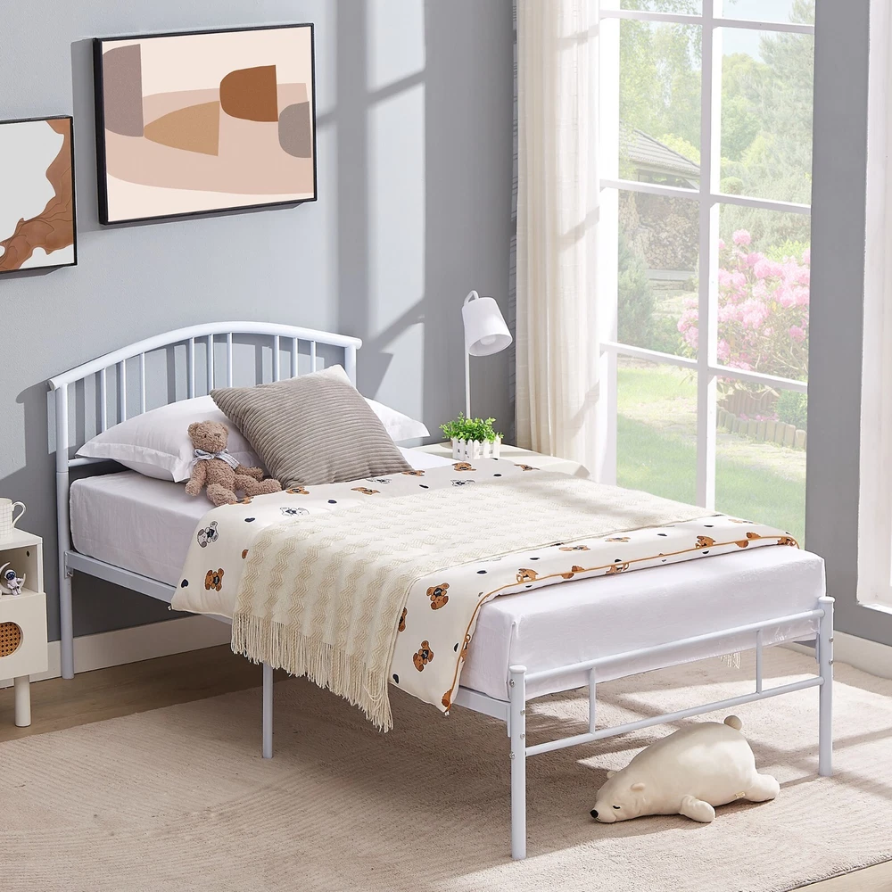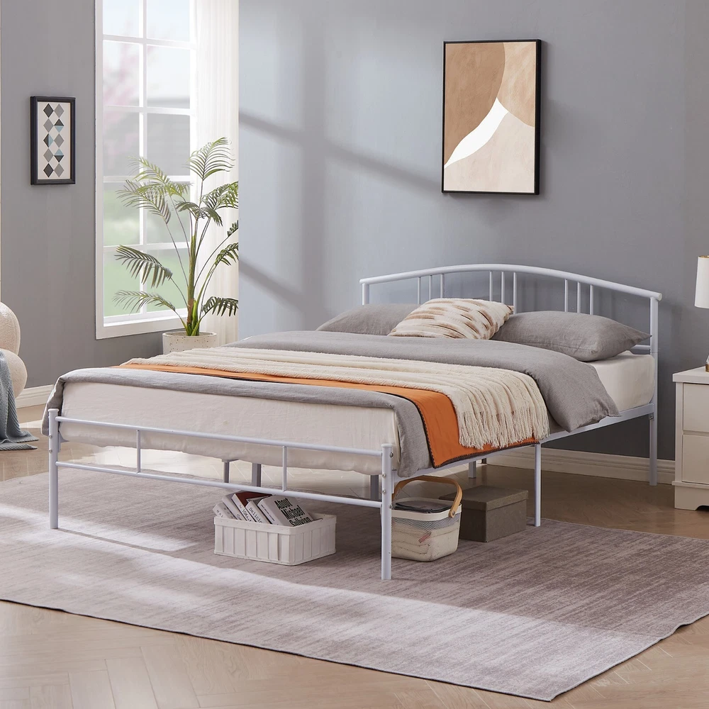 Features 【 Modern Style 】 This bed frame is designed with simple lines, and the curved design is more suitable for all simple decoration styles. The smooth coated surface prevents you from being scratched while sleeping or sitting on the bed. 【 Sturdy Construction 】 The bed frame is constructed of sturdy metal slats, side rails, and 9 solid legs, the metal bed legs are guaranteed for a lifetime of use and the head of the bed frame won't shake. Make sure there is no noise. 【 No Box Springs Needed 】 This bed frame allows your mattress to sit directly on the slats, no box springs required. Extend the life of the mattress and provide you with a comfortable sleeping experience. 【 Storage under the bed 】 12.4 inches of storage space under the bed, which can be used to organize your bedding and some unused tools. Make your room look tidy. 【 Easy to Assemble 】 Everything is included in the package, no additional tools are required, all parts are clearly labeled, one person can easily and quickly assemble and disassemble. Specifications of Twin Size: Material: Metal Frame Overall dimensions: 77.7"L x 39.4"W x 37.2" H Maximum weight capacity: 400 lb Ground clearance: 14'' Twin weight : 29 lb Specifications of Full Size: Material: Metal Frame Overall dimensions: 77.7" L x 54.7"W x 37.2"H Maximum weight capacity: 600 lb Ground clearance: 14'' Full weight : 38 lb Specifications of Queen Size: Material: Metal Frame Overall dimensions: 82.4" L x 60.7"W x 37.2"H Maximum weight capacity: 630 lb Ground clearance: 14'' Queen weight : 40.6 lb Packing list: 1 x Bed Frame 1 x Installation instructions (all accessories included, no need to prepare your own tools) Note: 1. Please allow ±1/0.5'' error due to manual measurement. 2. Mattress, box spring, and bedding (comforter, sheets, pillows, etc.) are NOT included.