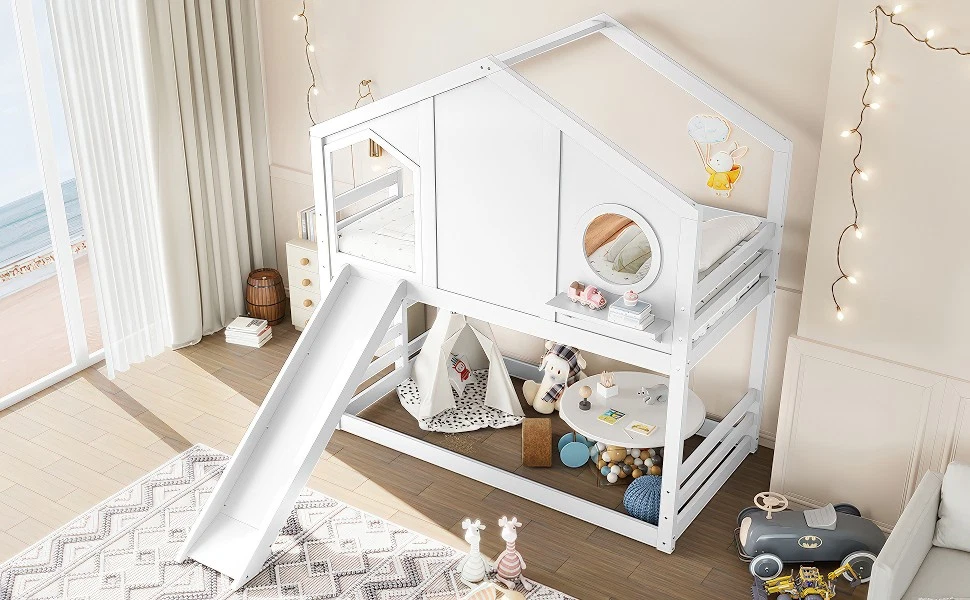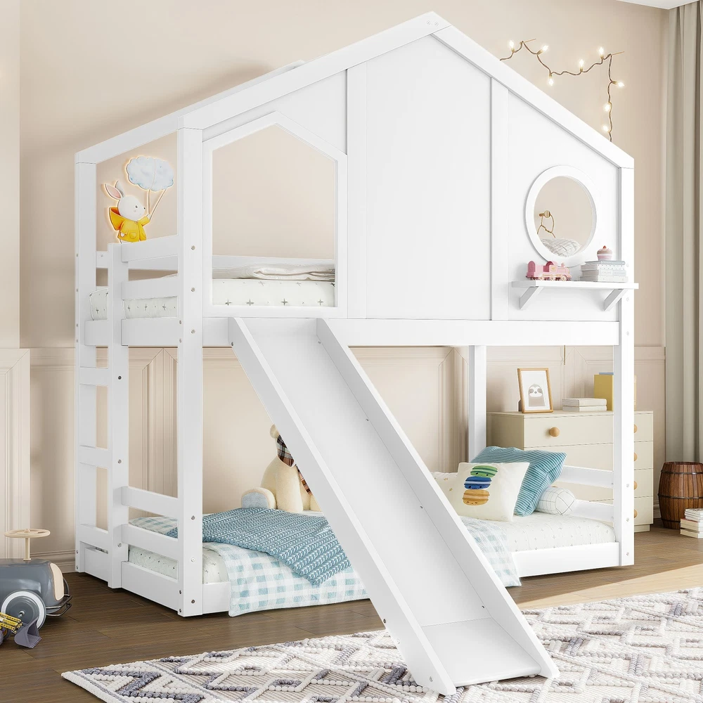 Twin House Bunk Bed w/Slide & Storage Shelves,Wood House Loft Bed w/Window White Features 【Playful House Design for Kids】This twin house bunk bed features a charming roofline and a built-in window, creating a fun and cozy play-and-sleep environment. Its childlike design sparks imagination and makes bedtime more enjoyable for kids. 【Fun Slide for Daily Play】Built with an engaging slide, this house bunk bed adds extra excitement to your child’s room. Kids can start their morning with playful energy, making the bed both a sleeping space and a mini playground. 【Solid Wood Construction】Crafted from high-quality solid wood, this bunk bed is sturdy, durable, and designed for long-term use. The stable frame and reinforced structure ensure a safe and reliable sleeping experience for children. 【Built-in Storage Shelves】Equipped with convenient storage shelves, the bed offers extra space for books, toys, and decorations. It helps keep your child’s room organized while maximizing floor space. 【Easy Assembly with Clear Instructions】All parts, tools, and a step-by-step illustrated manual are included. The straightforward design allows parents to assemble the bed quickly and efficiently. Descriptions Description Bring creativity and practicality together with this twin house bunk bed with slide and storage shelves, the perfect centerpiece for any child’s bedroom. Designed with a charming house-shaped roof and an adorable built-in window, this bunk bed creates a playful and cozy atmosphere where kids can sleep, imagine, and play freely. Kids will love the fun slide, adding excitement to everyday routines and turning their room into a joyful indoor playground. The solid wood construction ensures long-lasting durability and dependable stability, giving parents peace of mind. Along the side, built-in storage shelves offer a smart and accessible place for books, toys, and favorite decorations—helping maintain a clean and organized space. With all tools and detailed instructions included, assembling this child-friendly bunk bed is simple and convenient. Functional, safe, and full of childlike charm, this house bunk bed transforms any room into a warm and imaginative haven for kids. Weight & Dimensions Product Type Wood House Bunk Bed Color White Size Twin over Twin Material Pine Wood+Plywood+MDF Overall Product Dimension 78.7”L*41.3’’W*82.7”H Overall Product Weight 135.36 LBS Recommend Mattress Thickness of Bed 6’’ Weight Capacity 300 LBS for Upper Bed, 11 LBS for Shelf Number of Package 2 Package Dimension & Weight Please refer to the Specification Level of Assembly Full Assembly Needed Eligible for Hardware Packs Yes Country of Origin Vietnam Note All the pictures are taken by actual samples, slight chromatic aberration may occur due to lighting or display.