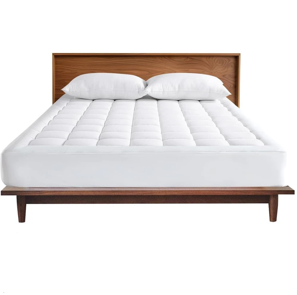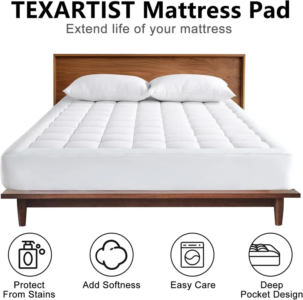 Soft and Comfortable. Overfilled with 4D spiral fiber which traps air that enables the mattress pad to breath and keep its shape longer. Our Quilted Mattress Pad helps your expensive mattress last longer by protecting it from stains and general wear and tear, all while providing you an extra layer of comfort. Breathable and Cool to Touch. Made of high quality materials, the top surface will wick away any moisture or sweat, offering cozy and breathable sleeping environment. Cool and silent protection that doesn't disrupt your valuable sleep, makes you sleep well all night. Deep Pocket and Machine Washable. Deep pocket design effortlessly grips any mattress up to 21" and gives a smooth appearance once you applied. Constructed with beautiful quilted box pattern style to prevent fill from shifting. Tests show that it will keep shape even after more than 109 times machine washing. What You Can Get: Mattress pads are available in Twin 39" x 75", Twin XL /Twin Extra Long 39" x 80", Full 54" x 75", Queen 60" x 80", King 78" x 80" and California King 72" x 84". Customers' satisfaction is our top priority. Open Steps: Since it’s delivered in compressed package, it may look thinner than expected, please do the following steps before use: 1.Take out mattress pad. 2.Shake and pat it. 3.Tumble dry on low heat for 20 minutes. 4.It will take its shape and you will get a soft mattress pad.If you have any issues, please contact us anytime, and we will do our best to resolve them promptly.