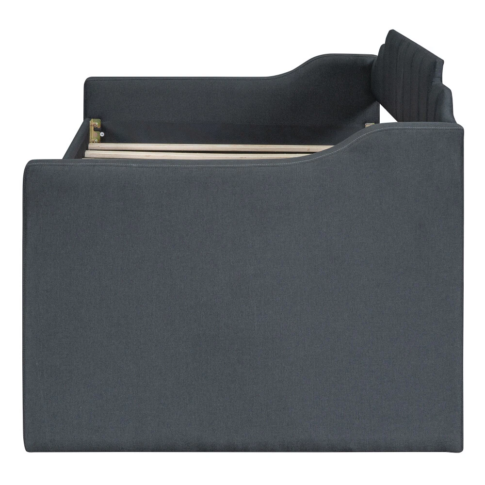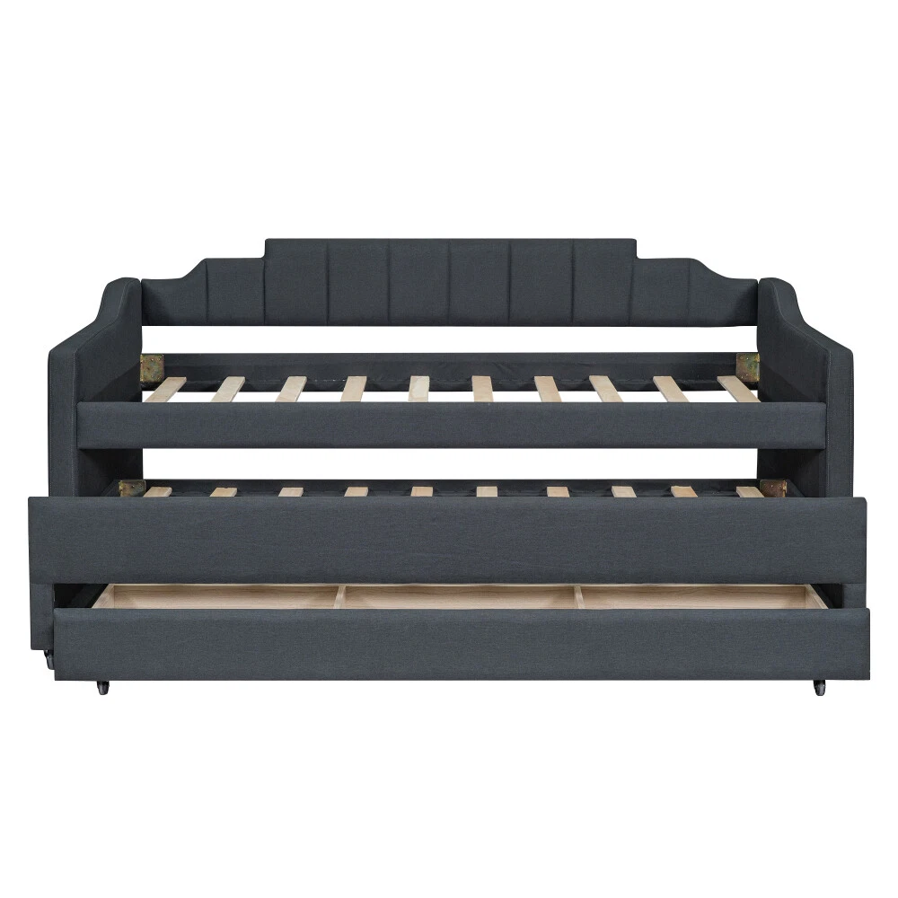 [Simple Design] This daybed with trundle and drawers is designed with a clean silhouette and a hue of elegance. It gives any room a spark of style that's both modern and timeless. [Modern Style] This daybed frame with rails in two sides not only can be a bed to be placed in your bedroom but also is ideal to be a sofa or seat in your living room. [Solid Construction] This daybed is crafted from pine wood and MDF and features a linen-blend upholstery awash in a solid finish.The construction ensures both a lifetime of use, and a sturdy frame with a backrest which won't wobble. [Trundle and Drawers] Best of all, it includes three lower drawers for keeping spare linens, clean clothes, games, and more.And with a trundle for entertaining guests or friends. [Easy Assembly] All parts, tools and instructions are shipped straight to your door in efficiently packed boxes for simple set-up that takes less than an hour with a friend's help. Twin Size Upholstered Daybed with Trundle and Three Drawers,Grey Playing the part of sofa and bed, daybeds are a fantastic solution for smaller spaces (think: studio apartments, guest rooms, home offices, etc.). They offer a cozy spot to curl up with a good book or catch a quick catnap, and they provide convenient sleeping arrangements for overnight guests during sleepovers and beyond. This daybed is crafted from pine wood and MDF and features a linen-blend upholstery awash in a solid finish. Best of all, it includes three lower drawers for keeping spare linens, clean clothes, games, and more.And with a trundle for entertaining guests or friends. Dimensions Overall Product Dimension 81''L*40.8''W*35.5''H Package Dimension Please refer to the Specification Daybed Dimension 75''x39'' Trundle Dimension 74.5''x39'' Total Height 35.5'' Daybed/Trundle Slats 10/10pcs Overall Product Weight 150lb Each Bed Weight Capability 250lb Daybed/Trundle Mattress Thickness 6''