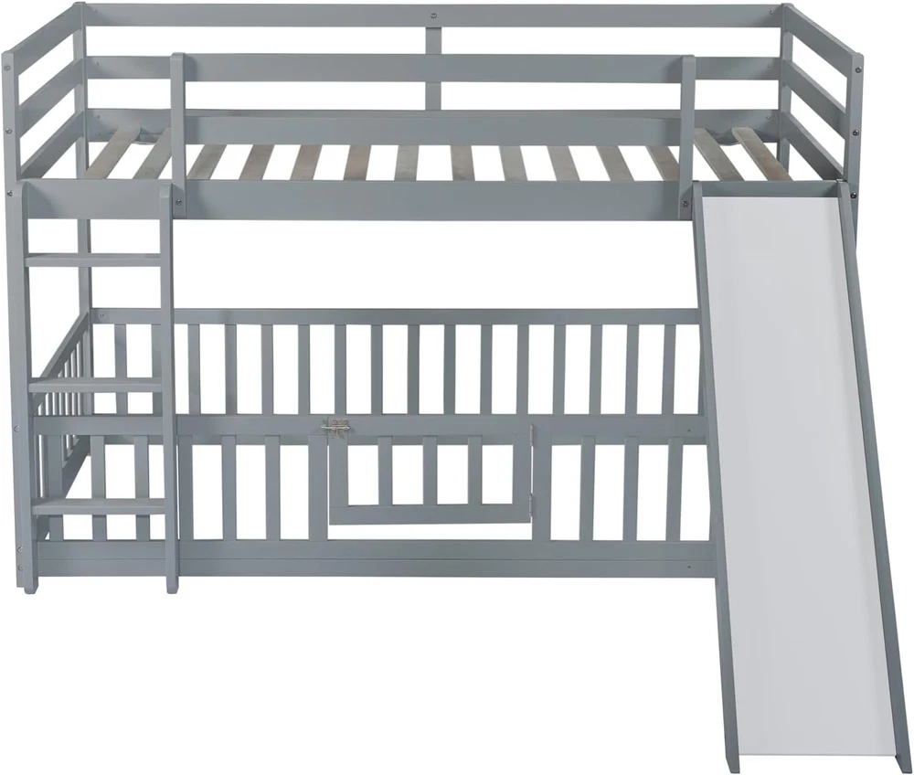 Product Description About this item [Bunk Bed with Slide]This kids bunk bed has built-in ladders and slides, It is not only a bunk bed, but also a kids play place, in addition, the slides and ladders are convertible, they can be placed left or right. [Bunk bed for Kids]- There is no bed slats in the lower bed, it is an open-row design, you can use it as a bed, or a child's play space,reading place and so on. Use your imagination to create your own fun space. [Floor Bunk bed with Fence and Door]: This wooden bunk bed under the bed has a circle of fences, there is a small door that can be opened and closed, which increases the interest of the bed, and the fence is detachable, which is convenient for your various need. [Sturdy and Durable Bed Frame]: Crafted with superior quality solid pine wood bed frame, this slide bunk bed frame is sturdy and solid, sturdy wood construction, no squeaks, and wobbles when you are going up or down. 14 plywood slats for upper bunk, no box spring is needed. [Easy to Assemble Bunk Bed Frame]- Bunk beds with slides do not require spring box or bases. The assembly instructions and required tools are delivered together with the bed frame. It is easy to assemble. It takes about 30 minutes for 2 people to assemble together. Twin over Twin Bunk Bed Bunk Bed with Slide and door If you need extra sleeping space or your family love sleepovers, this Twin Over Twin Bunk Bed is perfect for your home. For added extra fun, slide is included and can be put either left or right. This bed has three different assembly methods, the bottom guardrails and the bottom bed can be took off. Easy Assembly This bunk bed is easy to assemble. This bunk bed is shipped in two packages, so if you receive only one package, please be patient and wait for the later one. Also included is an installation manual and a complete set of necessary hardware to guide you through the assembly process. What's more, this bed has three different assembly methods, you the bottom guardrails and the bottom bed can be took off. 3 colors available Detailed display Convertible Ladder and Slide With built-in ladder, it is easy for you to climb up and down from the top bed. Featuring a low slide for you to play, this bunk bed can add fun to you and develop their sense of balance and coordination. The slide and the ladder are convertible, both of them can be put left or right. Bunk bed with slide This bunk bed comes with a slide that will give your kids room to play right at home, and it's sure to be a lot of fun. With door This wooden bunk bed under the bed has a circle of fences, there is a small door that can be opened and closed, which increases the interest of the bed, and the fence is detachable, which is convenient for your various need. Sturdy and Durable Bed Frame Crafted with superior quality solid pine wood bed frame, this slide bunk bed frame is sturdy and solid, sturdy wood construction, no squeaks, and wobbles when you are going up or down. 14 plywood slats for upper bunk, no box spring is needed. Guardrail height 14.4 inches Detailed specifications Material Pine + Plywood + PB Overall Product Dimension 77.4” x79.3” x 51.8” Number of Bed Slats 14 pcs Recommended Mattress Thickness 6 inches or less Bed Weight Capacity Upper: 250 lbs / Bottom: 250 lbs Overall Product Weight 116.8 lbs Country of Origin Vietnam