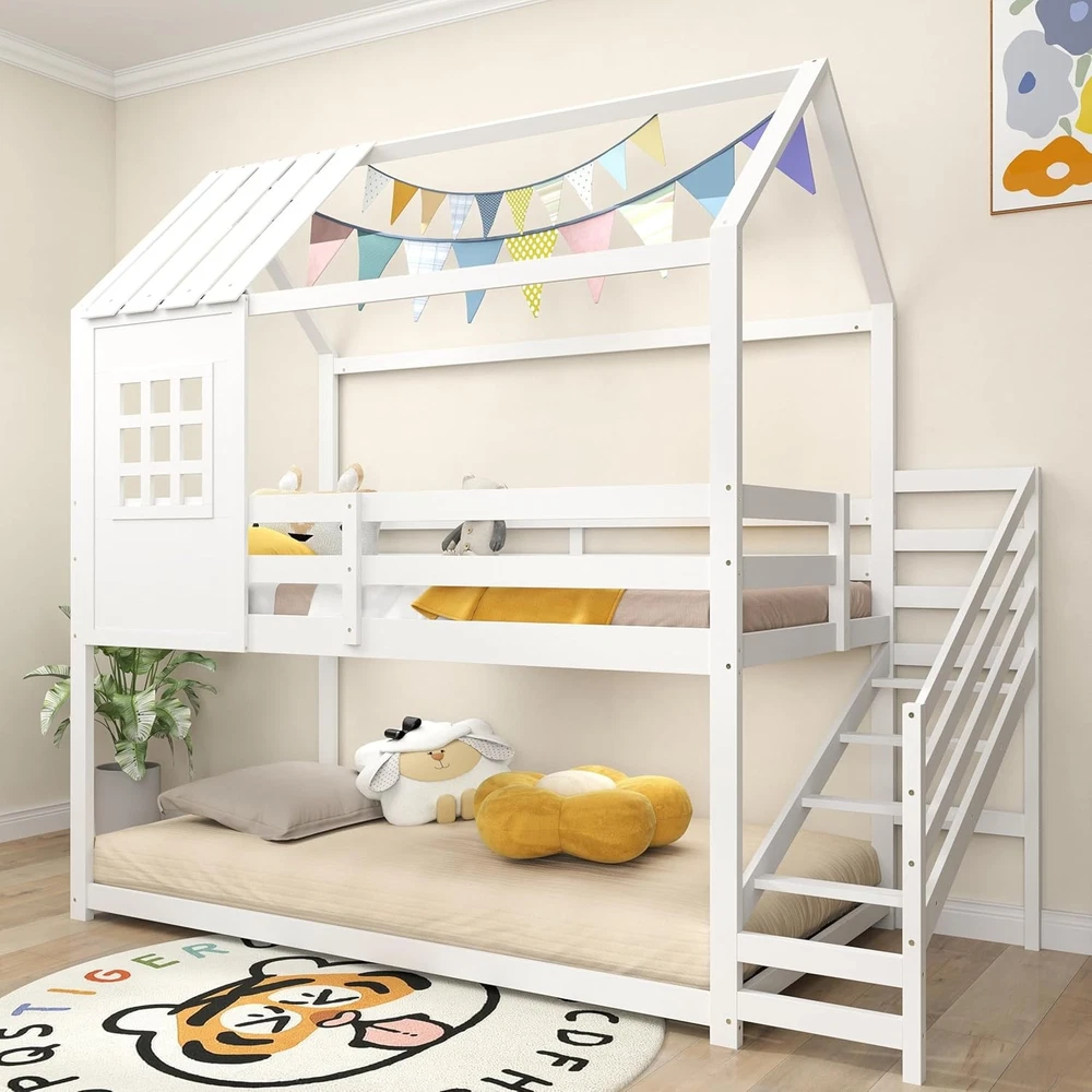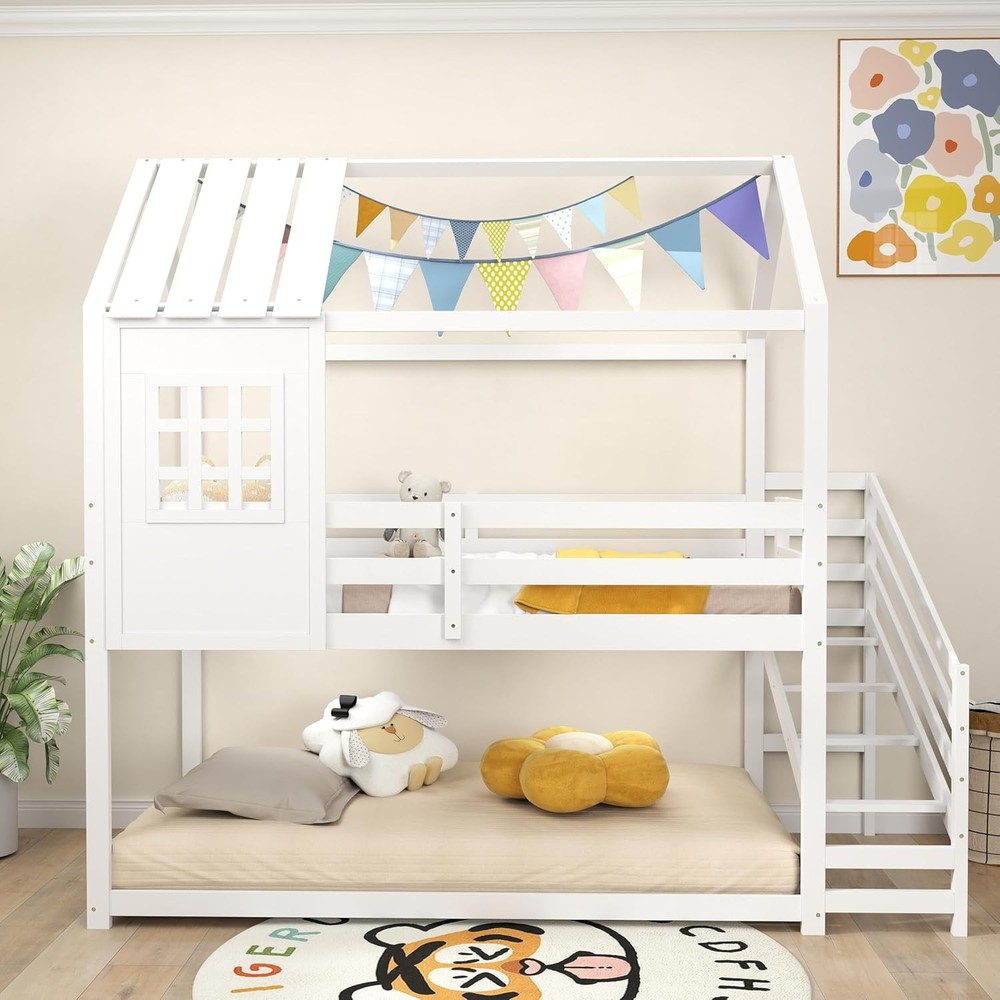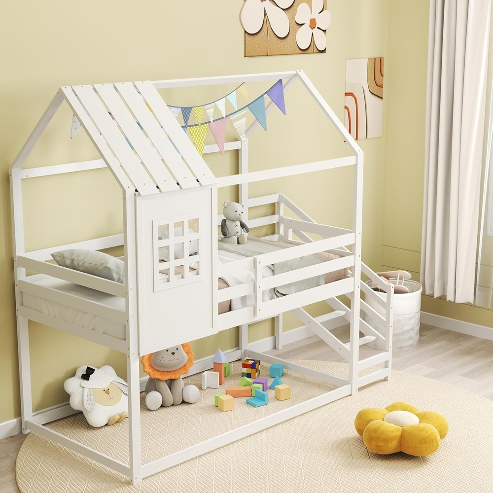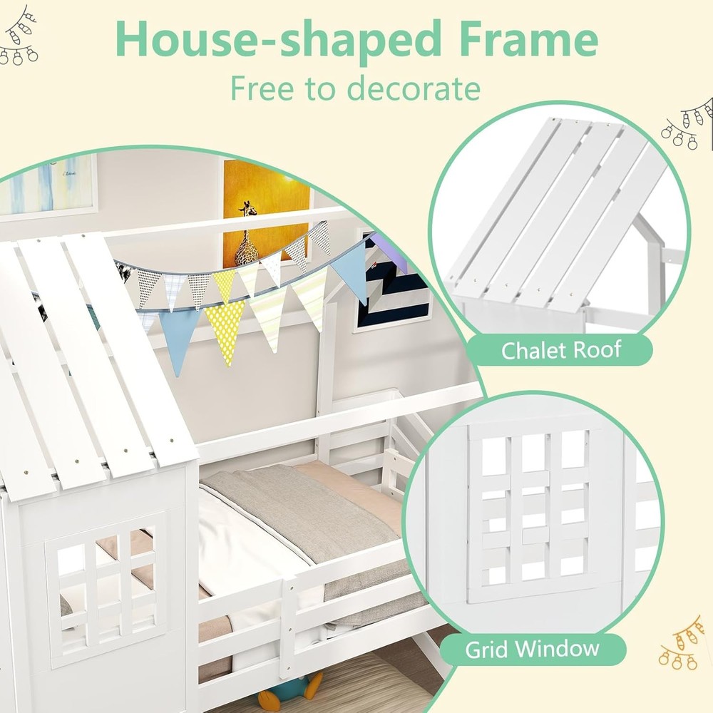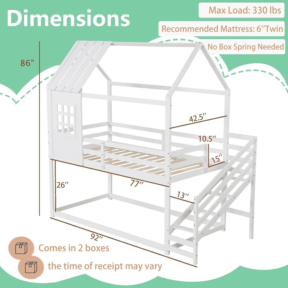 Product Description About this item Creative House Bed: This twin-over-twin bunk bed features a house-shaped frame complete with a roof and window, offering a playful and imaginative sleeping space for children. It can be further enhanced with decorative lights and other items to create a personalized and cozy environment. Versatile Under-Bed Area: The space beneath the upper bunk measures 26” in height. It can be used either as a slat-free floor bed providing an additional sleeping option or as a play center, perfect for storing and organizing kids’ toys and furniture. Sturdy-Built Wooden Frame: Made from solid pine wood and robust plywood, this house bed is built to last. The 14-slat platform boasts the strength to support up to 330 lbs, ensuring stability and safety for children. Safe & Convenient Access: Equipped with 4-step stairs and a full-length safety guardrail, this kids’ bed prioritizes both convenience and safety, making it easy for children to climb up and down while minimizing the risk of falls. Roomy Dimensions: Measuring 92" x 42.5" x 86" (L x W x H), this low loft bed accommodates standard 6" twin size mattresses without the need for a box spring. Coupled with sleek finish, it will be the perfect addition to kids’ rooms. Description Discover the magic of dreamland! Transform your child’s bedroom into a charming cottage with our creative house bed! Designed as a captivating twin-over-twin bunk bed, it features a whimsical house frame with a roof and window, perfect for inspiring playful imaginations. Underneath lies a versatile space perfect for sleeping or playtime adventures, easily customized with lights and decorative items for a personal touch. Crafted with sturdy pine wood and strong enough to support up to 330 lbs, this bunk bed ensures safety with a solid 14-slat platform and a handy 4-step ladder guarded by a full-length rail. Fits standard twin mattresses and adds a sleek, magical touch to any room, no box spring required! Make bedtime exciting and safe with this enchanting loft bed! Feature Decorative house frame with roof and window enhances the appeal Upper bunk with 14 sturdy plywood slats can support up to 330 lbs Surrounded by full-length safety guardrail to prevent falling accidents 4-step stairs with guardrail ensure easy access to the upper bunk 26” under-bed space serves different purposes, like sleeping or playing Crafted from high-quality wooden material for long-lasting support Space-efficient design makes it suitable for smaller rooms Specification Color: White Material: Pine Wood, Plywood, MDF Overall Dimensions: 92" x 42.5" x 86" (L x W x H) Height of Guardrails: 10.5" Height of Under-bed Space: 26" Width of Ladder: 13" Weight Capacity: 330 lbs Net Weight: 108 lbs Package Includes: 1 x House Bunk Bed 1 x User Manual