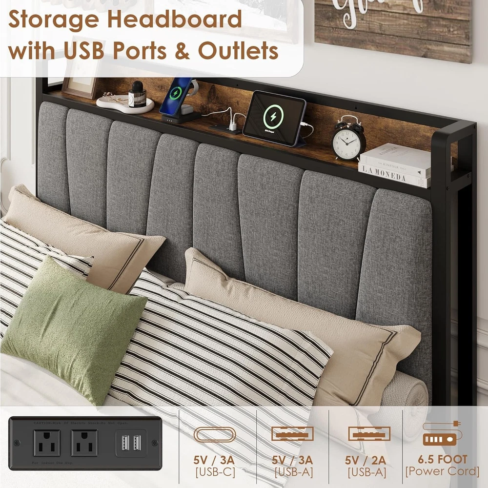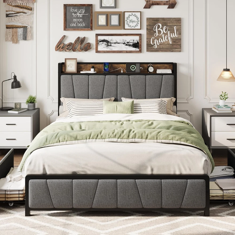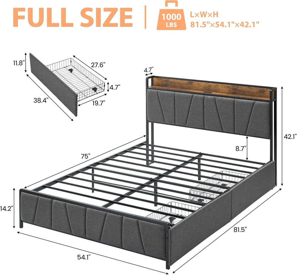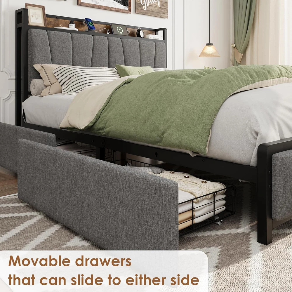 Product description 【Storage Headboard with Charging Station】This bed frame with storage headboard allows you to easily store small items such as phones, glasses and books. It is equipped with 2 USB ports and 1 Type-C port, providing a maximum of 5v/3a for fast charging efficiency. The linen upholstered headboard not only adds a stylish touch to your room, but also allows you to comfortably lean back to read books or use your phone. 【Twin Size Bed Frame with 2 Storage Drawers】This bed frame comes with 2 spacious storage drawers with smooth wheels, perfect for storing clothes or bedding. The screw lock prevents the drawers from sliding out. Additionally, the extra 10.6-inch space under the bed can be used to store shoes, boxes, or suitcases, making the most of the under bed space. 【Ideal for Placement Against the Wall】You have the flexibility to choose the placement of the two drawers under the bed. Placing both drawers on one side allows the other side to be placed against the wall, avoiding wasted drawer space. This feature is particularly suitable for families with kids or limited room space, as placing the bed against the wall prevents children from falling off the bed, providing extra safety. 【More Space for Nightstand】If you have a need for nightstand, you can choose to place a drawer on each side of the foot of the bed, as placing drawers at the head of the bed may be obstructed by nightstand. If you have these requirements above, our bed frame is the perfect choice for you. 【Sturdy Structure & Noise-Free】This bed frame is constructed with 12 high-quality metal slats and 8 heavy-duty support legs, ensuring both comfort and stability. It can withstand a maximum weight capacity of 800 pounds. With no need for a box spring and the use of noise-reducing cotton, you can enjoy a quiet and comfortable sleeping environment. 【Easy Assembly】All the parts and tools of our platform bed frame are marked out in the manual. Clear assembly instruction helps people with zero assembly experience. It only takes around 60 minutes to complete the installation. Any problems with this bed frame, please feel free to contact us, we will provide you with 24 hours professional customer service. Twin/Twin-XL Size Bed Frame with 2 Storage Drawers Twin Size Bed Frame with 2 Storage Drawers and Charging Station Charging Station with USB Ports & Outlets Soft Linen Backrest The comfortable Linen backrest has a soft fexture, is resistant to sinking, and offers great bounce. The bed has stable frame with noise-free design & easy to install. Functions 1 2 Large Drawers 2 Stable Frame 3 Under-Bed Storage A Gift for Kids Specification Size Option TWIN/TWIN-XL/FULL/QUEEN/KING Fabric Linen Drawers 2 (Can be placed anywhere) Charging Station Yes Noise Free Yes Easy to Install Yes All Day Customer Serivice Yes Color Yes GAOMON High Quality Bed Frames Customer Reviews 4.0 out of 5 stars 1 — 4.0 out of 5 stars 2 4.8 out of 5 stars 23 Price $99.99 $ 99 . 99 $221.07 $ 221 . 07 — $169.99 $ 169 . 99 Color Pink / White White / Grey White / Grey Pink / White / Blue Available Size Twin Full / Queen / King Full / Queen / King Twin/Twin XL/Full Soft Headboard Charging Station Storage Drawer Easy to Assemble Noise Free Weight Capacity 1000 lbs 1000 lbs 1000 lbs 1000 lbs From the brand Gaomon is committed to creating a comfortable residence for customers that meets their style and needs space. We pursue excellent craftsmanship quality and fashionable design, integrating them with modern aesthetics to give customers diverse choices and unparalleled value and satisfaction. GaoMon hopes to become the first choice channel for customers to find ideal furniture while pursuing a high-quality life road brand. Farmhouse Cabinet Bed Frame Makeup Vanity Farmhouse Console Table Bathroom Storage Series What is our brand value? our mission is to improve people's living spaces and improve their overall quality of life. What is the direction of our efforts? GAOMON is committed to creating a comfortable living space for customers that suits their personal style and needs. What is our pursuit? We pursue excellent craftsmanship quality and fashionable design, integrating them with modern aesthetics to give customers diverse choices and unparalleled value and satisfaction.
