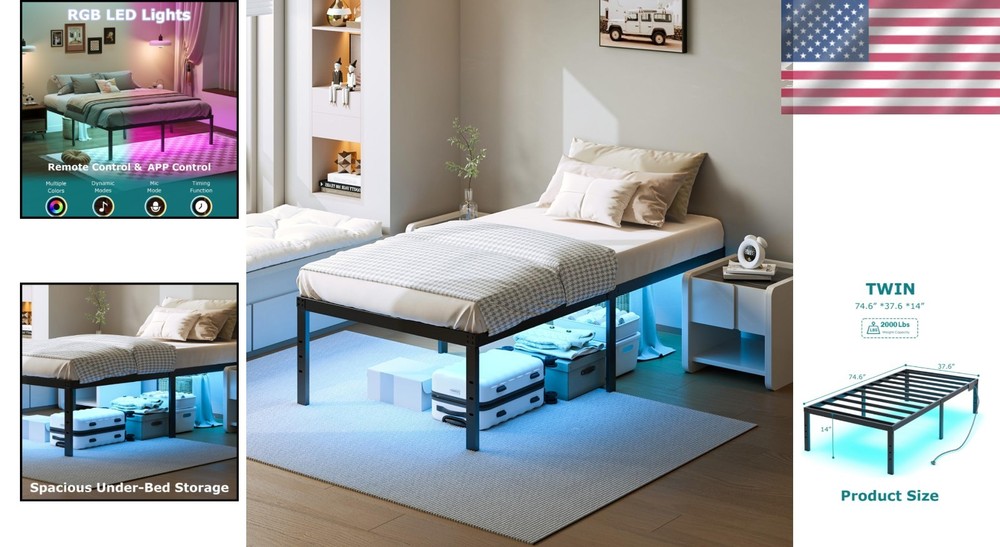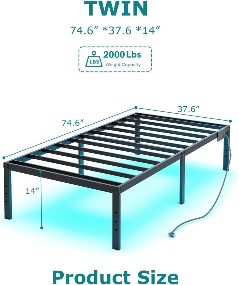 Twin Size Bed Frame w/LED Light & Charging Station Heavy Duty Metal Platform Bed ‹ › ‹ › ‹ › ‹ › ‹ › ‹ › ‹ › ‹ › Twin Size Bed Frame with LED Light & Charging Station Transform your bedroom into a sanctuary of elegance and convenience with our exquisite twin size bed frame. Features: Built-in Charging Station: Comes equipped with 1 standard AC outlet and 2 USB ports (1 Type-A + 1 Type-C), paired with a 6-foot power cord for seamless charging of your devices right beside you. LED Lighting: Set the mood in your room with app or remote controlled LED lights. Adjust brightness, color, and dynamic modes, including music-sync rhythm effects, to elevate your ambiance. Noiseless Construction: Engineered with reinforced metal slats to ensure rock-solid stability without any squeaks or creaks, providing the ultimate support without a box spring. Easy Assembly: Enjoy a hassle-free setup with our integrated design and pre-labeled parts, allowing you to assemble your new bed frame in under 30 minutes. Spacious Under-Bed Storage: Maximize your bedroom space with ample clearance for storing bins, luggage, or spare bedding, ensuring your space remains tidy and organized. Benefits: Elevate the aesthetics of your bedroom with stylish LED lighting. Keep your devices charged and within , minimizing clutter. Experience unwavering stability and comfort with a heavy-duty construction. Effortlessly assemble your bed frame with straightforward instructions. Utilize under-bed space for a tidy living environment. Why Choose Our Twin Size Bed Frame? This bed frame is not merely a piece of furniture; it is a transformative addition to your living space, offering unparalleled style and practicality. Embrace the combination of modern technology and thoughtful design that enhances your lifestyle and elevates your bedroom environment. Don't settle for anything less than the best. Invest in comfort, elegance, and innovation. Order your Twin Size Bed Frame with LED Light & Charging Station today! Shipping Free & Fast Shipping - We offer free shipping to most of the USA with a normal delivery time of 3-7 days. However, due to the current situation, additional delivery time (up to 3 weeks) may be required for some items. Alternative Carriers - We may use alternative carriers (e.g. USPS, FedEx, UPS, etc.) to ensure your package arrives safely and on time. Due to the use of multiple carriers, we are unable to provide a tracking number automatically. Handling Time - Orders are processed and shipped within 1-2 business days of receiving cleared payment. Shipping Restrictions - Shipping to Alaska, Hawaii, Puerto Rico, Guam, and other US territories may incur shipping charges or delivery restrictions. Please contact us before ordering, or your order can be refunded/cancelled. State Restrictions - There may be restrictions based on your state of purchase. For example, certain items may not be shipped to California due to state regulations. Contact for Tracking Updates - If you require tracking updates or have any concerns about the delivery of your order, please feel free to contact us, and we will be happy to assist you. Return 30-Day Hassle-Free Returns - We want you to be completely satisfied with your purchase. If you are not, you can return the item within 30 days of receiving it for a full refund or exchange. Easy Return Process - To start a return, simply contact us and we will provide you with a prepaid return shipping label and detailed instructions. Restocking Fee - There are no restocking fees for returns. However, the buyer is responsible for return shipping costs if the return is not due to a seller's error. Refund Processing Time - Refunds will be processed within 5 business days of receiving the returned item in its condition. Payment We accept all major credit cards, PayPal, and Apple Pay for your convenience. Your payment information is secure and encrypted to ensure a safe and seamless transaction. Please complete your payment within 3 days of purchase to avoid any delays in shipping. Feedback Your feedback is extremely important to us. We strive to provide the best products and customer service possible. If you are satisfied with your purchase, please take a moment to leave us a positive review. If you have any concerns or issues with your order, please contact us before leaving negative feedback. We are committed to resolving any problems and ensuring your satisfaction. Contact Us If you have any questions or concerns, please feel free to out to our customer support team. You can contact us through the eBay messaging system. We are available Monday to Friday, 9:00 am to 5:00 pm EST, and we will do our best to respond to your inquiry within 24 hours. Buy it now and enjoy a pleasant shopping experience! UPC: 7429376528216 Unit Quantity: 1 Number of Items in Set: 1 Assembly Status: Yes Weight Capacity: 2000 pounds Mount Type: Free Standing Indoor/Outdoor: Indoor Voltage: 125V Product: Metal Bed Frame Set Includes: charging station Weight: 10.34 kilograms Compatible Mattress Size: Twin Frame Material: Metal Features: LED Light,Charging Station,Fade Resistant,Squeak Resistant MPN: HCST07221 Department: Adults Type: Metal Bed Frame Color: Black Finish: Powder Coated Item Height: 43.5 in Item Length: 82.5 in Style: Twin Shape: Rectangular Room: Bedroom Item Width: 39 in Item Weight: 10.34 kilograms .