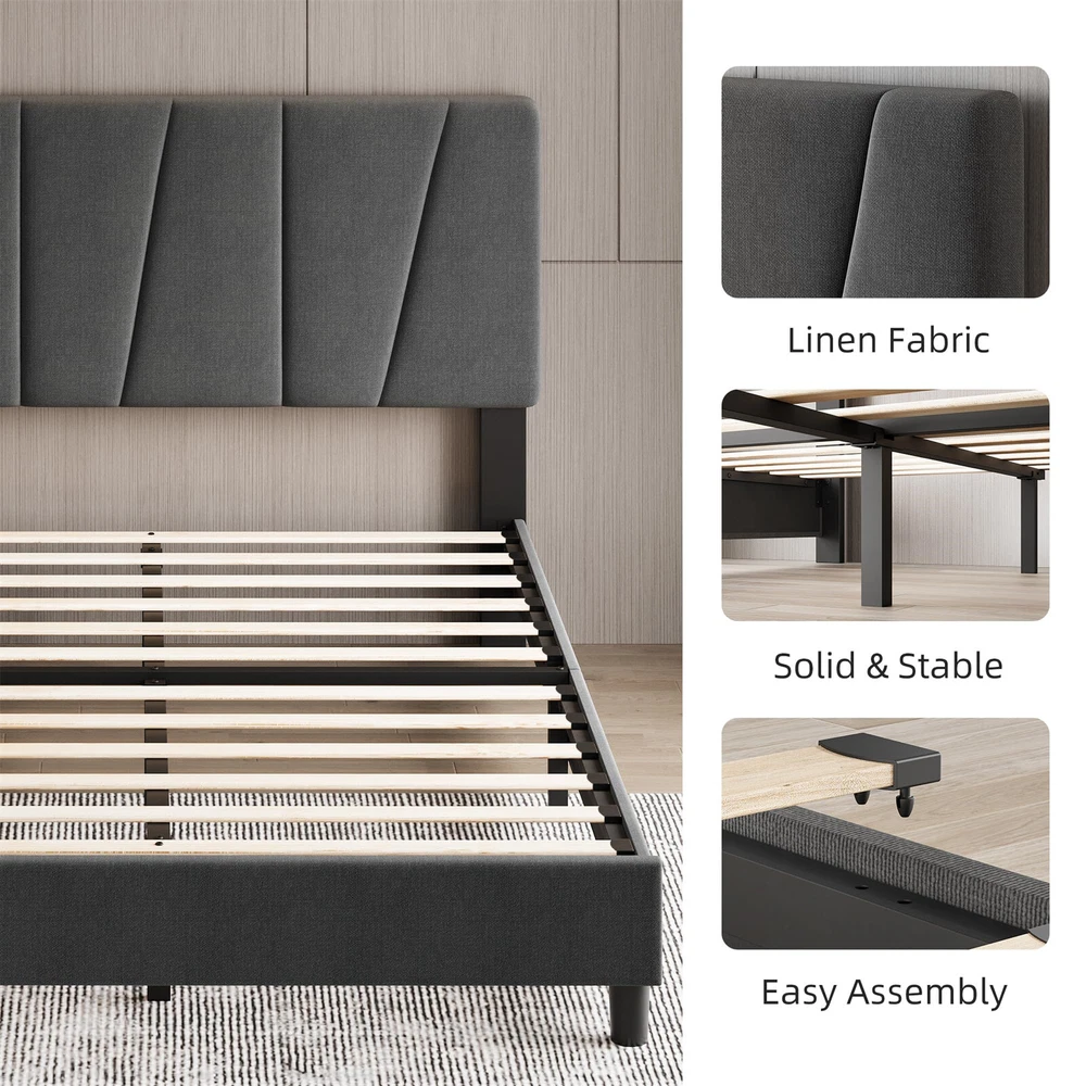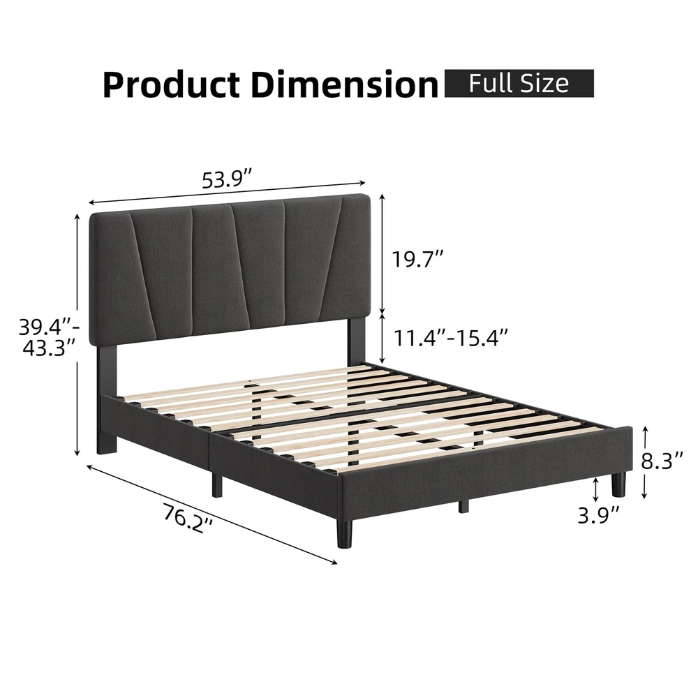 Stylish and Comfortable This Twin bed frame features high-quality linen upholstery on the headboard, wrapped around high elastic memory foam and designed with trendy Diagonal stripes. Not only is it soft and comfortable, but it also perfectly complements any bedroom style. Enjoy a more comfortable and relaxing time when reading or watching TV in bed. Adjustable Headboard The three adjustable headboard heights aim to expand your mattress selection space. It can be adjusted between 39 to 43 inches, allowing you to use mattresses ranging from 8 to 14 inches. Choose the perfect mattress height based on your specific needs and preferences. Sturdy Construction This bed frame is built with high-quality metal and premium wood, featuring an abundance of support legs. The middle leg support helps eliminate sagging and prolong the service life of the mattress. With a maximum weight capacity of 800 pounds, it is durable and can be used for many years. Noise-Free Design With no need for a box spring, our bed frame not only saves you costs but also reduces noise. The use of wooden slats with rubber pads significantly minimizes metal friction noise, providing you with a quiet and comfortable sleeping environment. Easy assembly All the parts and assembly instructions for this bed frame are packed in one package, making it easy for you to find any of the parts. Therefore, it is easy to assemble according to the clear assembly instructions. If you encounter any problems in the assembly process, please contact us promptly, we will reply in 24 hours. Product Description GarveeHome Twin Size Bed Frame Linen Upholstered with 3 Level Height Adjustable Headboard, Noise-Free & Easy Assembly, Grey Height Adjustable Headboard Customize your sleep experience with an adjustable headboard that ranges from 39.4 to 43.3 inches in height. Perfectly fits mattress thicknesses from 8 to 14 inches, allowing you to tailor the twin platform bed to your preference. Strong & Supportive Construction Built with durable wooden slats and a robust metal frame, this twin bed frame offers exceptional support, capable of holding up to 800 pounds. The high-quality materials and construction ensure long-lasting stability and reliability, giving you peace of mind for years to come. Noise-Free & Box Spring-Free Enjoy a peaceful night’s sleep with our noise-free design. Velcro strips between the slats and the frame minimize friction and reduce noise, while the integrated slat system eliminates the need for a box spring. This feature not only saves space but also adds convenience and simplicity to your setup. PRODUCTS SPECIFICATION Box Spring Needed No Suggest Mattress Height 8"-14" Bed Frame Material Linen & Iron & Wood Twin Size 75"L x 39"W x 43.3"H Weight Capacity 800 LBS Package Contain Headboard, Steel Bed Frame, Wood Slats, Assembly Tool Payment Delivery details Terms of sales About us Contact us Payment We accept payment either via PayPal or any of the following credit cards; Visa, MasterCard, Discover, and American Express. Wishing you a happy life! Delivery details We will provide you with the tracking number on the same day or the next day, and transport your package through UPS, DHL, FedEx and other courier methods. If you have any questions, please feel free to contact me and I will do my best to help you solve the problem. Wishing you a happy life! Terms of sales We offer a one month free return and exchange service, and you don't have to bear any losses. We will provide multiple solutions for you to choose from. If you have any questions, please feel free to contact me and I will do my best to help you solve them. We offer a two-year warranty period. If you have any quality issues with the product you purchased within two years, please feel free to contact me. I will provide you with a free replacement service. If you have any questions, please feel free to contact me. I will do my best to help you solve the problem. Wishing you a happy life! About us We are committed to becoming the best eBay seller, with high-quality suppliers, providing the most sincere service, including pre-sales and after-sales service, to give you a satisfactory shopping experience. If you have any questions, please feel free to contact me, and I will do my best to help you solve the problem. Wishing you a happy life! Contact us If you encounter any problems, please contact me by email at the first time, I will provide you with a solution as fast as possible so that I can give you a satisfactory shopping experience, wish you a happy life! Brand GarveeHome Compatible Mattress Size Twin Size Frame Material Wood Type Bed Frame Features Adjustable Headboard, Sturdy TWIN 75"L x 39"W x 43.3"H Maximum Weight Recommendation 800 Pounds Room Bedroom Manufacturer Warranty 5 Years FULL 76.2"L x 53.9"W x 43.3"H QUEEN 80.9"L x 60.2"W x 43.3"H