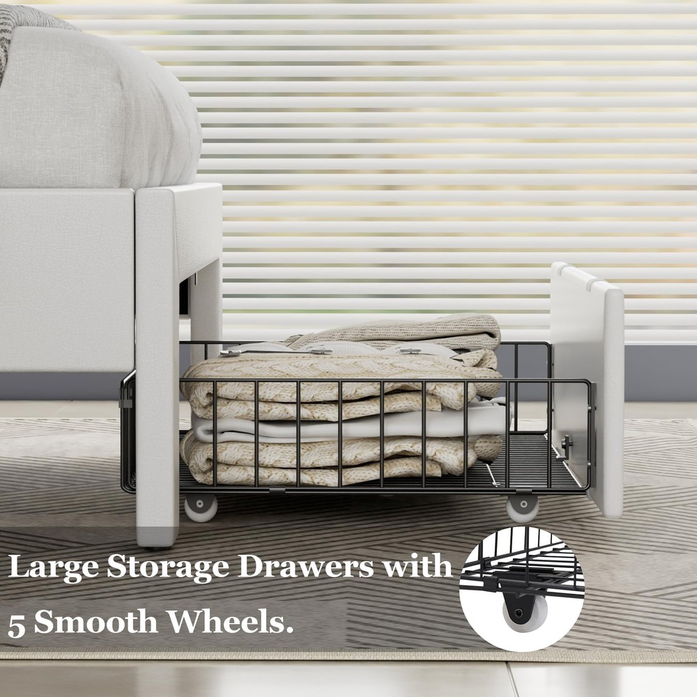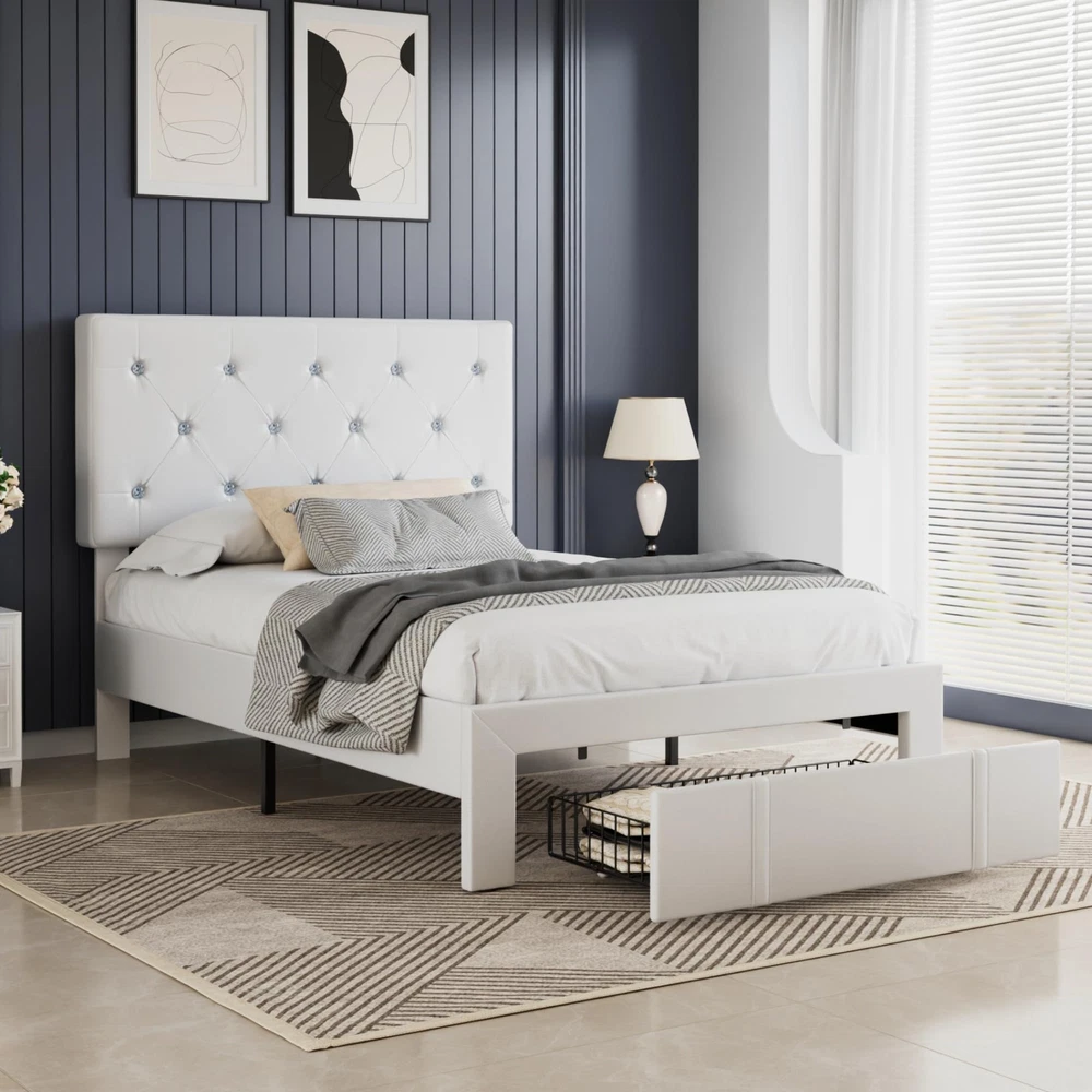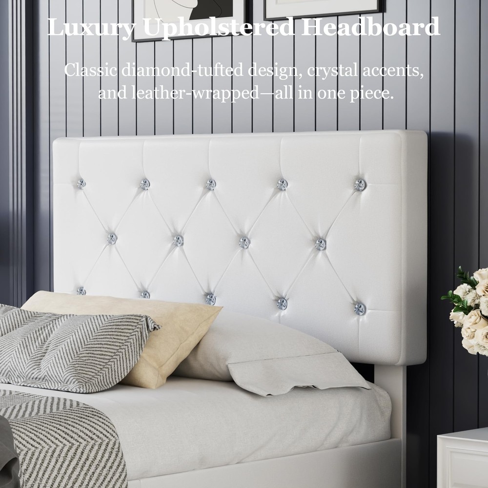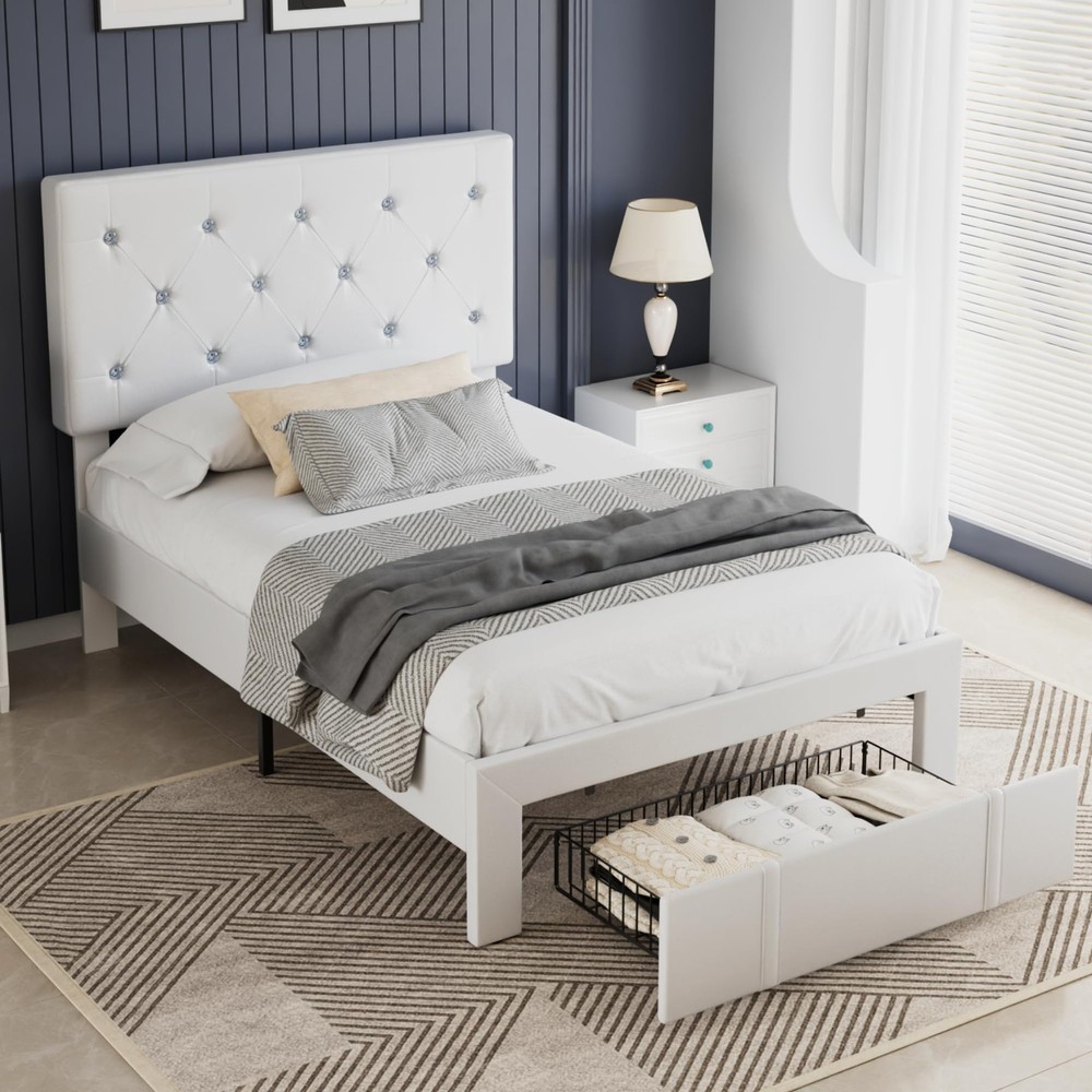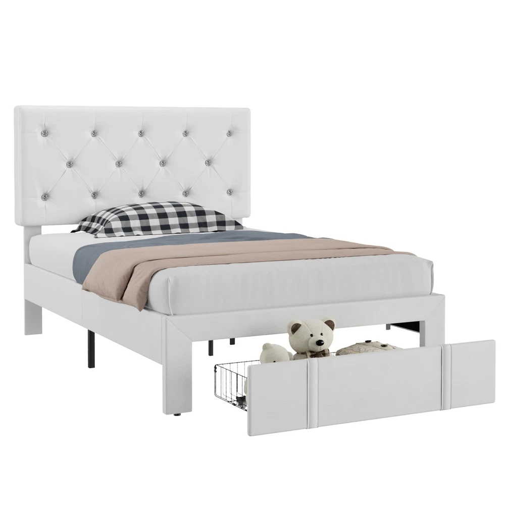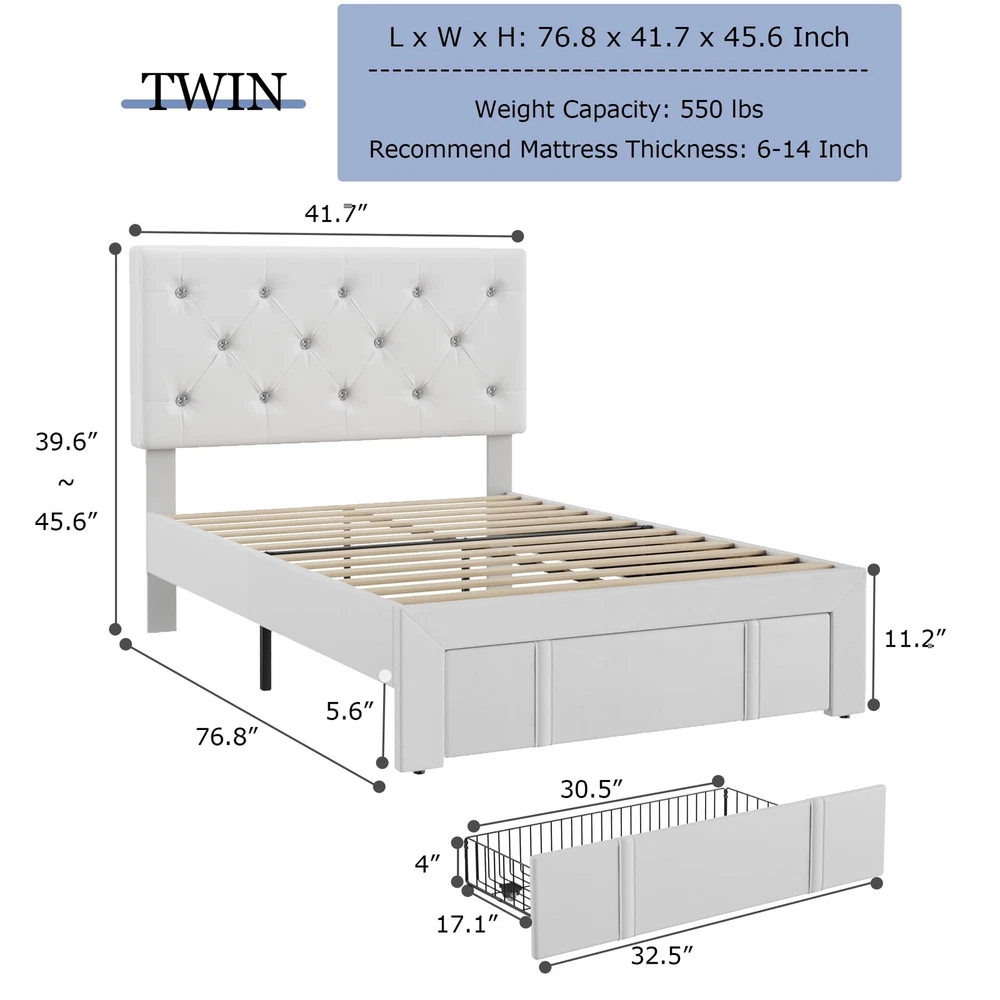 [Stylish and Luxe] - Draped in sleek white faux leather with sparkly diamond accents and tufted detailing, this twin bed frame with storage screams modern elegance. It’s got a stylish look that suits just about any bedroom decor. [Generous Storage Space] - No more clutter! There have 5.5” under-bed space and have a big drawer at the foot of the bed (30” x 17.1” x 4”). They’re perfect for bedding, clothes, or whatever else you need to tuck away, and the drawer is on wheels to make pulling them out a breeze. [Fits Mattresses of Various Thicknesses] - This twin bed frame’s adjustable headboard height (35.7”-43.7”) lets you go with whatever mattress thickness you prefer, from 4” to 12”. So, no more agonizing over mattress specs! [High-Quality Materials and Comfy ] - The twin bed frame with storage is cushioned with high-density foam for ultimate comfort, while the frame’s sturdy wood slats and steel structure ensure it’s here to last. [Easy Assembly and Professional ] - All parts come in and are labeled to make assembly a cinch. the instructions, and you’ll have your storage bed frame ready in under an hour. And if any parts arrive damaged or missing, just hit up, and we’ll you sorted with replacements.