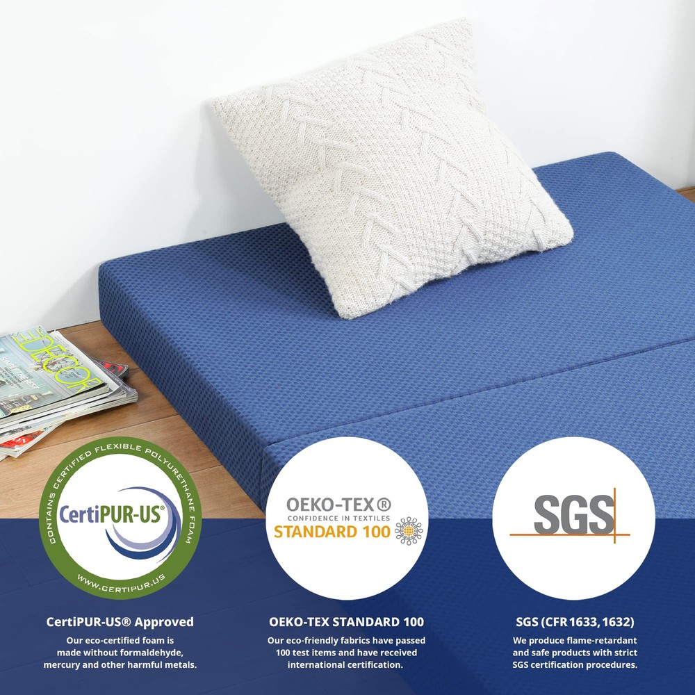 The tri-fold topper is the ideal option for visitors, sleepovers, car trips, camping or dorm room bed. Portable and comfortable topper , no pain in the back or neck when people sleep on it. Complete with supportive memory foam topper providing soothing sleeping. Thickness: 4 inches Complete with supportive memory foam topper providing soothing sleeping Portable and comfortable topper, no pain in the back or neck when people sleep on it. Easily fold it up for storage in a closet in seconds when not in use Smart Package: Our advanced compressed package technology delivers the topper in a box directly to your front door