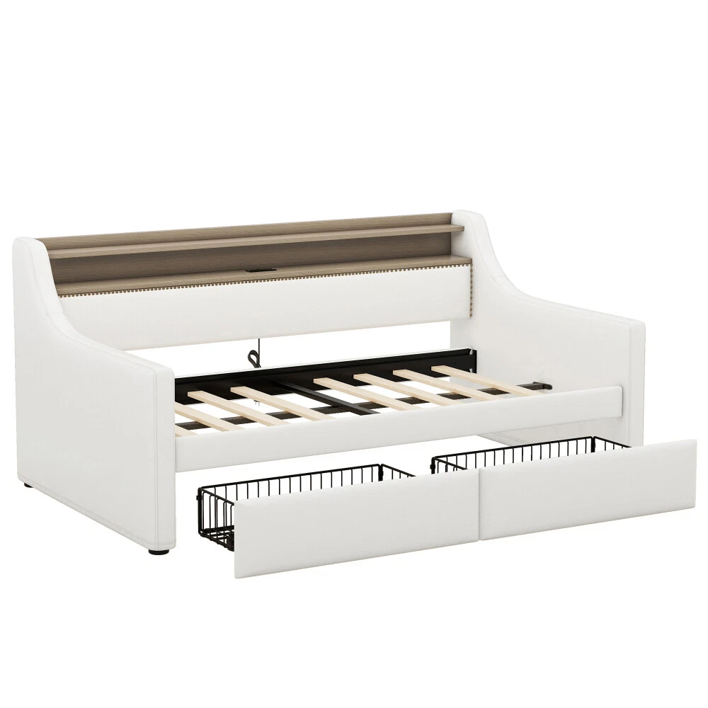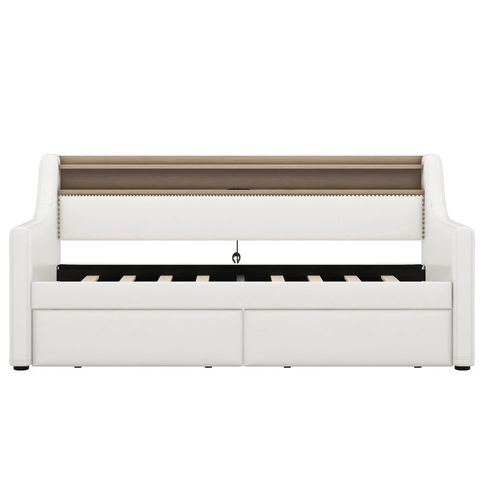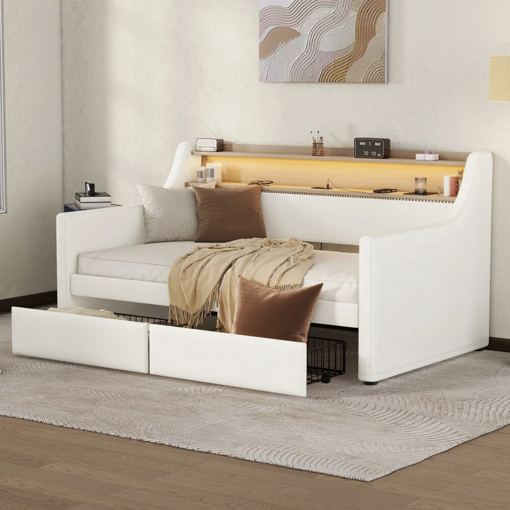 Twin Size Daybed with Drawers, Upholstered with Charging Station & LED Lights Features Stylish and Elegant Design--Our daybed with drawer is made of PU leather. With high backrest which lying more comfortable, two armrests make your hands free. Bronze nail head trim make this twin daybed more stylish and classic. A timeless design concept combined with a thick padded back and four side foam filled makes our daybed stand out from ordinary bed frame and brings you a comfort experience and soft touch. Charging Station--The built-in power socket comes with 2 USB ports and 2 outlets, allowing you to easily charge your electronic device while relaxing your body and mind. LED RGB Light--The LED light with a remote control offers 16 static colors and speed adjust and brightness adjust provide personalized lighting atmosphere for your night. Choose the color you like and completely immerse yourself in the beautiful night time. Storage Headboard--The headboard storage provides you with an extra place to store magazines, phones, beloved photos and decorations which is very practical. 2 Storage Drawers--This twin size daybed frame come with 2 drawers with wheels offers ample space for off-season clothing, bed sheets, etc. keeping your bedroom organized & clutter-free. Durable Frame--Our daybed frame is made of solid MDF and plywood, with dense and strong support to withstand the weight of 330 lbs. Recommend max mattress thickness 8 inch.This sturdy construction ensures that the frame is strong and the backrest will not wobble but also ensures lifetime usage. Description Description Upgrade your room with this simple and modern style, with bronze nailhead for decoration. 2 drawers for storage, with LED light and charging station which will look luxurious in your room. Description & Dimensions Overall Product Dimension 79.5"L x 45.3"W x 36.2"H Size Twin Color White Numbers of Package 2 Overall Product Weight 105.6LBS Weight Capacity 330LBS Mattress Thickness 8" Product Material Leather+MDF Box Spring Required No