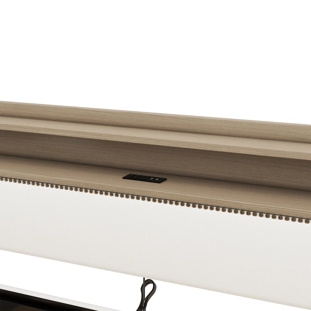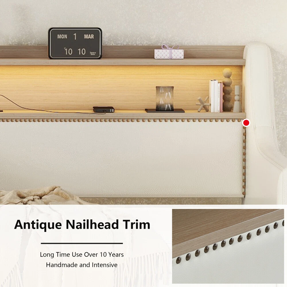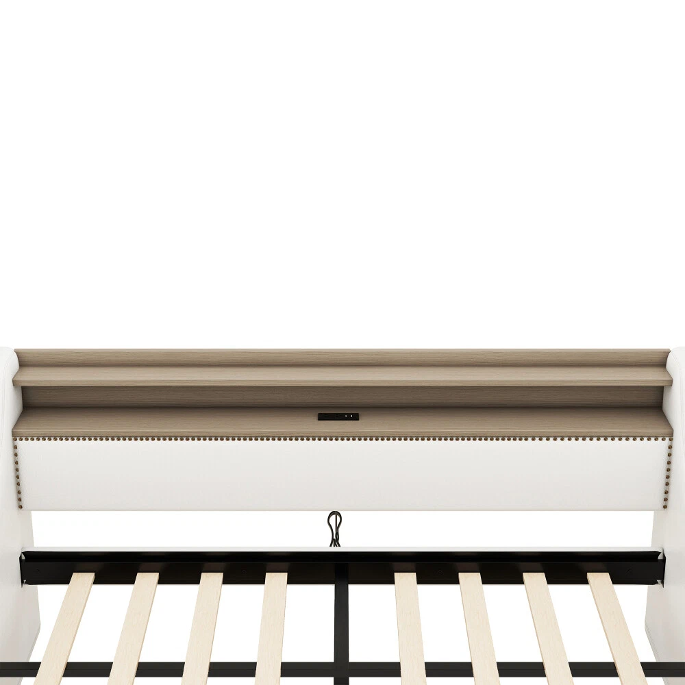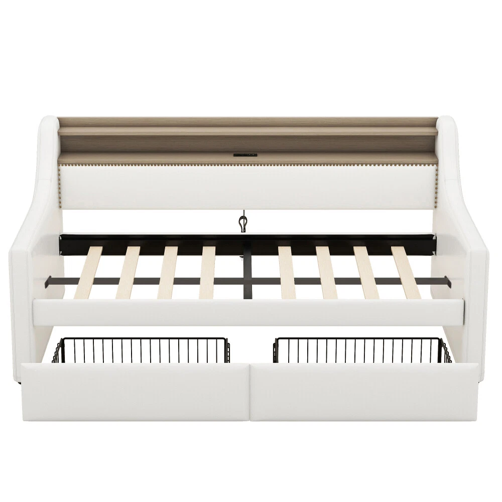 Twin Size Daybed with Drawers, Upholstered with Charging Station & LED Lights Features Stylish and Elegant Design--Our daybed with drawer is made of PU leather. With high backrest which lying more comfortable, two armrests make your hands free. Bronze nail head trim make this twin daybed more stylish and classic. A timeless design concept combined with a thick padded back and four side foam filled makes our daybed stand out from ordinary bed frame and brings you a comfort experience and soft touch. Charging Station--The built-in power socket comes with 2 USB ports and 2 outlets, allowing you to easily charge your electronic device while relaxing your body and mind. LED RGB Light--The LED light with a remote control offers 16 static colors and speed adjust and brightness adjust provide personalized lighting atmosphere for your night. Choose the color you like and completely immerse yourself in the beautiful night time. Storage Headboard--The headboard storage provides you with an extra place to store magazines, phones, beloved photos and decorations which is very practical. 2 Storage Drawers--This twin size daybed frame come with 2 drawers with wheels offers ample space for off-season clothing, bed sheets, etc. keeping your bedroom organized & clutter-free. Durable Frame--Our daybed frame is made of solid MDF and plywood, with dense and strong support to withstand the weight of 330 lbs. Recommend max mattress thickness 8 inch.This sturdy construction ensures that the frame is strong and the backrest will not wobble but also ensures lifetime usage. Description Description Upgrade your room with this simple and modern style, with bronze nailhead for decoration. 2 drawers for storage, with LED light and charging station which will look luxurious in your room. Description & Dimensions Overall Product Dimension 79.5"L x 45.3"W x 36.2"H Size Twin Color White Numbers of Package 2 Overall Product Weight 105.6LBS Weight Capacity 330LBS Mattress Thickness 8" Product Material Leather+MDF Box Spring Required No
