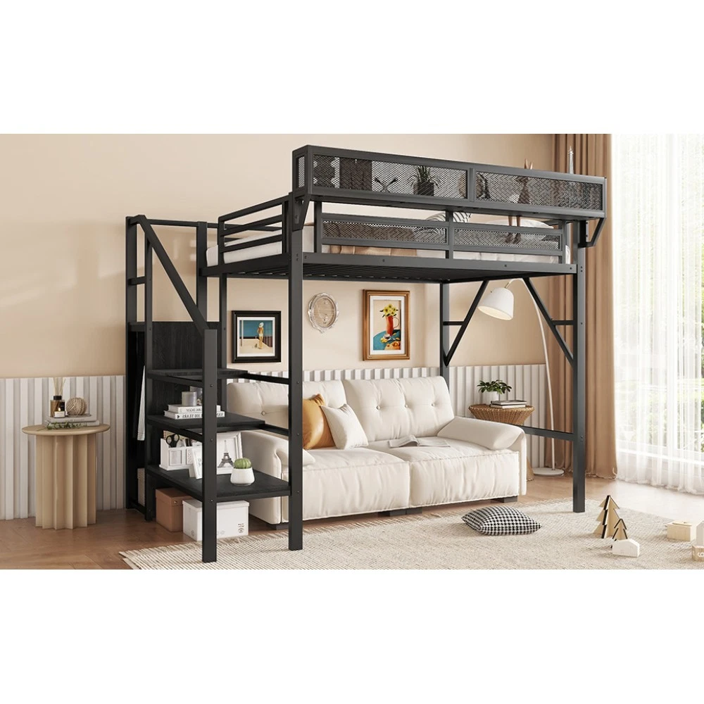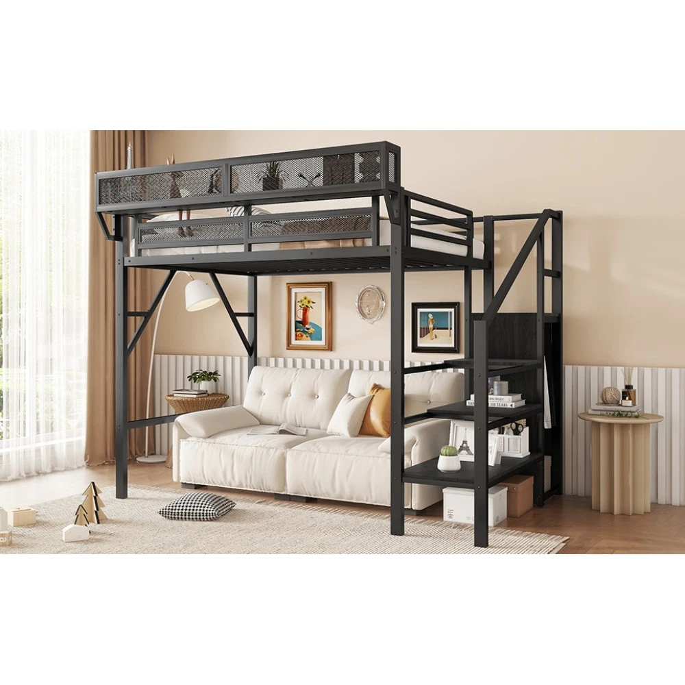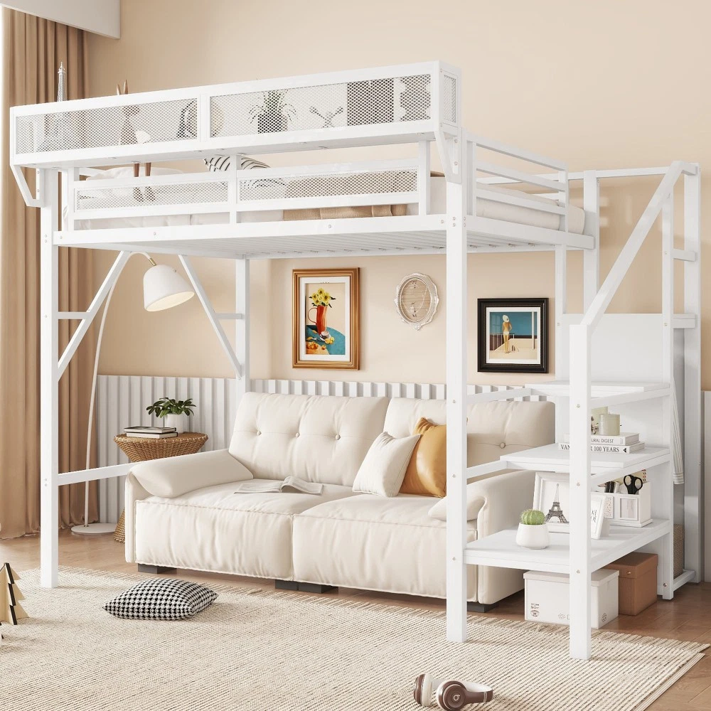 Twin Size Loft Bed Stairs Metal Twin Loft Bed with Storage Shelves High Loft Bed Features 【Twin Loft Bed with Storage Shelves for Upper】The twin metal loft bed features a storage shelf next to the upper bed, providing extra storage space. This shelf is perfect for keeping books, gadgets, or small items within easy reach. The shelf have mesh around which prevent thing falling down. It adds functionality without compromising space. 【Metal Twin Loft Bed with Staircase】The metal twin size loft bed come with staircase includes built-in storage compartments, making it easy to store items like shoes, toys, or blankets. The steps ensure safe and convenient access to the upper bed, enhancing both practicality and safety. The stairs can be installed on either right side or left side. 【Under Space of Metal Loft Bed】54.3 inch under the twin loft bed creates extra space for multi-functional use. You can place storage cabinets, a small sofa, or a desk underneath, maximizing the use of limited space and creating a versatile living area. 【Metal Loft Bed with Wardrobe】The staircase features a built-in wardrobe function, providing additional storage for clothes and accessories. This clever design adds more functionality to the metal full loft bed, making it a perfect solution for small bedrooms. 【Durable and Sturdy Construction】The twin size metal loft bed made from high-quality metal, this loft bed is durable and sturdy. The metal material ensures long-lasting use and stability, while also offering a sleek and modern look that fits well in any bedroom.Weight cap Descriptions Twin Size Loft Bed with Stairs, Metal Twin Loft Bed with Storage Shelves, High Loft Bed with This twin size loft bed features built-in storage shelves next to the upper bed. Come with staircase and wardrobe. The sturdy metal design ensures stability and durability, making your bedtime routine more organized and efficient. Specification Description & Dimensions Color: White Material: Metal Overall Dimensions: 94.3” x 47.8”x 73.4” (L x W x H) Size: Twin Size Height of Upper Guardrail: 11.3" Clearance Under the Bed 54.3" Recommended Mattress Thickness 6”(not included) Weight Capacity: 250LBS Net Weight: 125.4 lbs Gross Weight 136.84 lbs Box Spring Required No Country of Origin China