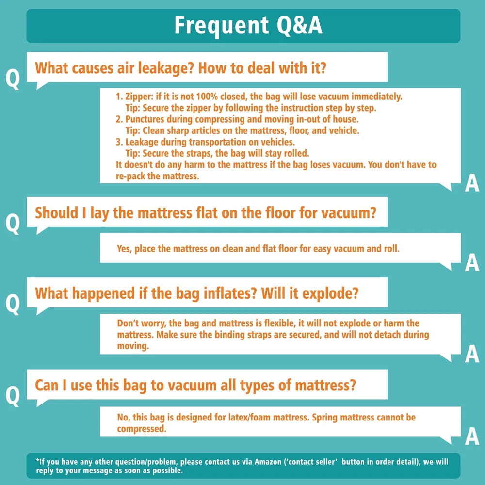 Twin Size Mattress Vacuum Bag for Memory Foam/Latex Mattress Upto 14 Inch, Moving Shipping and Storage, Waterproof and Airtight with 3 Adjustable Straps VACUUM MATTRESS BAG mattress vacuum bag compress the mattress by 80% . You can roll the compressed mattress up and fit in SUV. Any household vacuum cleaners are compatible DURABLE MATERIAL thick 7-layer materials are tear resistant and stronger than other brands. It protects your expensive mattress from water, dust and other damage. 【PERFECT FIT DIMENSION】Twin/Twin XL size mattress bags are designed for full or queen mattress with thickness up to 14 inches. 【DOUBLE SEALING】Double-seal zipper, stay-on clip and leak-proof triple valve ensure the mattress storage bag stay airtight for a longer time. SHIPPING Domestic Buyers - We have confidence in our products, but if you are not fully satisfied please contact us within 30 days of purchase and you will get full refund. - We ship within 3 business days of payment, usually sooner - We offer FREE shipping on all orders! - We only ship to the lower 48 states, no APO/FPO addresses or PO Boxes allowed International buyers – please note: Import duties, taxes, and charges aren't included in the item price or postage cost. These charges are the buyer's responsibility. - Please check with your country's customs office to determine what these additional costs will be prior to bidding or buying. * Order Cancellation Policy ** You can return a product for up to 30 days from the date you purchased it. 1. The seller reserves the right to cancel the special case only due to eBay cancellation fee. 2. The decision of seller is the final. 3. The seller will respond to the cancellation request within 2 business days. Please wait for the result of cancellation. 4. In case the cancellation is not completed by some reasons, the buyer can follow the options below to get the refund. 4.1 The buyer can reject the item when it arrives. 4.2 The buyer can send the item back to the seller within 30 days If the buyer receives item (USA Shipment ONLY). The seller will provide the FREE return label to the buyer when the buyer opens " Return Item" case on eBay by using the reason as "Change my mind" ONLY. 5. When buyer has placed the order. The order will be processed and completed by automatic warehouse system within 5 minutes. In case that buyer sends the cancellation request after 5 minutes of placing the order, the request will be rejected. **Sending direct message to cancel the order is not allowed for every case.* Return Policy For the return case - If buyer would like to return the items for refund or replacement, please CONTACT SELLER to receive the free return label from seller. The refund or replacement will be processed with the tracking number of return label which is provided by seller only. The other ways of return which are not approved by seller will not be processed for the refund or replacement.