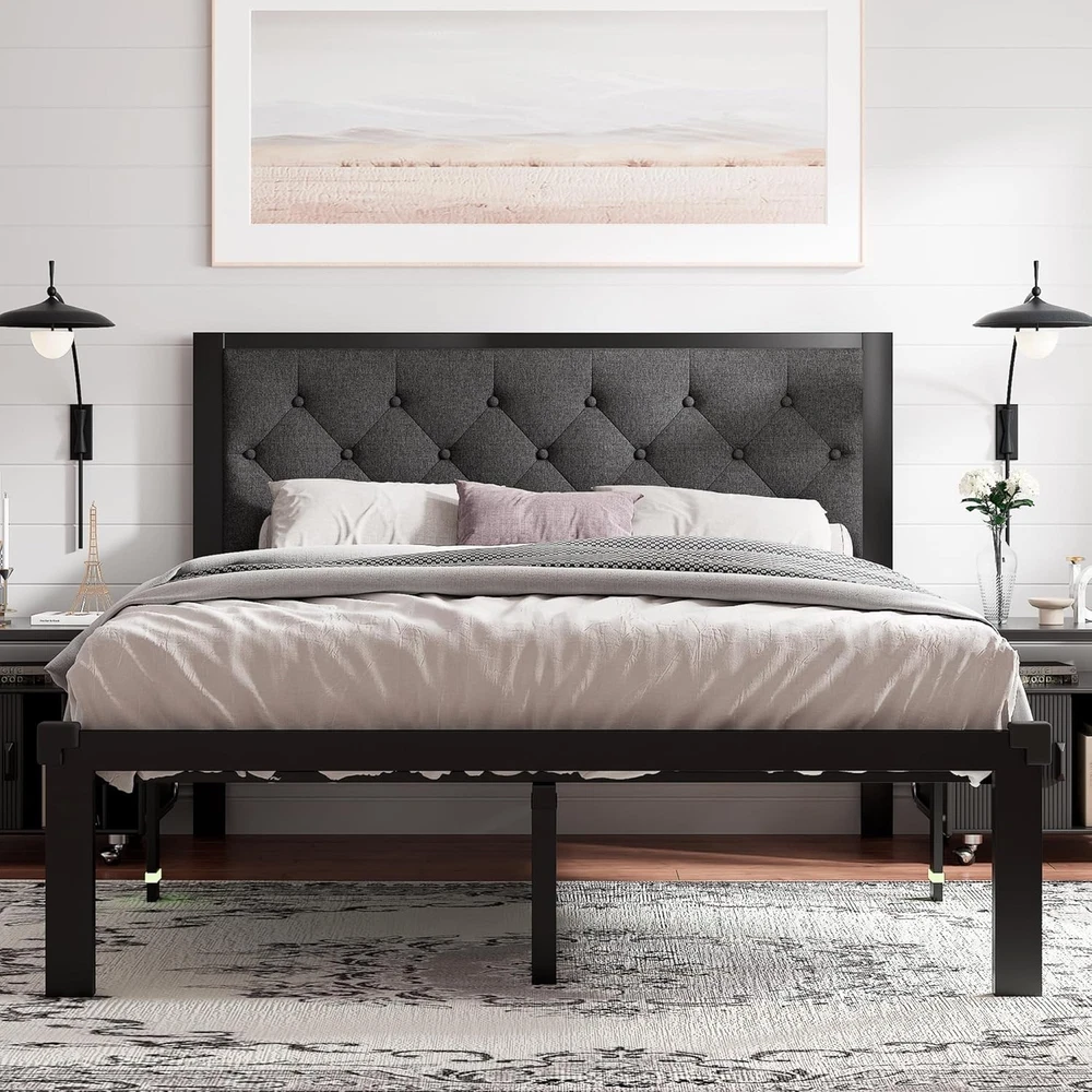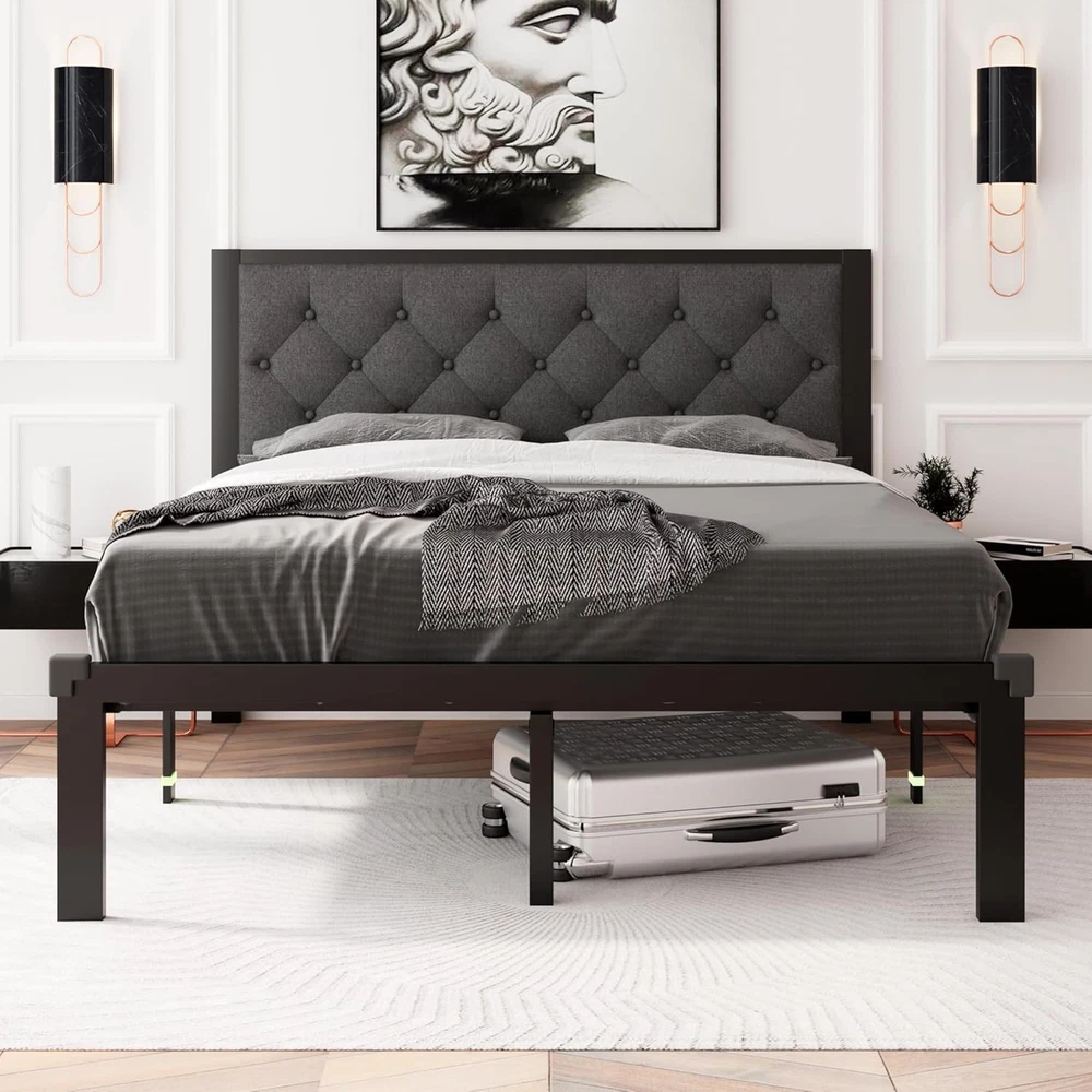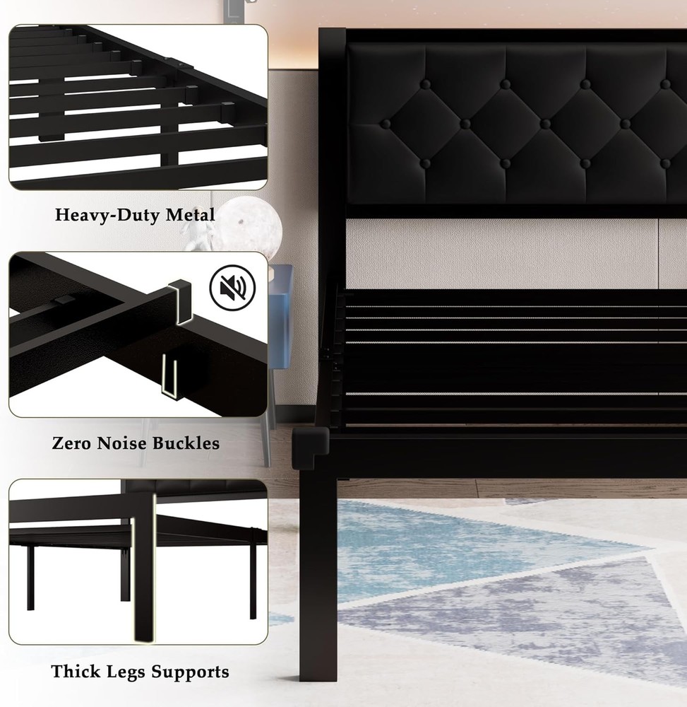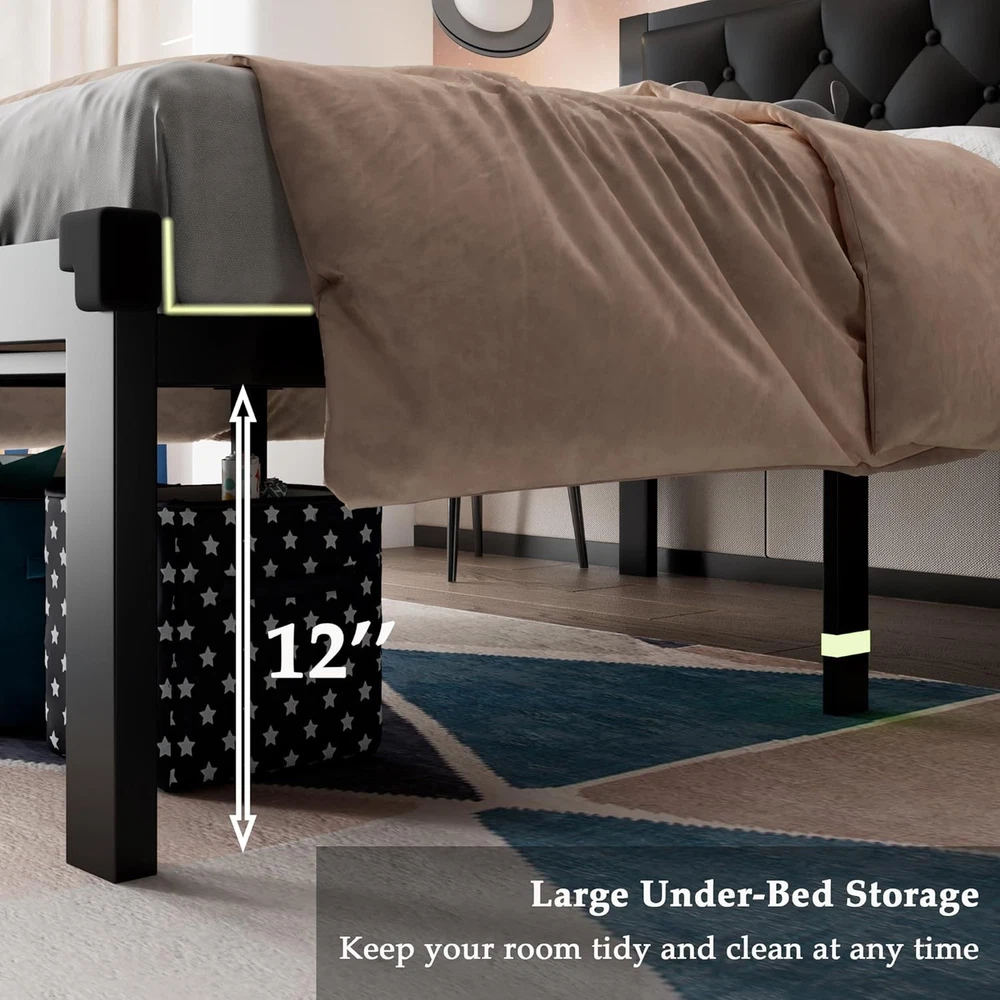 About this item Fluorescent strips help avoid stubbing toes and corner protectors protect children from injury Withstands up to 1000 lbs with thick legs, embedded design prevents mattress sagging or slipping 12-inch under-bed storage holds many items to keep room organized and tidy Built-in anti-noise shells create silent sleep environment without noise Easy 30-minute assembly with one-click buckle slats included in 1 box Faux leather headboard with retro diamond buttons matches metal frame › Size: Twin Material: Metal Product Dimensions: 77"L x 42"W x 40"H Style: Modern Special Feature: Heavy-Dutu Metal Frame, Premium Fabric, Soft Upholstered Headboard, Zero Noise