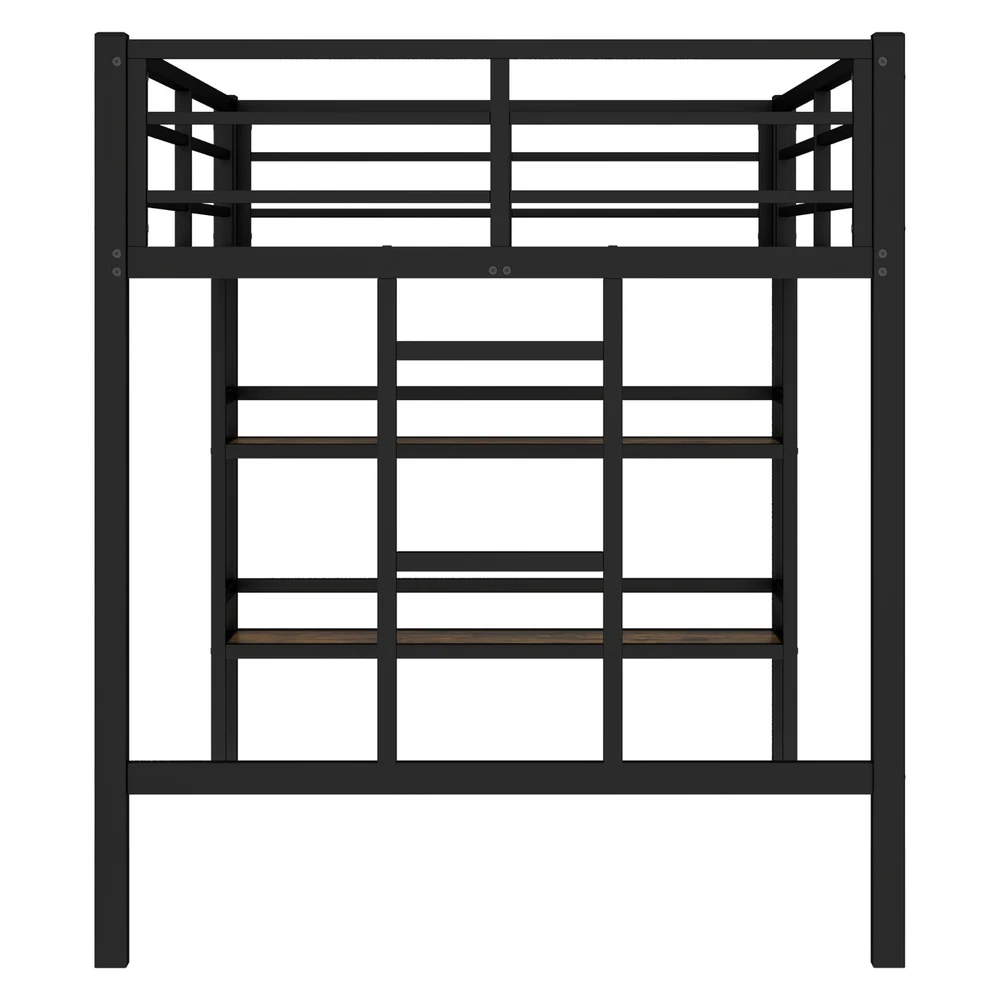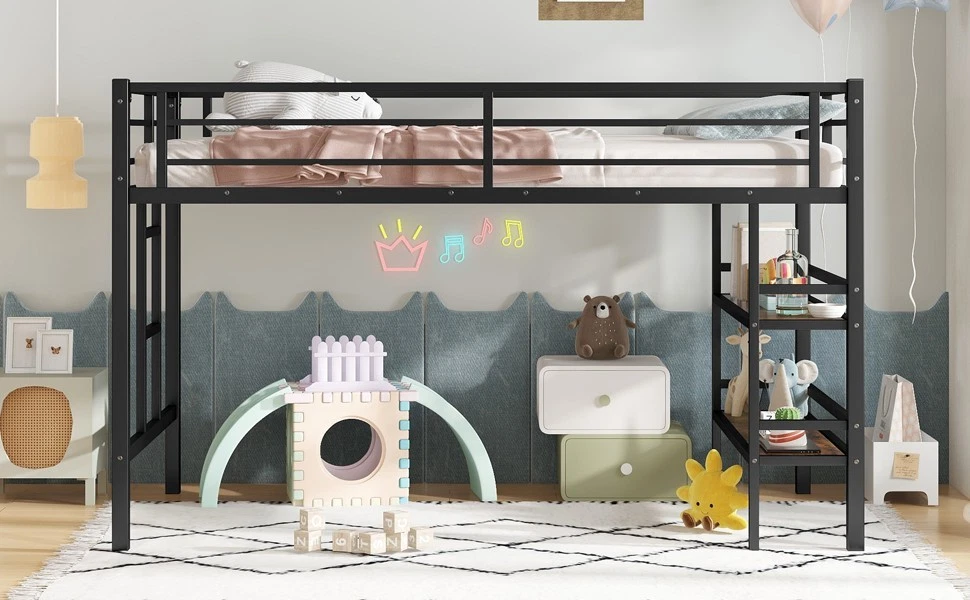 Product Feature Classic Metal Loft Bed Frame: Adopting a classic and minimalist design, adding a touch of elegance to your bedroom, suitable for any decoration style. The perfect metal loft bed for children, teenagers, boys, and girls. Classic Metal Loft Bed Frame: Adopting a classic and minimalist design, adding a touch of elegance to your bedroom, suitable for any decoration style. The perfect metal loft bed for children, teenagers, boys, and girls. Durable square tube frame: The sturdy square tube frame provides maximum support, with a total load capacity of 350 pounds, ensuring safety and stability, and ensuring good sleep. Safety Design: This loft bed is equipped with raised guardrails to prevent your child from falling and provide them with a peaceful sleep. Additionally, a convenient ladder and comfortable steps make it easy for children to climb up and down. Easy to Assemble All parts included in your package are indicated clearly. With step-by-step installation manual and pre-drilled holes, you can easily assemble this bed individually. Product Description Description This loft bed features a classic and minimalist design, making it the perfect furniture for your home. High quality materials ensure the bed is sturdy and durable, providing a good sleeping space for your child. Underneath the bed is a perfect storage space, providing a great place for children's toys and books. Weight & Dimensions Product Type Metal Loft Bed Color Black Size Twin Material Metal+MDF Overall Product Dimension 77.6”L*42.5’’W*49.3”H Overall Product Weight 67.24 LBS Bed Weight Capacity 350LBS Recommend Mattress Thickness 6'' Number of Package 1 Package Dimension & Weight Please refer to the Specification Level of Assembly Full Assembly Needed Eligible for Hardware Packs Yes Country of Origin China Note All the pictures are taken by actual samples, slight chromatic aberration may occur due to lighting or display.