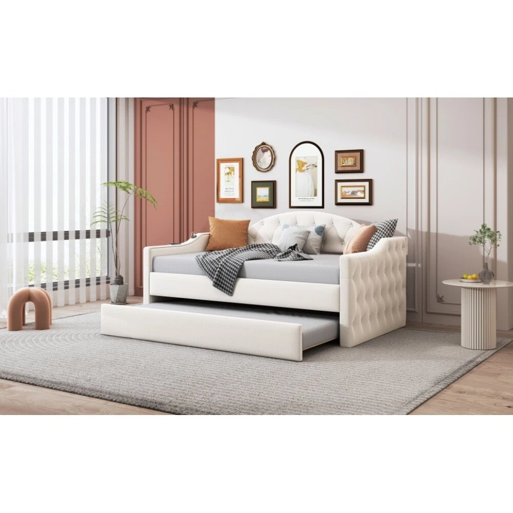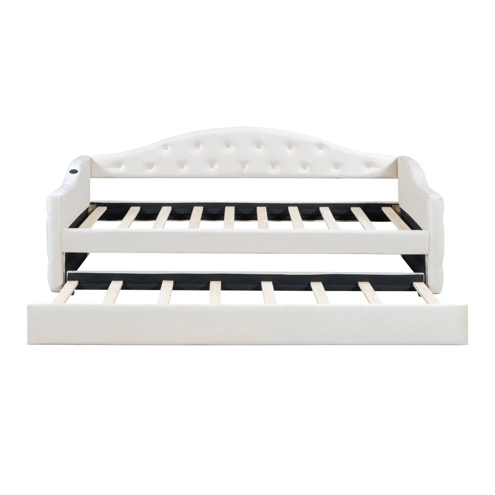 [Elegant design] This daybed features an elegant and generous design with tufted detailing, upholstered in luxurious velvet fabric. It comes with a backrest and two armrests. The backrest features a tufted design. With its stylish appearance and functional design, this daybed is an excellent addition to any modern living space. [Daybed Frame with Charging Station] This dual-purpose daybed accommodates two people comfortably, offering both seating and sleeping functionality. It is equipped with a charging station featuring USB&Type-C ports for added convenience. When you're lying on the daybed and your phone is running out of battery, you can conveniently charge it right away. [Maximized space] This daybed is designed with pull-out wheels, allowing for easy mobility and saving maximum space. It is perfect for accommodating overnight guests with its convenient and self-contained sleeping arrangement. Whether in a compact living room or a small guest room, this space-saving daybed offers comfort and functionality without compromising on style. [Solid Construction] Made of high-quality MDF, the frame of this bed is not easy to be affected by humidity change and lead to crack. The strong legs, wide boards and slats for bed and trundle,not only improve the weight capacity of the bed greatly but also ensure the stability. [Dimensions and Assembly] Overall Product Dimension: 80.2"L X 41.6"W X 33.2"H. Suitable for Twin size mattresses. Twin Size Tufted Upholstered Daybed with Trundle ,Velvet Sofabed with USB Charging Ports This daybed features an elegant and generous design with tufted detailing, upholstered in luxurious velvet fabric. It comes with a backrest and two armrests. The backrest features a tufted design. This dual-purpose daybed accommodates two people comfortably, offering both seating and sleeping functionality. It is equipped with a charging station featuring USB&Type-C ports for added convenience.With its stylish appearance and functional design, this daybed is an excellent addition to any modern living space.