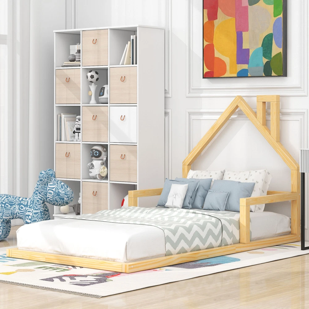 Crafted with house shaped headboard, this bed is a good choice for you to decorate the room with fun. This bed is designed with a clean silhouette and a of elegance. It suits all styles of home decoration and completes the look of any bedroom. ①[Sturdy Construction] Constructed of solid pine wood, this bed features a sturdy high-quality solid wood construction for durability and high load capacity, ensuring longevity. ②[Playful Design] A house-shaped headboard, complete with a chimney, adds interest to your room. ③[Simple and Modern] This bed is designed with a clean silhouette and a of elegance. ④[No Box Spring Required] The floor bed design doesn't need the spring box. ⑤[Easy Assembly] Each order comes with a clear and detailed assembly instruction guide and all necessary tools are provided to get your bed assembled in no. Description: Material:Pine Wood Size:Twin Color:Natural Numbers of Package:1 Spring Box:No need Assembly Required:Yes Dimensions: Overall Product Dimension:78''L x 41.7''W x 39.2''H Twin Bed:75'' x 39'' Total Height:39.2'' Recommend Mattress:6-8'' Thickness of Bed: Overall Product Weight:21lbs Bed Weight Capacity:250lbs [Sturdy Construction] Constructed of solid pine wood, this bed features a sturdy high-quality solid wood construction for durability and high load capacity, ensuring longevity. [Playful Design] A house-shaped headboard, complete with a chimney, adds interest to your room. [Simple and Modern] This bed is designed with a clean silhouette and a of elegance. [No Box Spring Required] The floor bed design doesn't need the spring box. [Easy Assembly] Each order comes with a clear and detailed assembly instruction guide and all necessary tools are provided to get your bed assembled in no.
