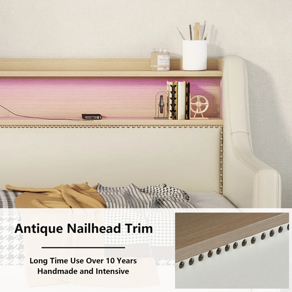 Twin Size Daybed w/ Drawers, Upholstered Bed w/ Charging Station and LED ,Beige Features Stylish and Elegant Design--Our daybed with drawer is made of PU leather. With high backrest which lying more comfortable, two armrests make your hands free. Bronze nail head trim make this twin daybed more stylish and classic. A timeless design concept combined with a thick padded back and four side foam filled makes our daybed stand out from ordinary bed frame and brings you a comfort experience and soft touch. Charging Station--The built-in power socket comes with 2 USB ports and 2 outlets, allowing you to easily charge your electronic device while relaxing your body and mind. LED RGB Light--The LED light with a remote control offers 16 static colors and speed adjust and brightness adjust provide personalized lighting atmosphere for your night. Choose the color you like and completely immerse yourself in the beautiful night time. Storage Headboard--The headboard storage provides you with an extra place to store magazines, phones, beloved photos and decorations which is very practical. 2 Storage Drawers--This twin size daybed frame come with 2 drawers with wheels offers ample space for off-season clothing, bed sheets, etc. keeping your bedroom organized & clutter-free. Durable Frame--Our daybed frame is made of solid MDF and plywood, with dense and strong support to withstand the weight of 330 lbs. Recommend mattress thickness max. 8 inch. This sturdy construction ensures that the frame is strong and the backrest will not wobble but also ensures lifetime usage. Description Description Upgrade your room with this simple and modern style, with bronze nailhead for decoration. 2 drawers for storage, with LED light and charging station which will look luxurious in your room. Description & Dimensions Overall Product Dimension 79.5"L x 45.3"W x 36.2"H Size Twin Color White Numbers of Package 2 Overall Product Weight 105.6LBS Weight Capacity 330LBS Mattress Thickness 8" Product Material Leather+MDF Box Spring Required No