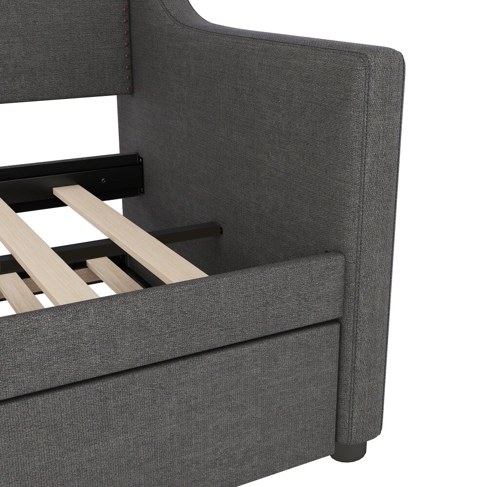 Twin Size Daybed w/ Trundle Bed, Upholstered Daybed w/ Charging Station and LED Features Stylish and Elegant Design--Our daybed with trundle is made of PU leather. With high backrest which lying more comfortable, two armrests make your hands free. Bronze nail head trim make this twin daybed more stylish and classic. A timeless design concept combined with a thick padded back and four side foam filled makes our daybed stand out from ordinary bed frame and brings you a comfort experience and soft touch. Charging Station--The built-in power socket comes with 2 USB ports and 2 outlets, allowing you to easily charge your electronic device while relaxing your body and mind. LED RGB Light--The LED light with a remote control offers 16 static colors and speed adjust and brightness adjust provide personalized lighting atmosphere for your night. Choose the color you like and completely immerse yourself in the beautiful night time. Storage Headboard--The headboard storage provides you with an extra place to store magazines, phones, beloved photos and decorations which is very practical. Space Saving Trundle: The daybed come with a twin trundle bed equipped with smooth casters, serves as an additional sleeping space for guests or sleepovers to maximize your room space. Durable Frame--Our daybed frame is made of solid MDF and plywood, with dense and strong support to withstand the weight of 330 lbs. This sturdy construction ensures that the frame is strong and the backrest will not wobble but also ensures lifetime usage. Description Description Upgrade your room with this simple and modern style, with bronze nailhead for decoration. A twin trundle bed, with LED light and charging station which will look luxurious in your room. Description & Dimensions Overall Product Dimension 79.5"L x 45.3"W x 37.4"H Size Twin Color Gray Numbers of Package 2 Overall Product Weight 119.05LBS Weight Capacity 330LBS Mattress Thickness 8 inch for daybed, 4-5 inch for trundle bed Product Material Linen Box Spring Required No