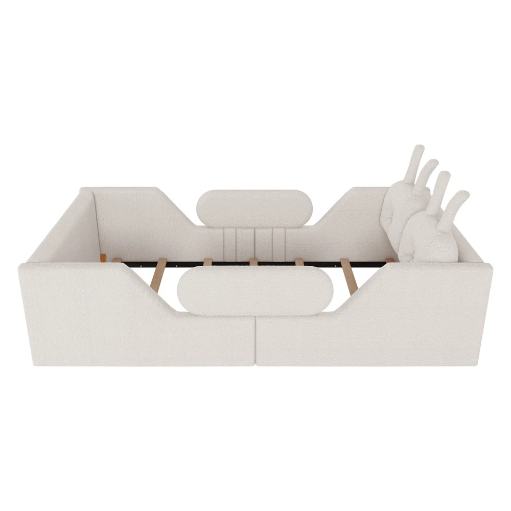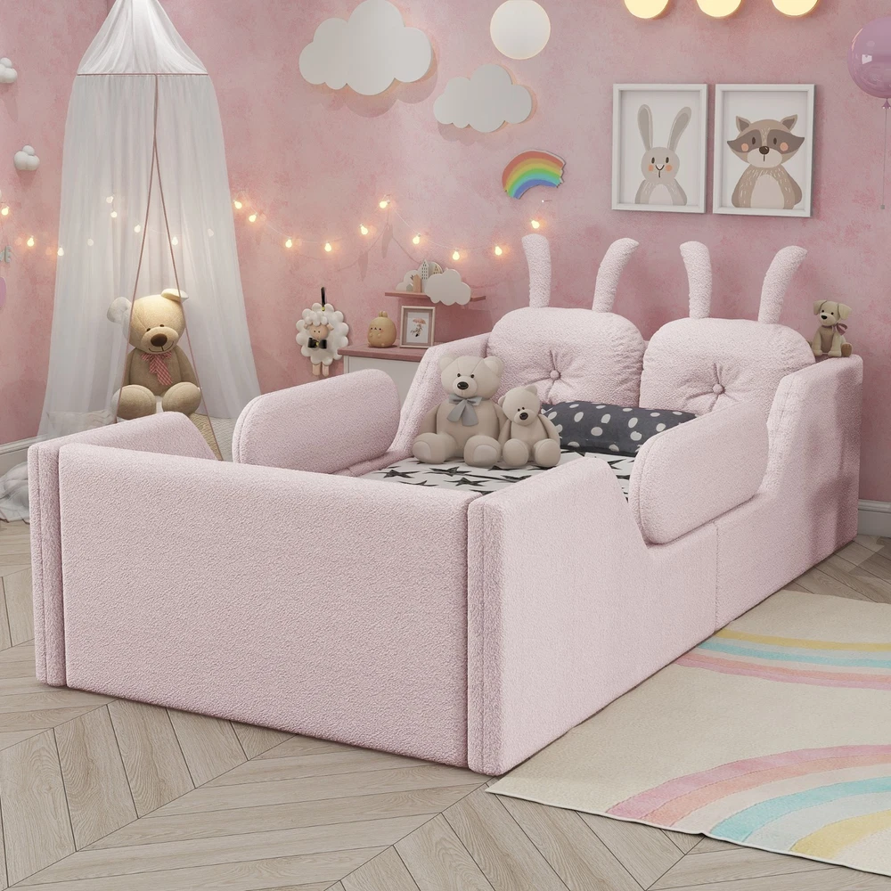 Product Feature [High Guardrails]-The 21” inch height of kids floor bed suitable for mattresses of various thicknesses to improve the safety of children's activities. Also eliminates the risk of any nasty falls and bumps, designed to create a safe space to roam and sleep for kids. [Whole Soft Design]-Kids floor bed is made from soft Teddy fabric and filled by high quality foam which get soft hand feeling and protect your kids away from hurt. [Removable Side Rails]-There are 2 small safety side rails come with this kids upholstered bed. The extra safety rails could avoid your kids fall down from bed during the time they are sleeping, more safety for little kids. And the rails can be removed if no need after growing up. [Rabbit Cushions]-Feature with 2 rabbit-shaped back cushions at headboard and fix with velcro. Can be removed for washing. The cushions is vacuum-packed. You just need to take off the packing and fluff in minutes. [No Need Box Spring]-No need box spring, height is deeper than most children’s beds so that you can choose 8 inch mattress. Instruction and tools included for easy assembly. Product Description Twin Size Upholstered Platform Bed with Rabbit Cushion 21 inch height for 8 inch thicker mattress, included the rabbit cushion make this bed more cute, and removable side rails for safety, teddy fabric with foam padding for soft feeling and avoid your kids from hurt. Description & Dimensions Color: White Material: Teddy Fabric Overall Dimensions: 78.5*43.11*21” (L x W x H) Size: Twin Recommended Mattress Thickness 8”(not included) Weight Capacity: 250LBS Net Weight: 97 lbs Gross Weight 105.6 lbs Box Spring Required No Country of Origin Vietnam