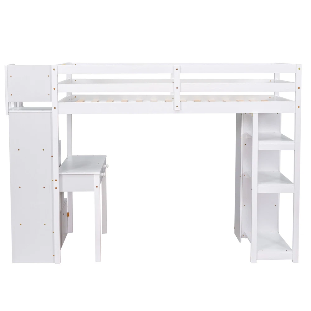 Brand Unbranded Type Bed frame UPC Does not apply Compatible Mattress Size Does not apply Color White Frame Material Solid Wood Twin size Loft Bed with Storage Drawers ,Desk and Stairs, Wooden Loft Bed with Shelves - White Twin size Loft Bed with Storage Drawers ,Desk and Stairs, Wooden Loft Bed with Shelves - White If your family needs a functional bed, then this loft bed will be a good choice for you, it will save you space and maximize functionality with multiple functions. This is the perfect study area while also having room to store your belongings. Beds with full rails ensure your sleep is safe. You don't have to worry about its quality. The bed has an elegant design that will fit nicely into your bedroom. Weight & Dimensions Overall Product Dimension 94.4"L x 41.8"W x 65"H Detail Product Dimension Please refer to the Size image Number of Package 3 Package Dimension Please refer to the Specification Overall Product Weight 248LBS Package Weight Please refer to the Specification Weight Capacity 300LBS Recommended Mattress Thickness 6" Recommended Age > 6 years old Specifications Product Type Loft Bed Size Twin Color Espresso/White/Gray Product material Plywood+MDF+Pinewood Number of slats 14 Level of Assembly Partial assembly Box Spring Required No Mattress Included No Estimated Time to Assemble 60 mins Suggested Number of People 2 Additional Tools Required All Tools Included Avoid power tools Yes Country of Origin Vietnam Notes Manual measurement has been used,there may be some reasonable error.Manual measurement has been used,there may be some reasonable error. v [Maximized space] It takes advantage of the floor space, and allows for a cozy rest, extra work and play space and makes a great piece of furniture for growing families.4 storage drawers, 1 desk as well as shelves, storage stairs, provide a lot of storage space v [Multifunctional bed] The space under the Twin loft bed is a great place for you to read, do homework or play, creating your own world of exploration. The storage space is strong, desk for study or work, and the stairs protect the safety of children. v [Solid Construction] This muti-functional loft bed is crafted from a solid pine wood frame, with commercial grade MDF board for quality control and durability. Guardrails are solidly attached for added safety. v [Health and Comfort] No box spring required, and without needing a foundation. The wood frame is sturdy and comes with slats for extra support and ensures air moves freely around your mattress to keep it fresh for years to come. v [Dimensions] : 94.4"L x 41.8"W x 65"H. Mattress not included. Some assembly is required, although we have provided clear instructions and tools. Item Specifics Brand Unbranded Type Bed frame Color White Frame Material Solid Wood Payment [ Policy: The above tab label style can be modified in left Basic - Footer Policy section. And this area is the details contents of your policies. You can add a banner for this policy as header and add text descriptions here. The text descriptions can be different Font Size, Font Color, Style and even graphics and icons are also accepted. ] Shipping [ Shipping: This is the contents of your Shipping. You can add a banner for this Shipping as header and add text descriptions here. The text descriptions can be different Font Size, Font Color, Style and even graphics and icons are also accepted. ] Returns [ Return: This is the contents of your Return. You can add a banner for this Return as header and add text descriptions here. The text descriptions can be different Font Size, Font Color, Style and even graphics and icons are also accepted. ] Contact Us [ Contact Us: This is the contents of your Contact Us. You can add a banner for this Contact Us as header and add text descriptions here. The text descriptions can be different Font Size, Font Color, Style and even graphics and icons are also accepted. ] DESCRIPTION PAYMENT SHIPPING RETURN POLICY CONTACT US Twin size Loft Bed with Storage Drawers ,Desk and Stairs, Wooden Loft Bed with Shelves - White Twin size Loft Bed with Storage Drawers ,Desk and Stairs, Wooden Loft Bed with Shelves - White If your family needs a functional bed, then this loft bed will be a good choice for you, it will save you space and maximize functionality with multiple functions. This is the perfect study area while also having room to store your belongings. Beds with full rails ensure your sleep is safe. You don't have to worry about its quality. The bed has an elegant design that will fit nicely into your bedroom. Weight & Dimensions Overall Product Dimension 94.4"L x 41.8"W x 65"H Detail Product Dimension Please refer to the Size image Number of Package 3 Package Dimension Please refer to the Specification Overall Product Weight 248LBS Package Weight Please refer to the Specification Weight Capacity 300LBS Recommended Mattress Thickness 6" Recommended Age > 6 years old Specifications Product Type Loft Bed Size Twin Color Espresso/White/Gray Product material Plywood+MDF+Pinewood Number of slats 14 Level of Assembly Partial assembly Box Spring Required No Mattress Included No Estimated Time to Assemble 60 mins Suggested Number of People 2 Additional Tools Required All Tools Included Avoid power tools Yes Country of Origin Vietnam Notes Manual measurement has been used,there may be some reasonable error.Manual measurement has been used,there may be some reasonable error. v [Maximized space] It takes advantage of the floor space, and allows for a cozy rest, extra work and play space and makes a great piece of furniture for growing families.4 storage drawers, 1 desk as well as shelves, storage stairs, provide a lot of storage space v [Multifunctional bed] The space under the Twin loft bed is a great place for you to read, do homework or play, creating your own world of exploration. The storage space is strong, desk for study or work, and the stairs protect the safety of children. v [Solid Construction] This muti-functional loft b