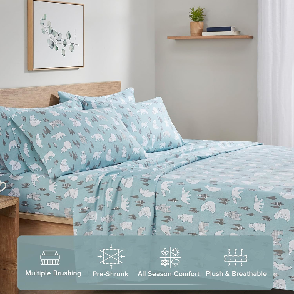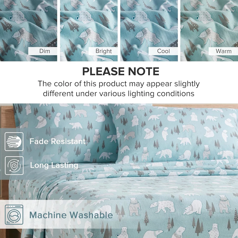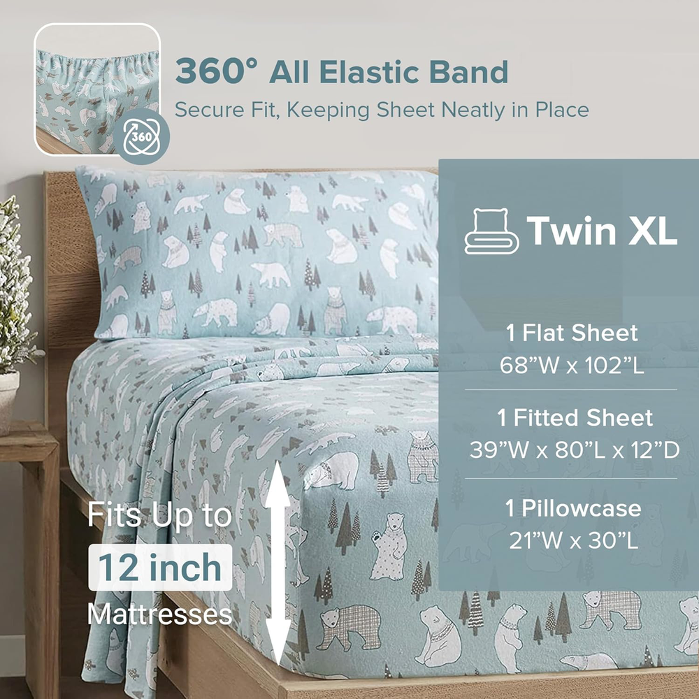 Twin XL Cotton Flannel Deep Pocket Sheets Set Blue Polar Bears 3 Piece