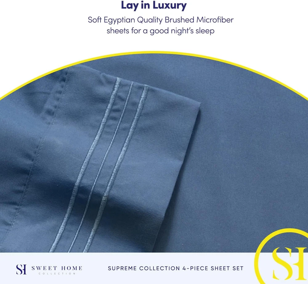Microfiber ELASTIC CORNERS BUILT IN - What separates our bed sheets from the rest are the special elastic sheet straps built in. These elastic corners keep your fitted sheet secure to the bed and come on all of our sheets. LAY IN LUXURY – No more sleepless nights on uncomfortably itchy sheets! Sleep soundly on the softest 1800 Supreme Collection sheets. Be warned, though: You may never be an early bird again! SUPERB SHEET SET – Each luxurious set has 1 fitted, 1 flat sheet, and 1 pillowcase (NOTE: All other sizes include 2 pillowcases). Deep pockets, thick elastic, and BUILT IN SHEET STRAPS make your new soft sheets stay in place! STAY CLEANER, LONGER – Who has time to wash their sheets every few nights? When it’s time for a wash, machine wash cold, and tumble dry low. PERFECT FIT FOR ANY BED – Sleep soundly for years to come! Your deep pocket sheets are fade, shrink, and wrinkle resistant. We’ve got you (and your bed) covered. Good rest comes cheap! Cheap sheets are usually itchy, uncomfortable, and the enemy of good sleep. Not Sweet Home Collection’s luxury sheet set, though! Our brushed microfiber 1800 thread count sheets are cooling, comfortable, and luxurious at an affordable price! No more dreading lying down on scratchy sheets. These soft luxury bed sheets promise rest and relaxation so you get the shuteye you need to start every day fully charged. No matter what you sleep on, we have the sheets for you! Ill-fitting sheets make for an unsatisfying night’s sleep. Whatever size your mattress is, Sweet Home Collection has the perfectly fitted sheet set for you! Our sheet sets come in twin, twin XL, full, queen, king, and California king sizes to give everyone in the family a good night’s rest. Here are the measurements for the different bed sizes: Twin Sheets Flat: 66”x96” Fitted: 39”x75” Twin Bedding XL Flat: 102”x66” Fitted: 80”x39” Bedding Sets Full Flat: 81”x96” Fitted: 54”x75” Queen Sheets Flat: 92”x102” Fitted: 60”x80” RV Short Queen Bedding Flat: 90”x99” Fitted: 60”x75” King Bedding Flat: 102”x105” Fitted: 78”x80” Split King Size Bedding Flat: 108”x102” Fitted: 80”x39” each California King Sheets Flat: 102”x108” Fitted: 72”x84” *All of our sets come with 2 pillow cases, except the bed linens twin size, which comes with one. The king linens come with 20”x40” king sized pillow cases, while the rest comes with standard size 20”x30”. Fitted sheets that fit your needs! Don’t buy sheets in colors that put you to sleep! Choose from 40 color choices with Sweet Home Collection’s sheet sets. Whether you need deep pocket queen sheets to go along with your white bedding for your clean and crisp bedroom, or you need pink girls bedding, find it all with Sweet Home Collection! Our colors include: beige, black, brown, burgundy, camel, gray, lavender, light blue, mint, mocha, navy, olive, pink, purple, red, royal blue, rust, sage, silver, strawberry pink, taupe, white, and yellow. Sleep satisfied! We want you to get the best night’s sleep and the best customer service. If you don’t love your sheets on the first night you sleep on them, let us know, and we’ll help to make things right. There’s no need to sleep on it! Add Sweet Home Collection’s 1800 Thread Count Collection bed sheets to your cart today! Sweet dreams!