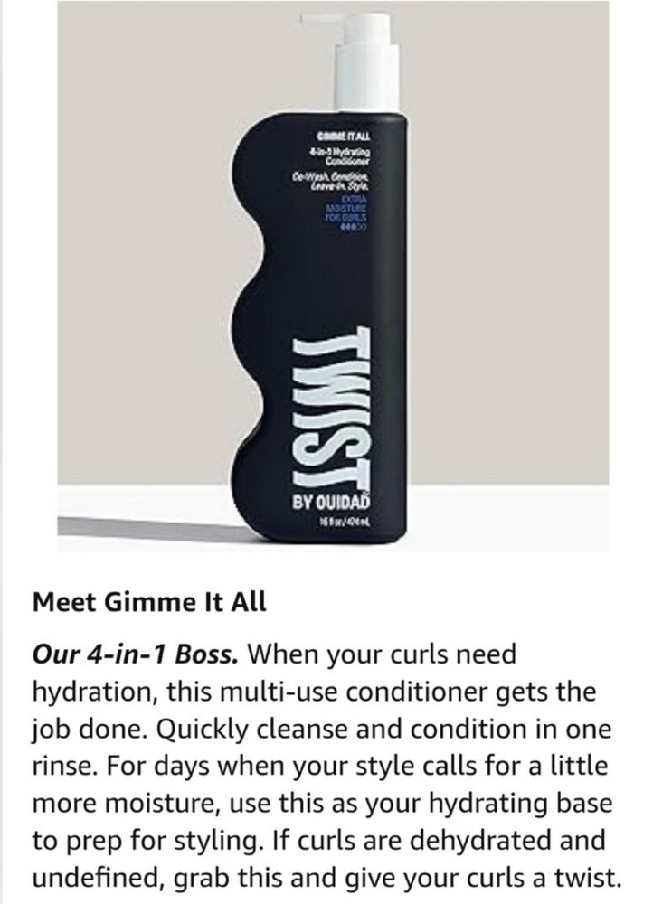 Twist By Ouidad 4 In 1 Gimme It All + Sunday Feels Deeply Hydrating Hair Mask.... ☆Twist By Ouidad Sunday Feels Deeply Hydrating Hair Mask 8.5oz BNIB. •Restore shine and improve your curl pattern. Transform dry, damaged, stretched out curls. •Lightweight moisture replenishes parched curls. •Contains - Shea Butter, Coconut Oil, Jojoba Oil, Almond Oil and Grapeseed Oil. •Safe for color and chemically treated hair. ☆Free from mineral oil, petrolatum, parabans, phthalates, harsh sulfates and D4, D5, and D6 silicones. ☆Twist-by Ouidad-Gimme It All- 4-in-1 Hydrating Conditioner-16 OZ. BNIB. •Co-wash It: Remove product build-up and rehydrate your curls with this go-to that gives a quick moisture boost without stripping away oils. •Defy Damage: Transform damaged curls and create a moisture-balanced foundation to prevent frizz. Run through wet or damp hair. Leave in and go. •Define Curls: Rock any look. Use this as a styling cream to define curls, create twist-outs, or shape super-soft, sculpted curls. •Detangle: To keep curls moisturized and tangle free, use as a conditioner. Safe for color and chemically treated hair. •When your curls need hydration, this multi-use conditioner gets the job done. Quickly cleanse and condition in one rinse. For days when your style calls for a little more moisture, use this as your hydrating base to prep for styling. If curls are dehydrated and undefined, grab this and give your curls a twist •Rice Protein enhances natural volume and helps to soften brittle or damaged hair. •Panthenol seals moisture in and protects against environmental aggressors. •Capuacu Butter adds luster and shine to curls.. BNIB #twistbyouidad #ouidad #gimmeitall #conditioner #Hydrating #cowash #Discontinued #sundayfeels #hairmask #ultrahydrating #nourishing #hairproducts #hair #curlyhair #dryhair