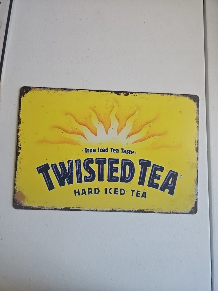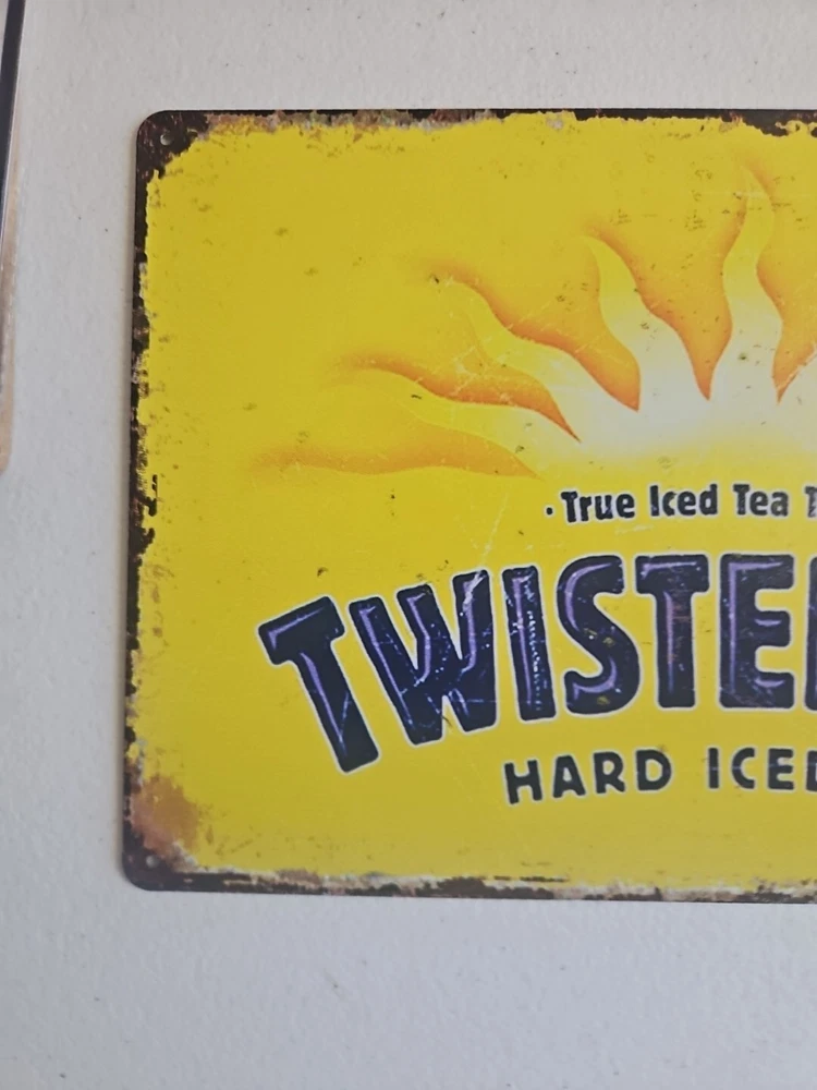 Add a rustic touch to your decor with this Twisted Tea metal sign. The 8x12 inch rectangle features a novelty pattern and a rusted look, making it perfect for any room. The sign can be hung or mounted on the wall, and it comes with all the necessary parts for easy installation. The sign is made of high-quality metal and has a decorative finish that adds to its charm. Its medium size and horizontal orientation make it a great addition to any bar or club-themed space. Get your hands on this unique and stylish sign today!